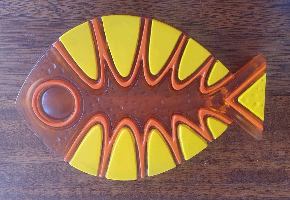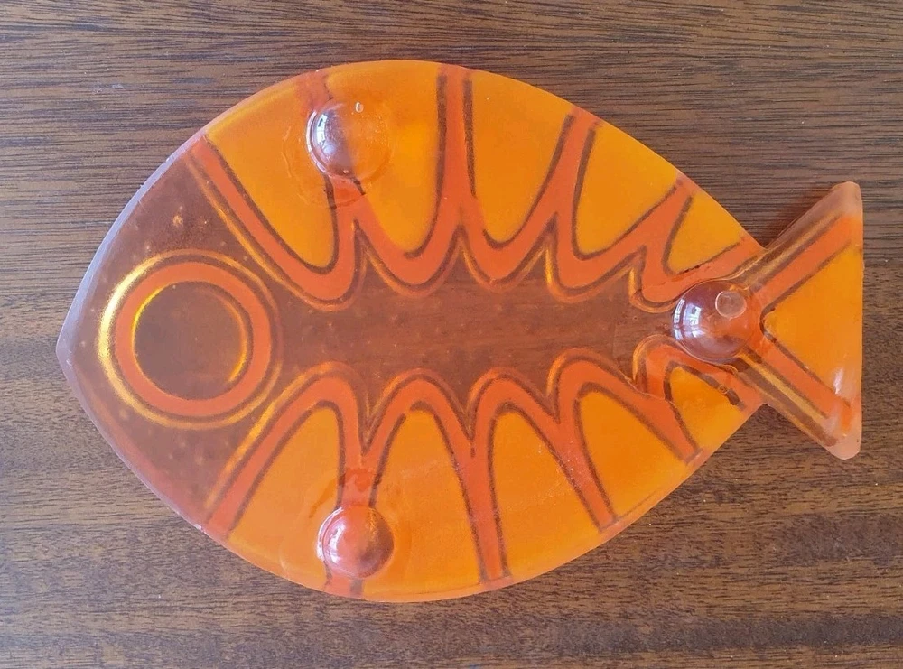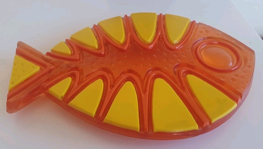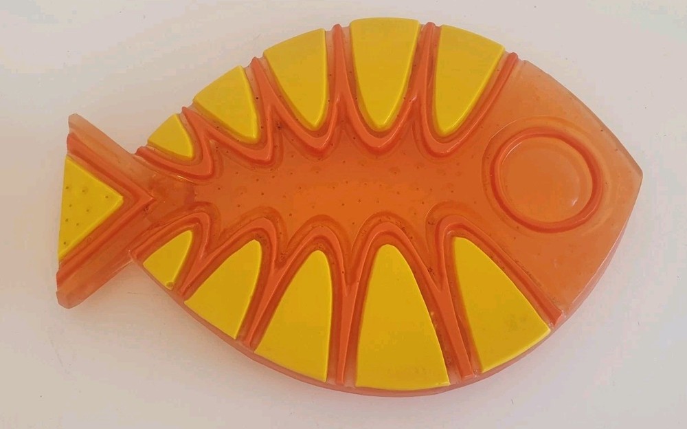 1969 Colorflo Lucite Fish Trivet. The trivet measures 19.8cm by 13.5cm. It is in good condition....