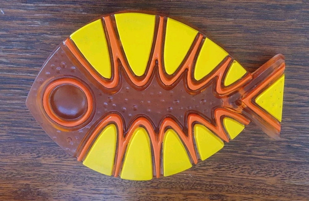 1969 Colorflo Lucite Fish Trivet. The trivet measures 19.8cm by 13.5cm. It is in good condition.