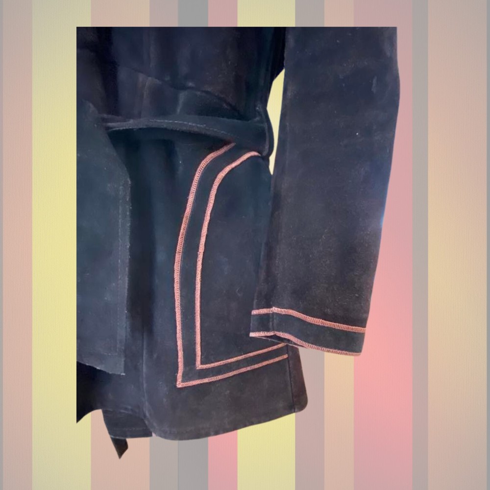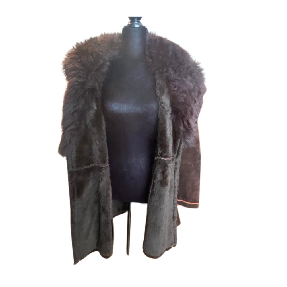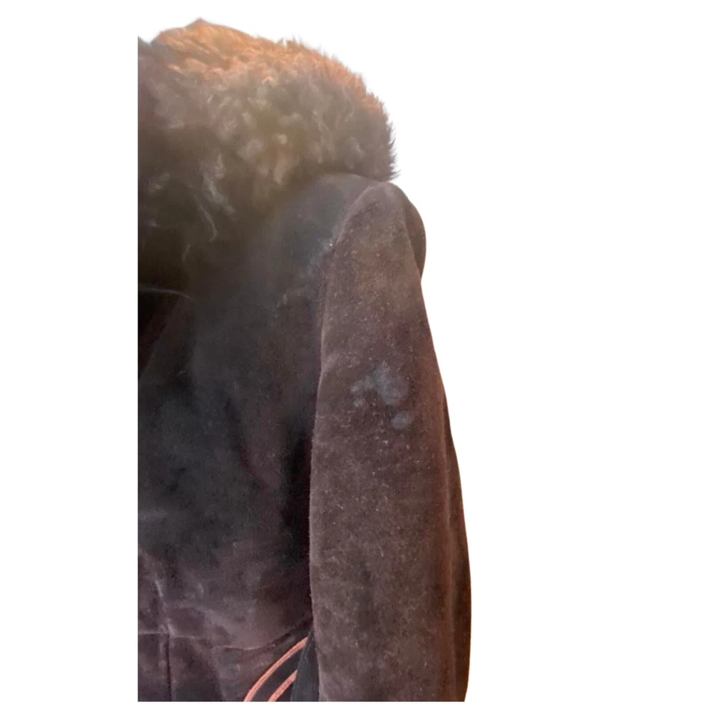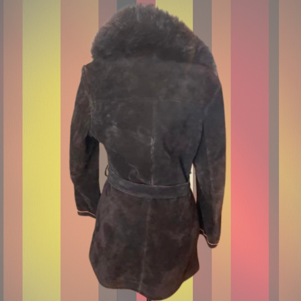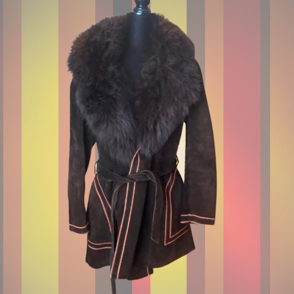 Vintage Mid Century 1970s Suede Leather Fur Collar Cuffs Longer Coat. Gorgeous!!!! vintage size s/m Huge Fur Collar and Cuffs (faux) Genuine Brown Suede leather Beautiful Orange piping stitching open front pockets tie belt (no closure other than belt) Length 30.5 in Sleeve length 23 in arm pit to arm pit 18.5 The epidemy of the 70's Beautiful condition except, the left shoulder and left sleeve has some spots, however, the coat has not been cleaned since in my possession . indicated in photos