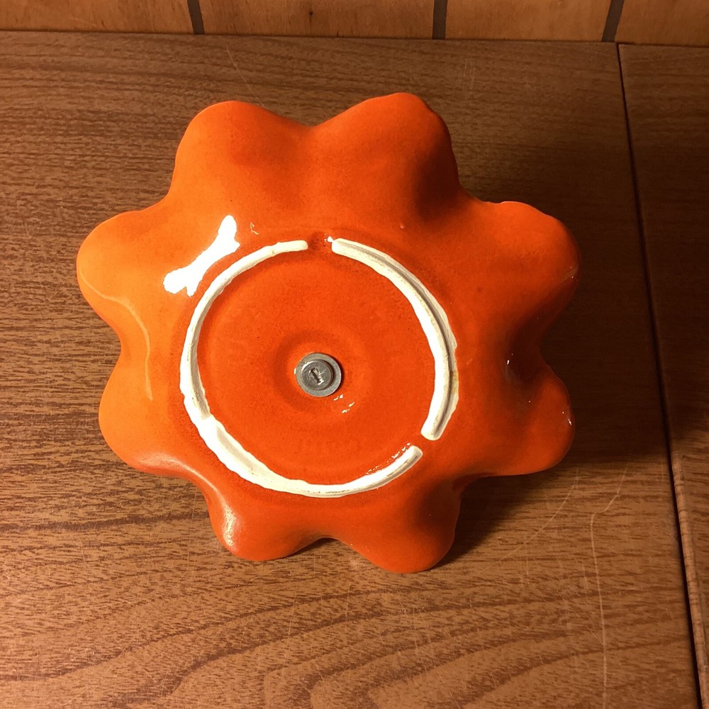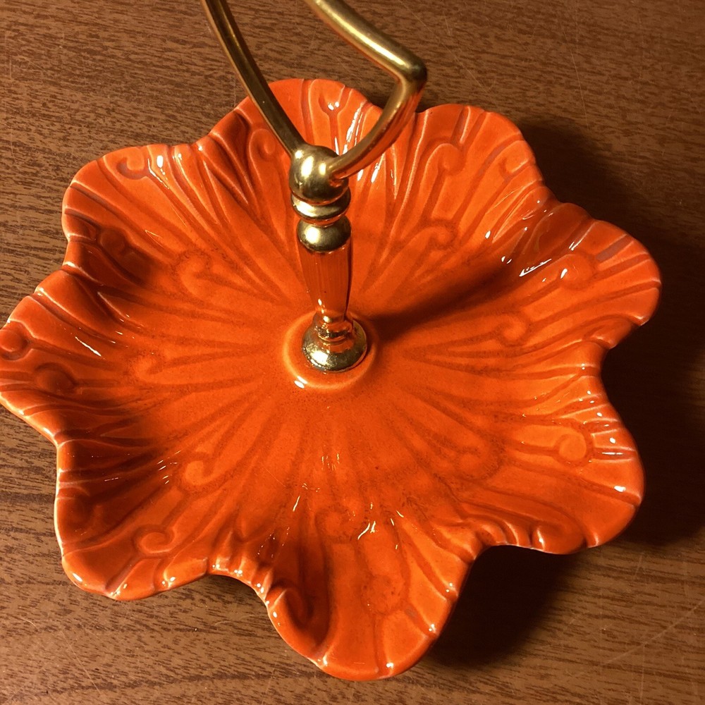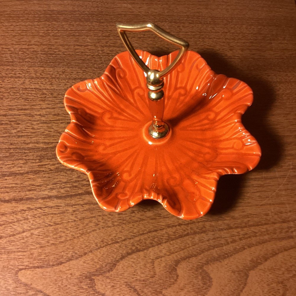 This vintage mid century snack stand is a perfect addition to your collection. With a sleek modern design and vibrant orange color, it's sure to catch the eye of any guest. Measuring 7 inches by 5 inches, it's the perfect size for displaying desserts or snacks. This item was manufactured in Japan during the 1960s and falls under the categories of collectibles and vintage, retro, mid-century. The object type of this dessert stand tray is specifically for appetizers. Don't miss out on the opportunity to add this unique piece to your collection. See pictures for more details. Measures: 7. 1/2” x 5 1/2” Part of family estate sale. Pet and smoke free home.