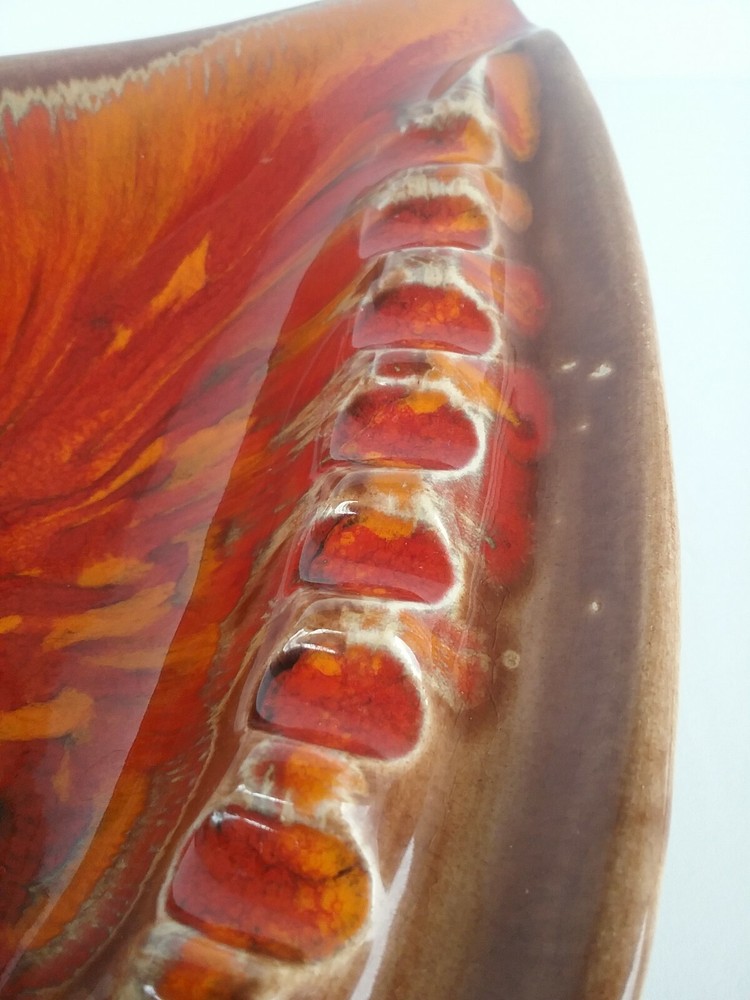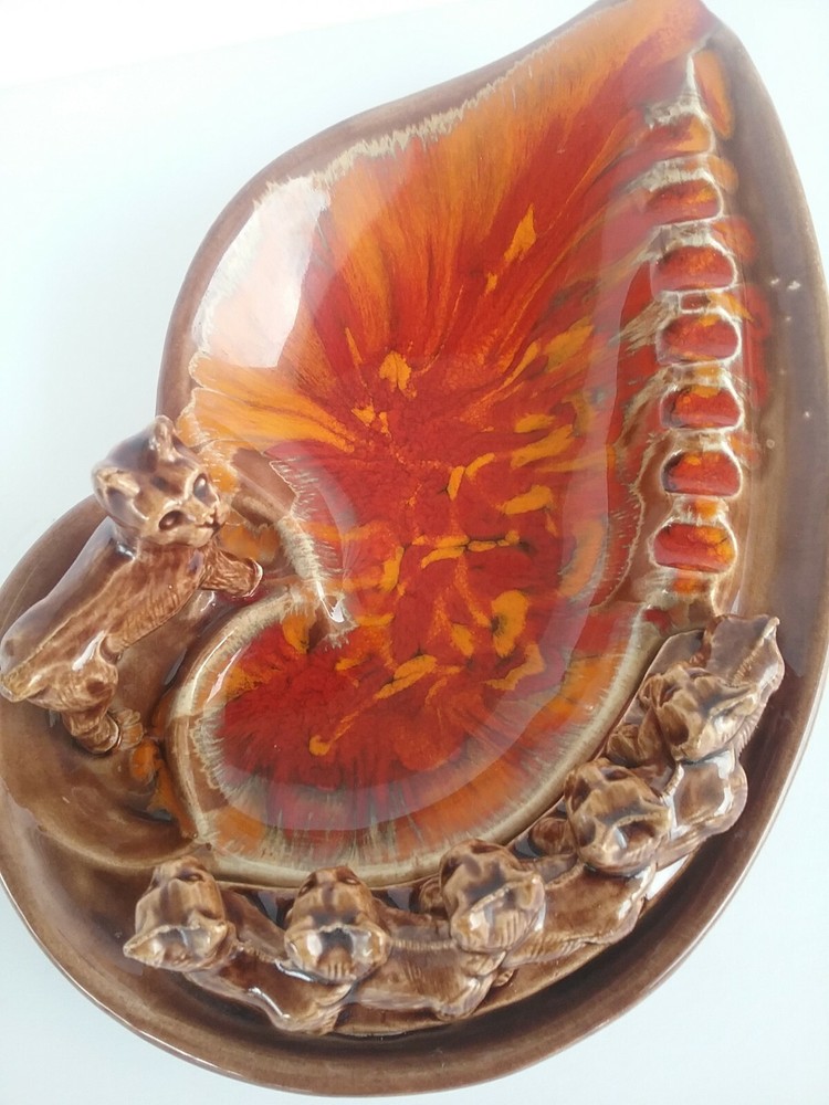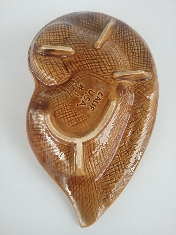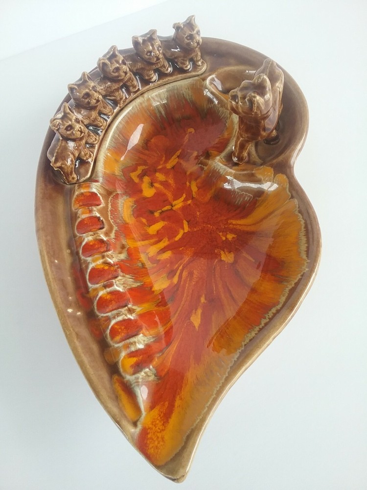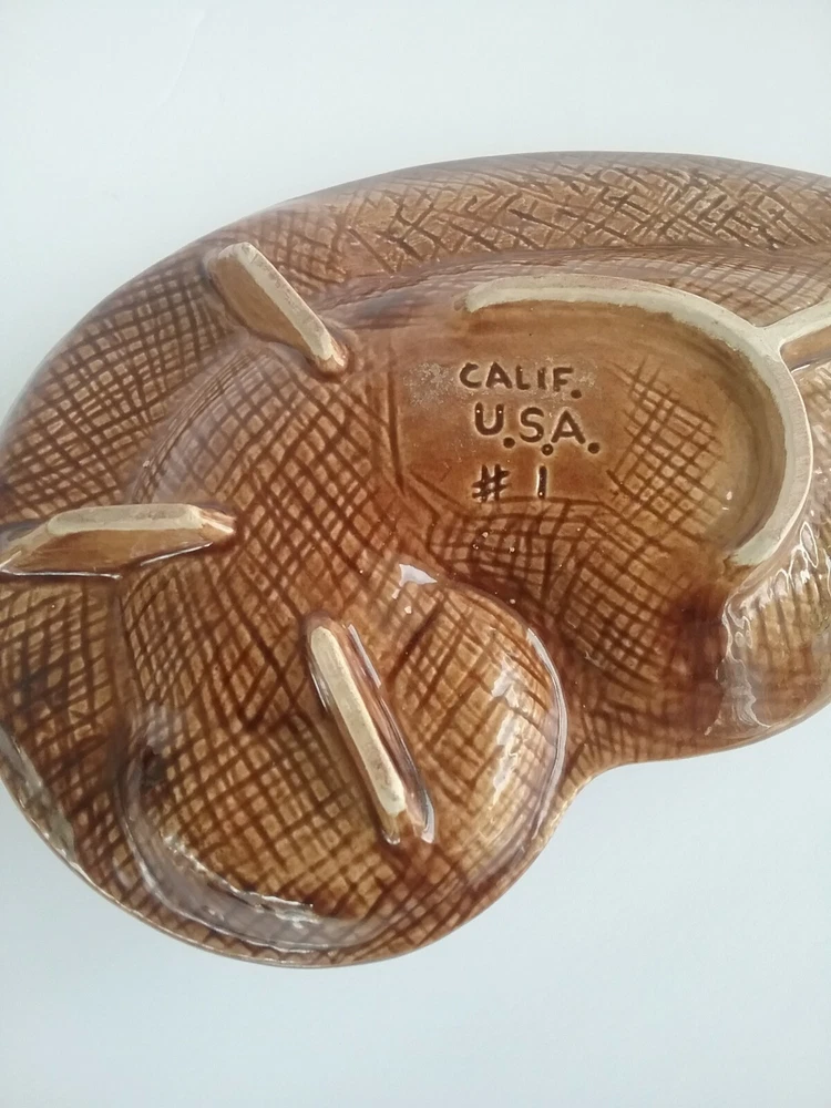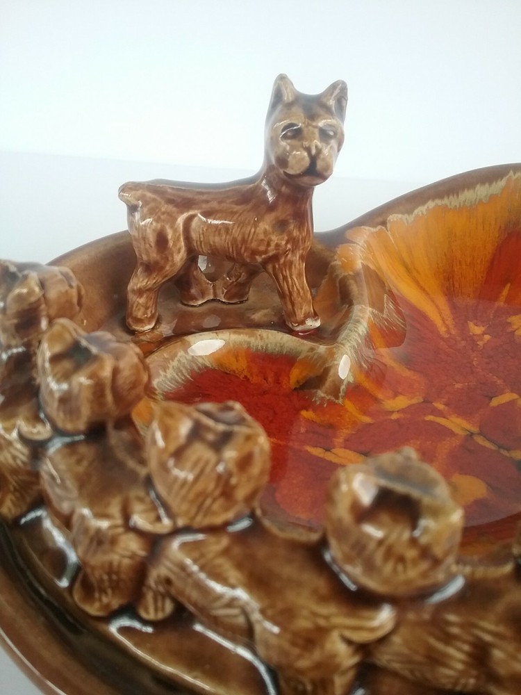 Selling a vintage Mid century Ashtray. This is marked Calif. USA #1 on the bottom. Slight crazing noted. There are 4 small spots where the glaze is missing. Momma dog and her 5 puppies. colors are bright. Measures 10 " by 6 ".