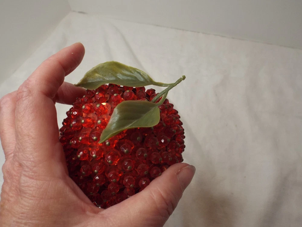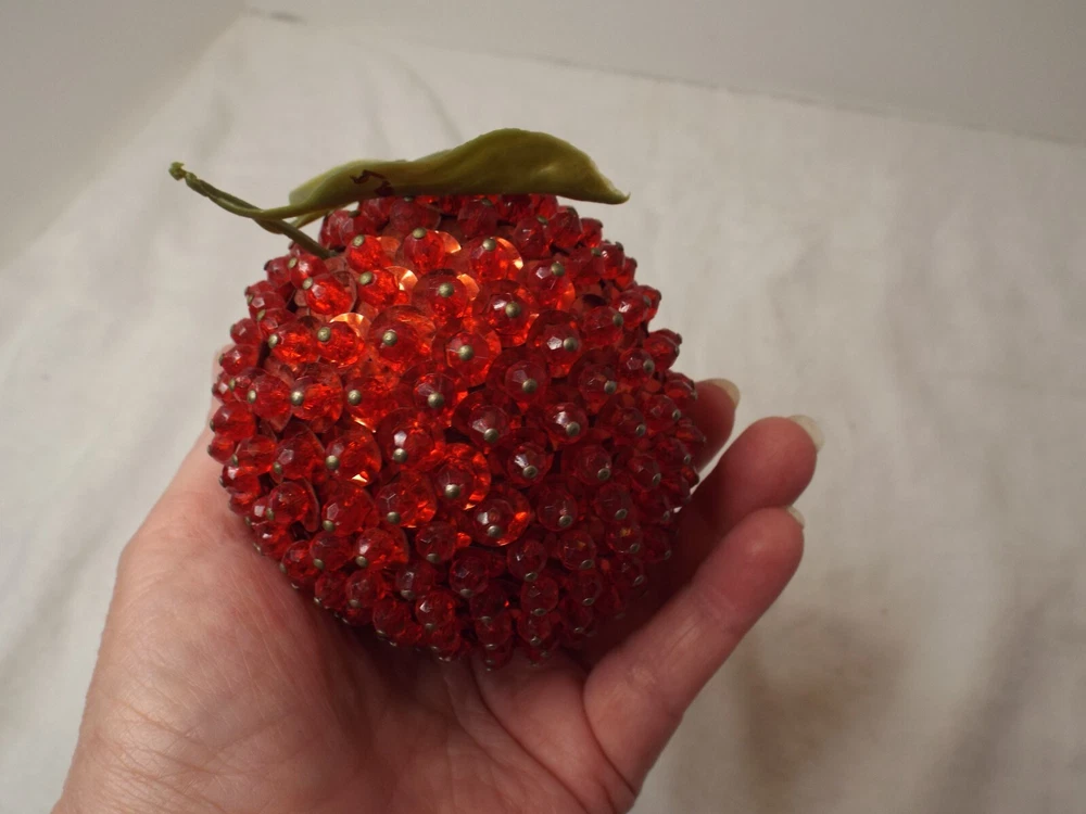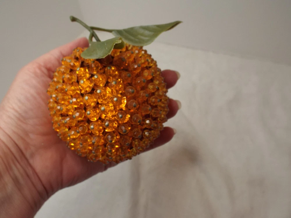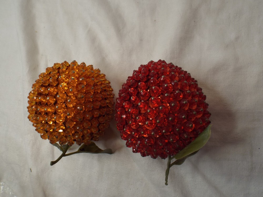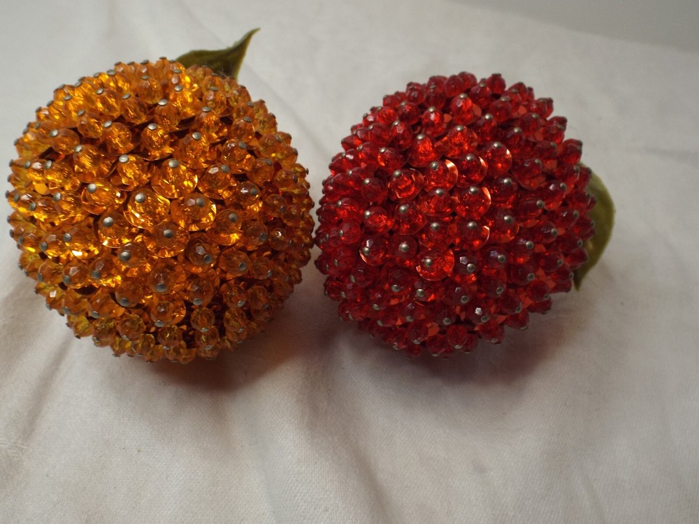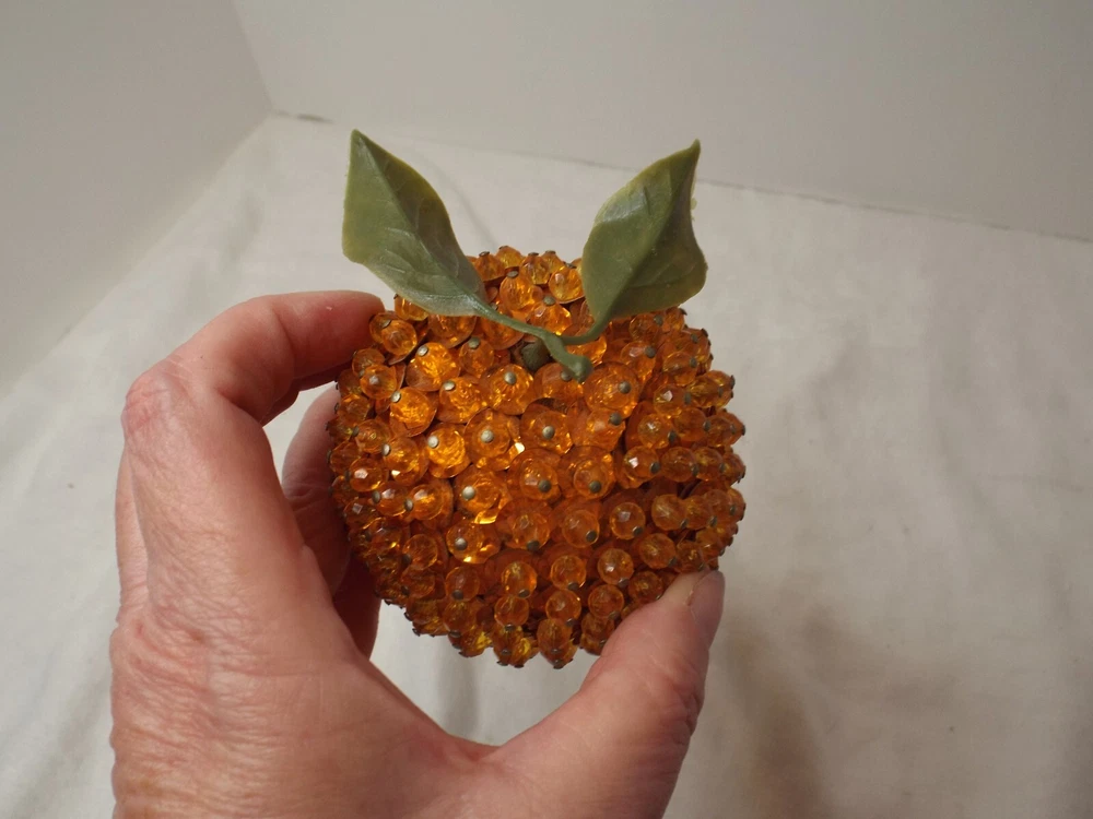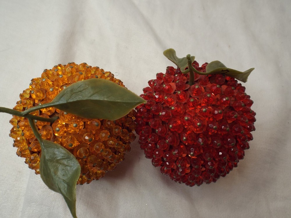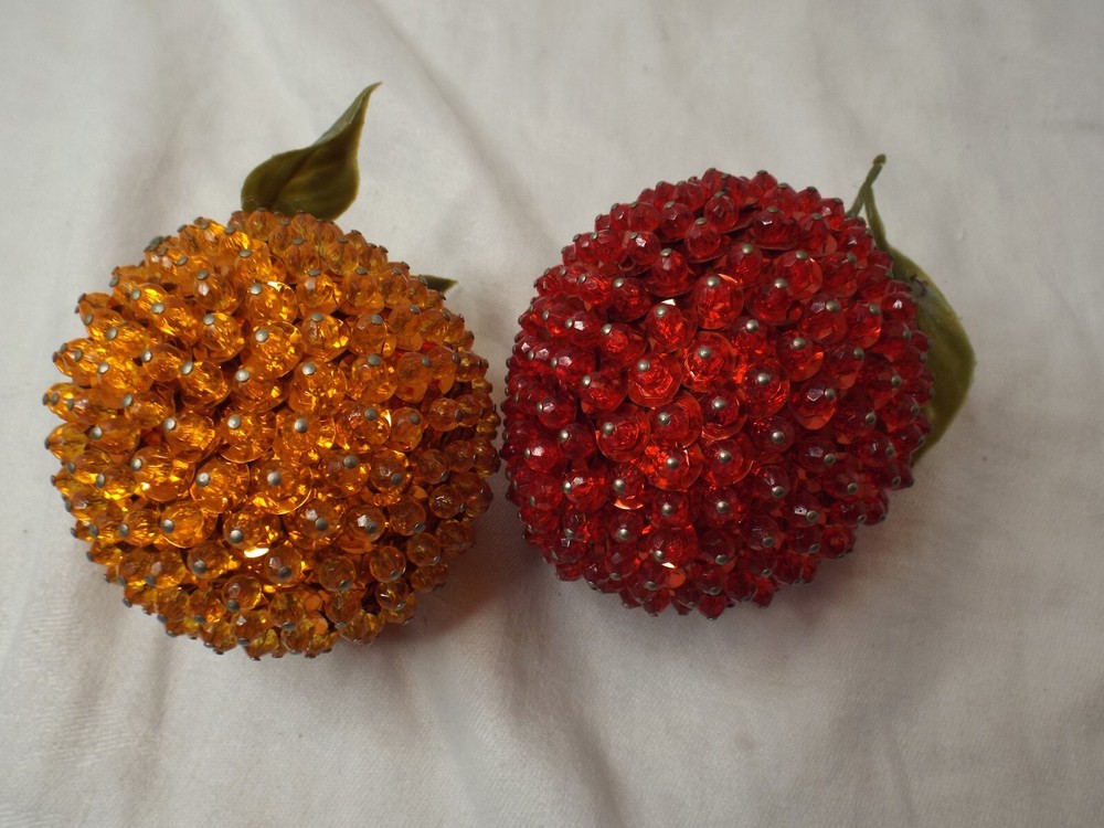 These are two vintage mid-century probably hand crafted beaded fruit. They are adorned with plastic faceted beads that are fastened with silver straight pins to plastic fruit for a cute and classic design that is straight out of the 1960's. These are an apple with red facted beads and an orange with a golden orange colored faceted bead all over. Both have their original plastic leaves still attached. Great decor for a table especially around the holidays to add a little bling to a floral or vegetable and fruit display. They are in great condition for their age. I did not see any missing, cracked or broken beads on them. Happy Shopping!