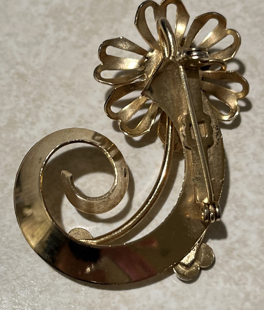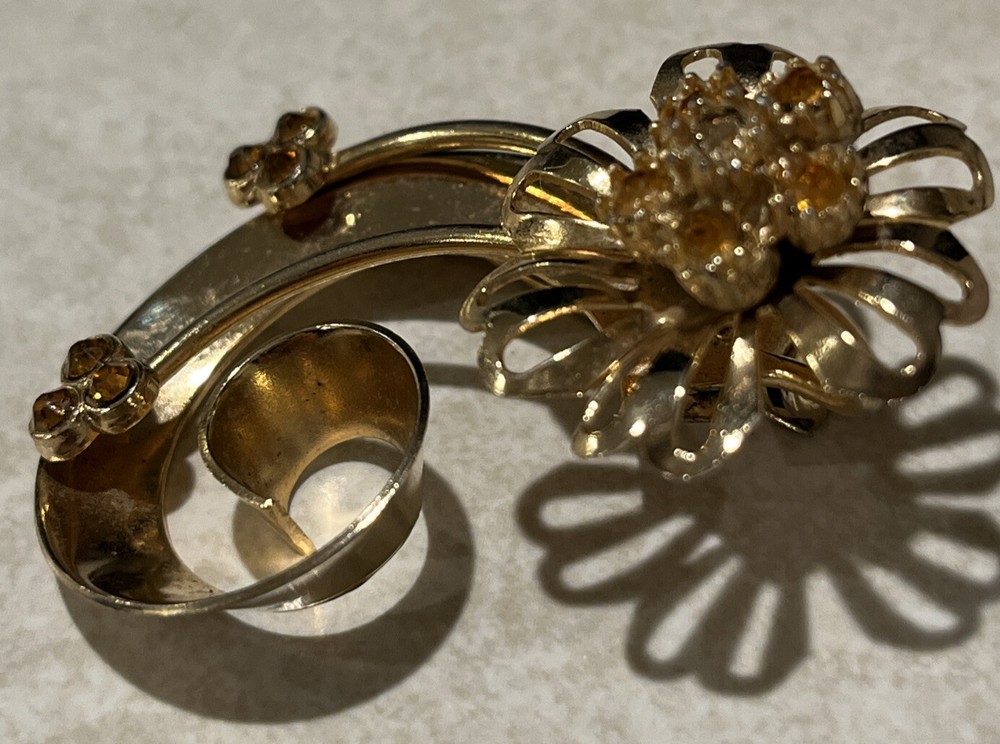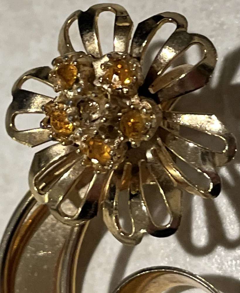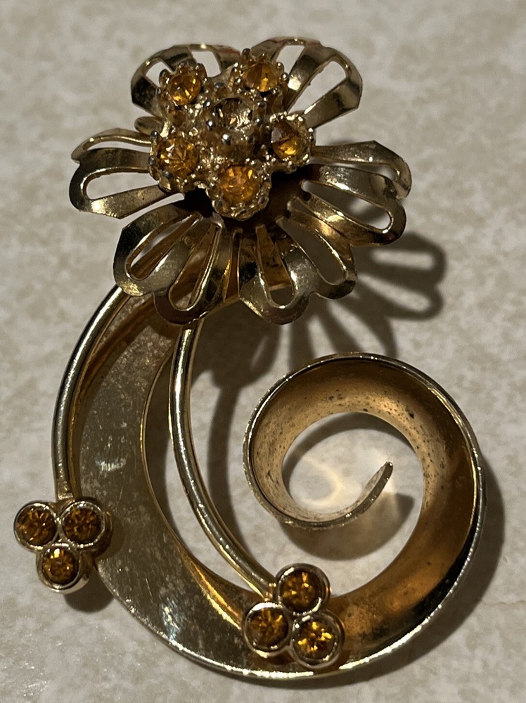 Vintage Mid Century Brooch Un Signed Orange Golden Rhinestones On Goldtone Metal.