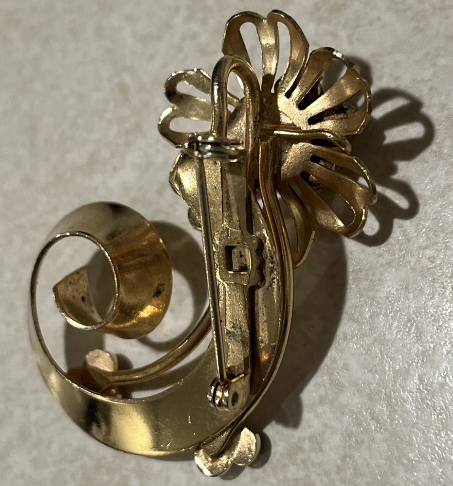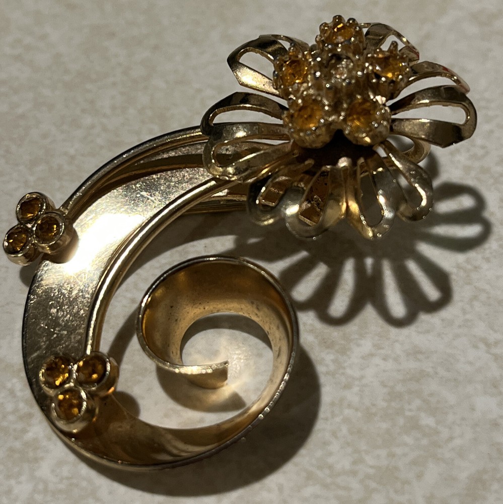 Vintage Mid Century Brooch Un Signed Orange Golden Rhinestones On Goldtone Metal....