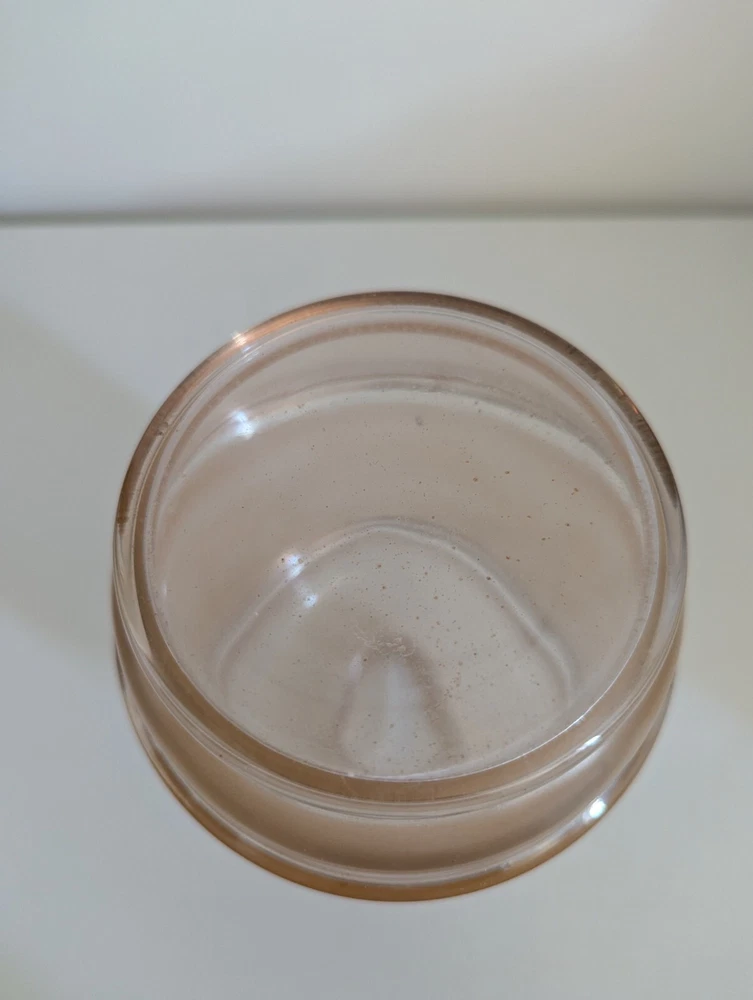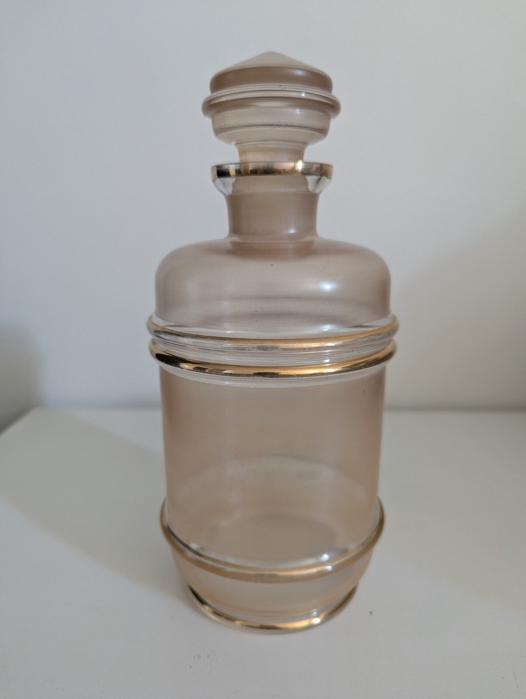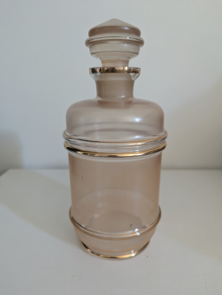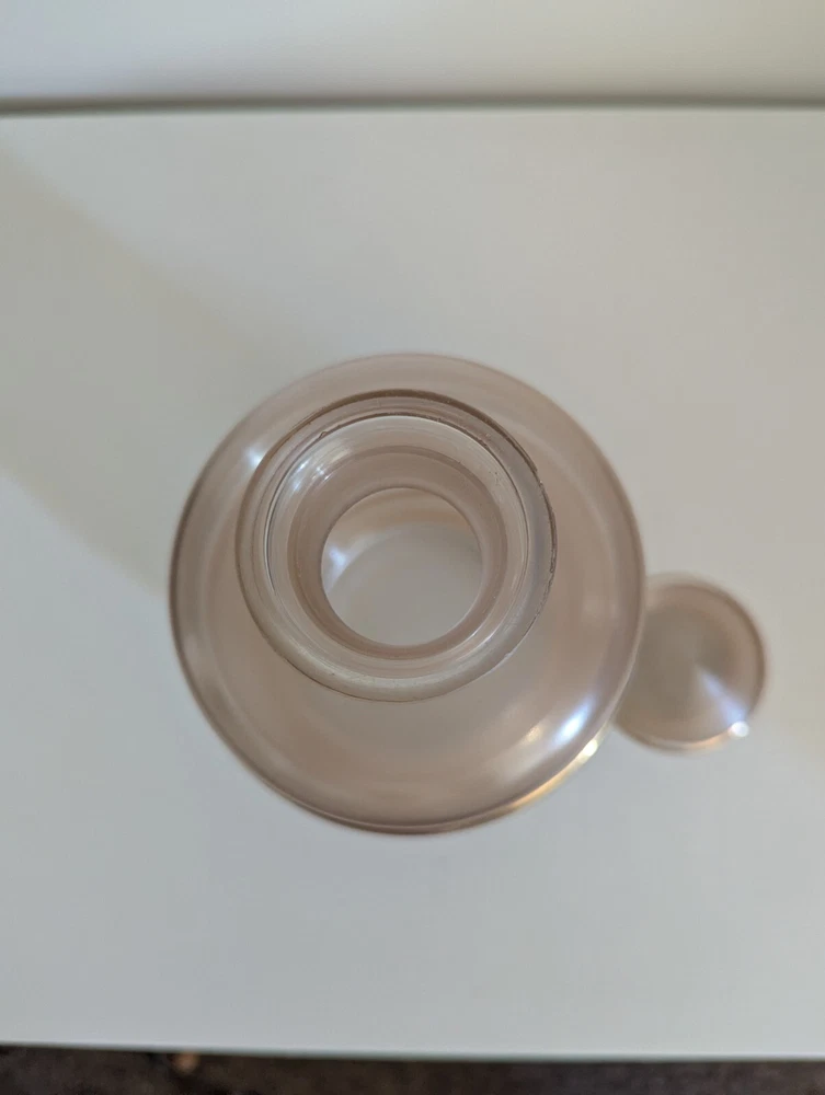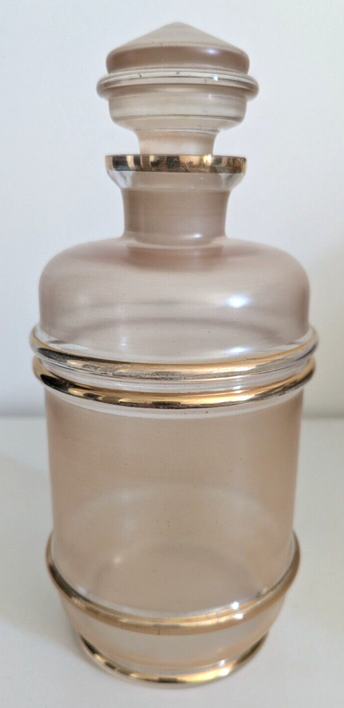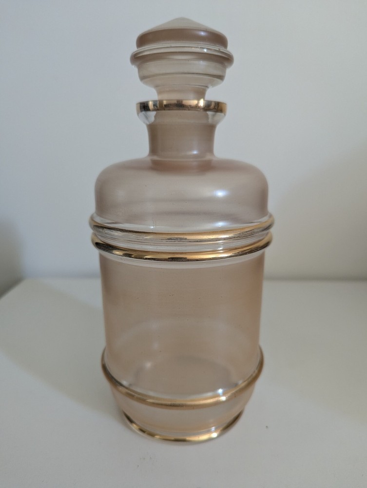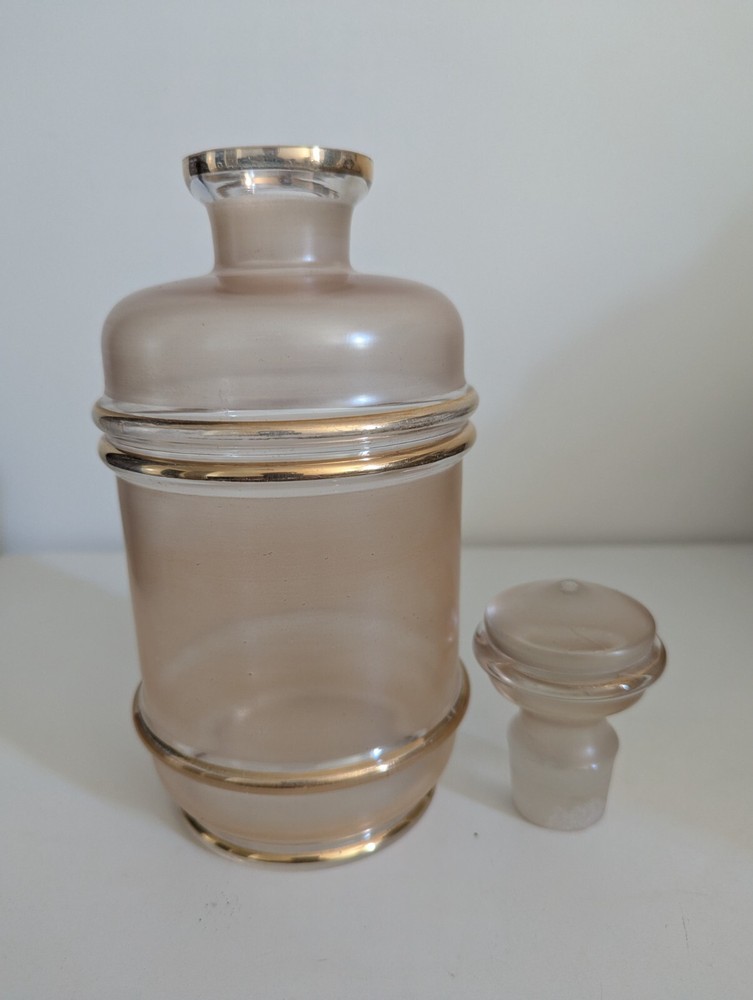 Elevate your barware collection with this vintage mid-century carafe decanter, a stunning piece that combines the timeless elegance of glass with a playful pink and orange hue. The decanter is complemented by a matching lid/stopper, ensuring your beverages stay fresh and aromatic. Crafted from high-quality glass, this decanter is not only a visually striking addition to your table but also a practical one. Its vibrant colour and gold accents add a touch of retro charm to any setting, making it perfect for those who appreciate the sophistication of yesteryears. Whether you're serving cocktails or simply displaying it as a decorative item, this piece is sure to be a conversation starter. 24cm Tall (inc Stopper) Some of the gold is wearing off, a small ship on rim and stopper