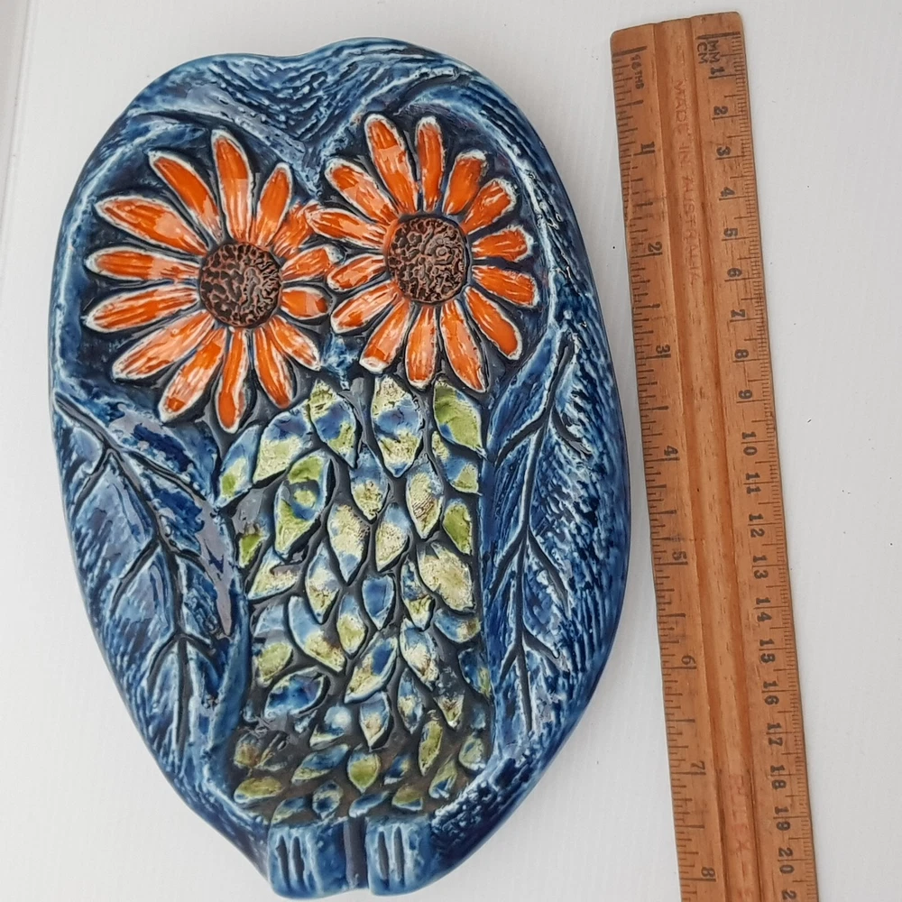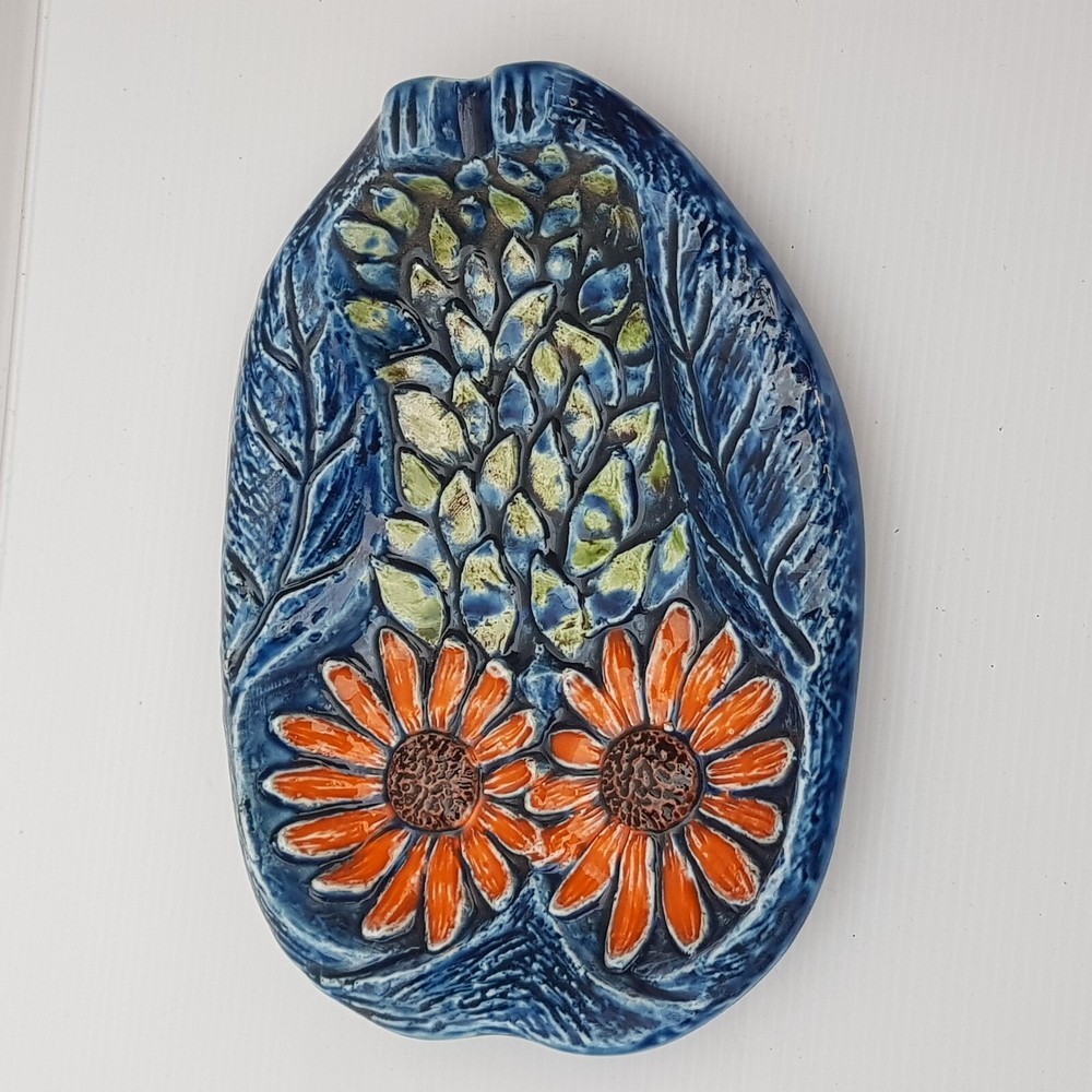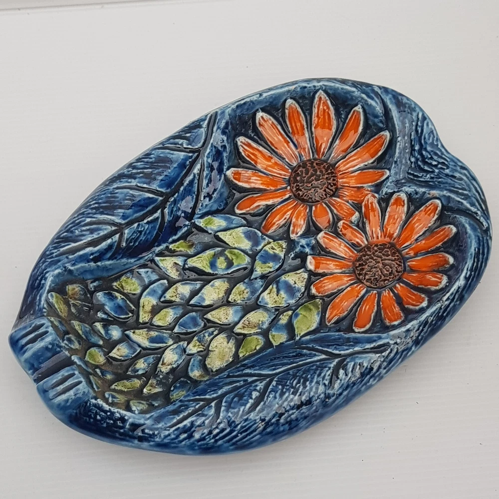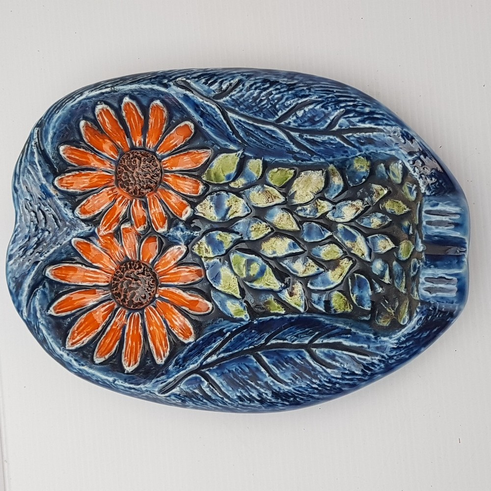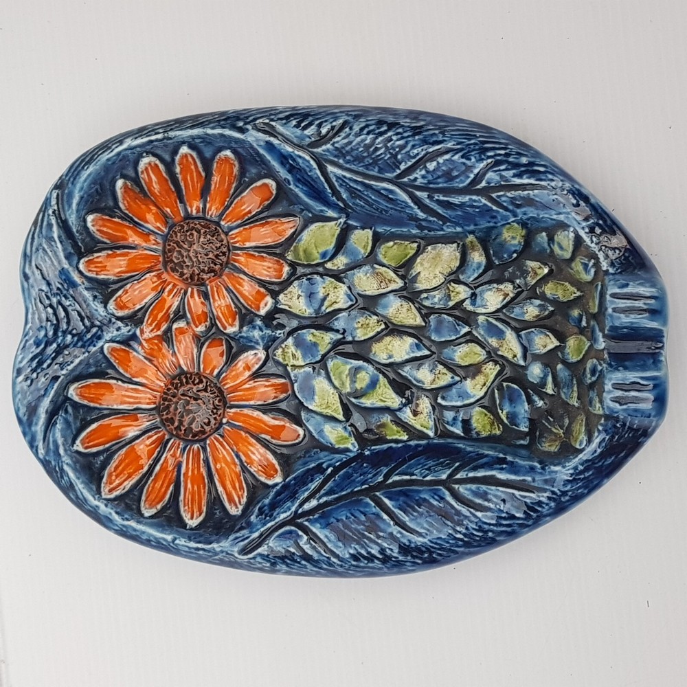 This is a really stunningly bright coloured dish which is of an owl. With the foot rests at the base and on the side I wonder if it was meant as an ashtray. However it is utterly beautiful and stunning and the purpose will be for you to decide. It also has the feel of majolica with the textured feel.