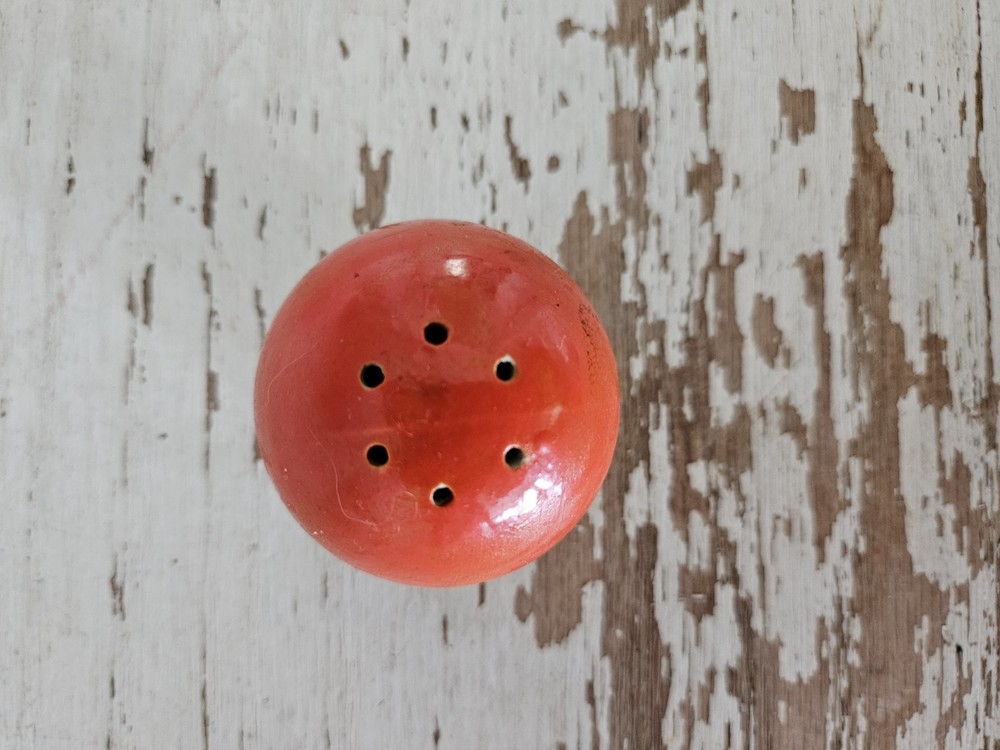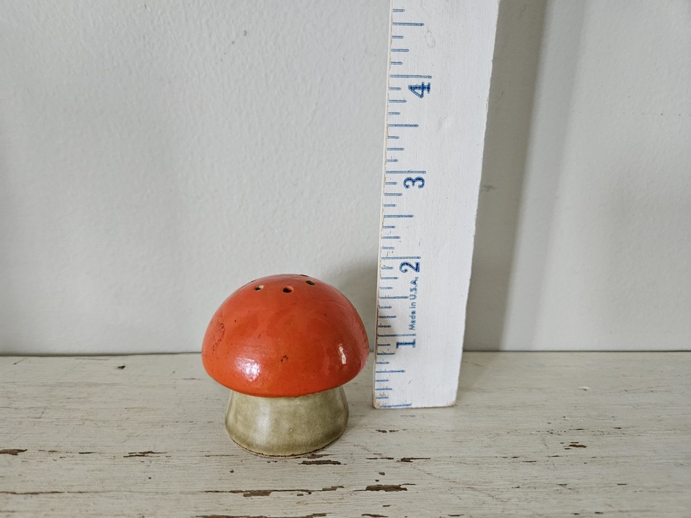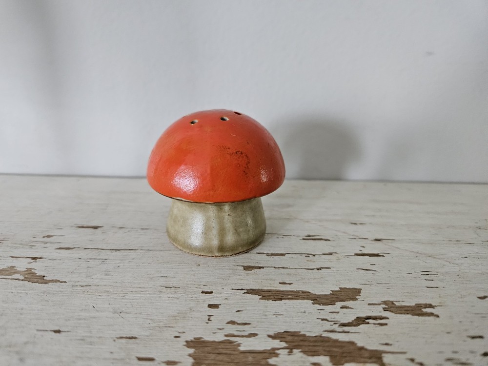 This vintage mid-century ceramic mushroom salt or pepper shaker in orange is a charming and unique addition to any kitchen or dining collection. With its round shape and novelty style, this medium-sized shaker is perfect for all occasions. Made in Japan during the 1950s, this original piece is a collectible item that adds a touch of retro flair to your table setting. Whether used for seasoning or simply as a decorative piece, this shaker is sure to be a conversation starter in your home.