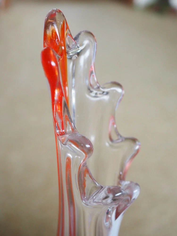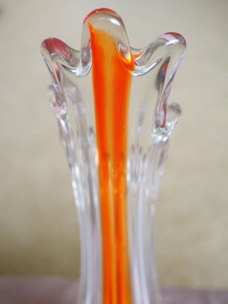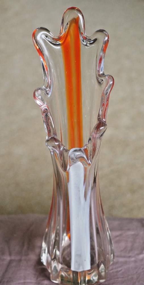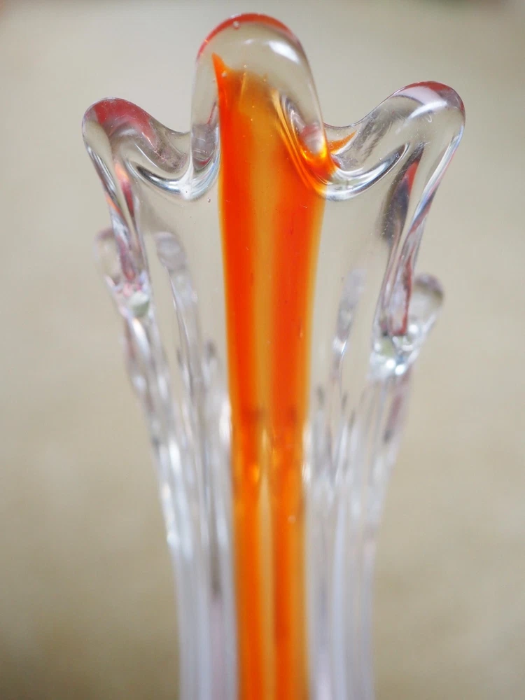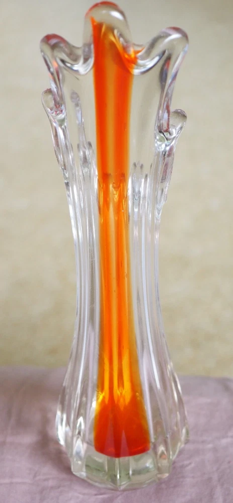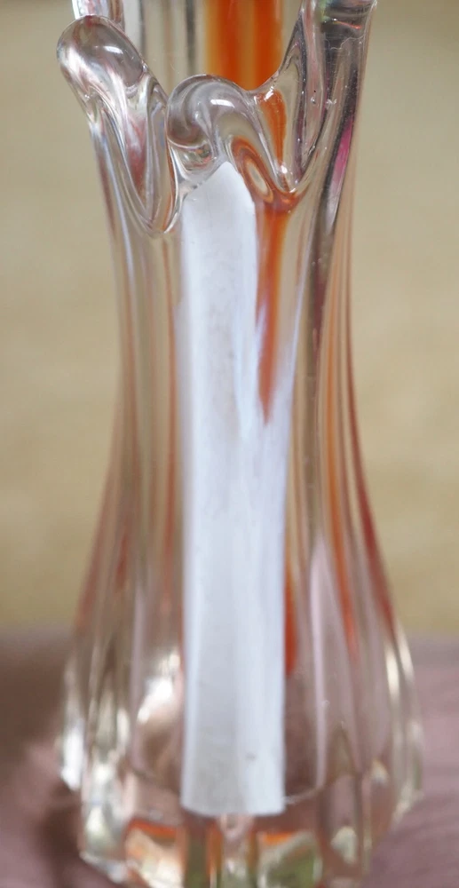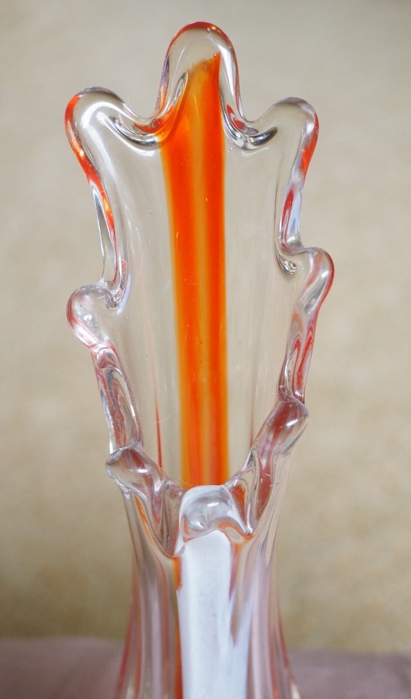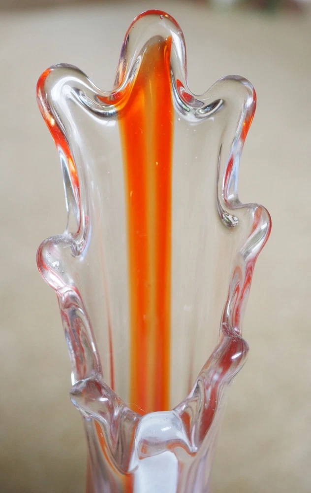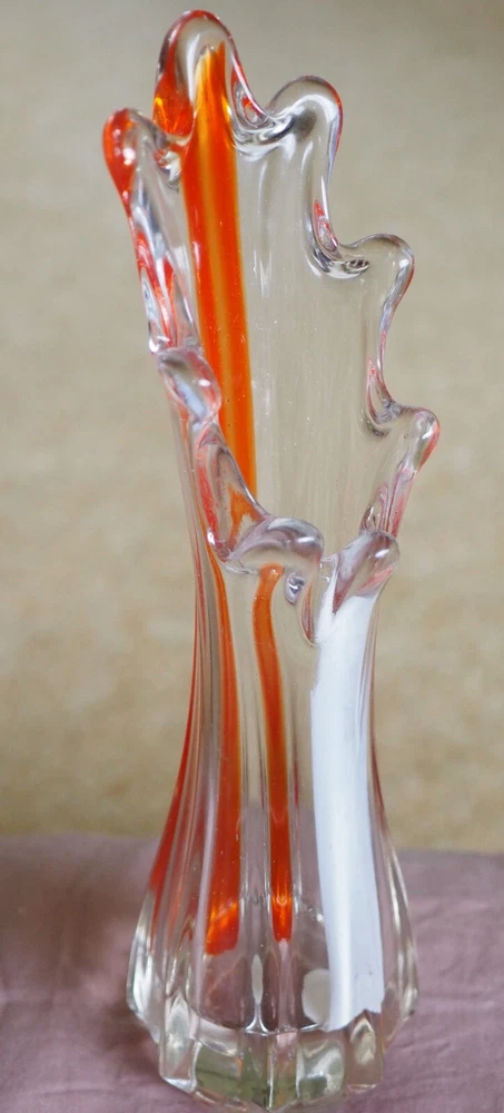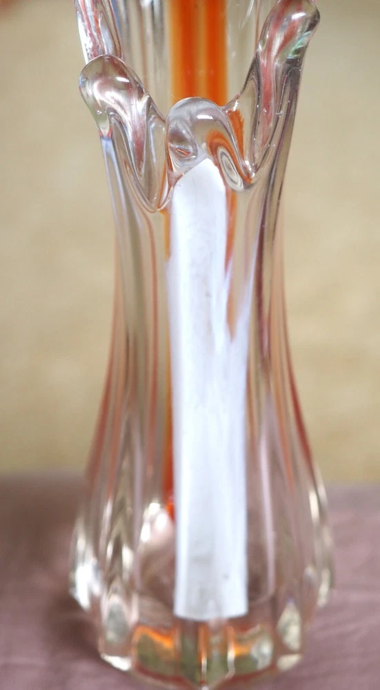 On offer this beautiful vintageFingered Stretch 10.5" Vase Ribbed Swung Orange & White Vase. This vase is so pretty with a mix of orange andwhite. It's a perfect vase for abeside table or entry table. It has no markings. Has a chip in the rim of the base Measures: 8.5 in tall x 2.5 in wide