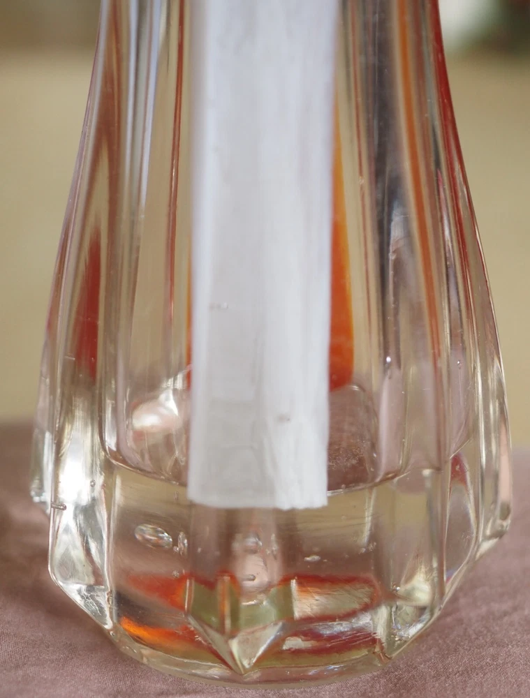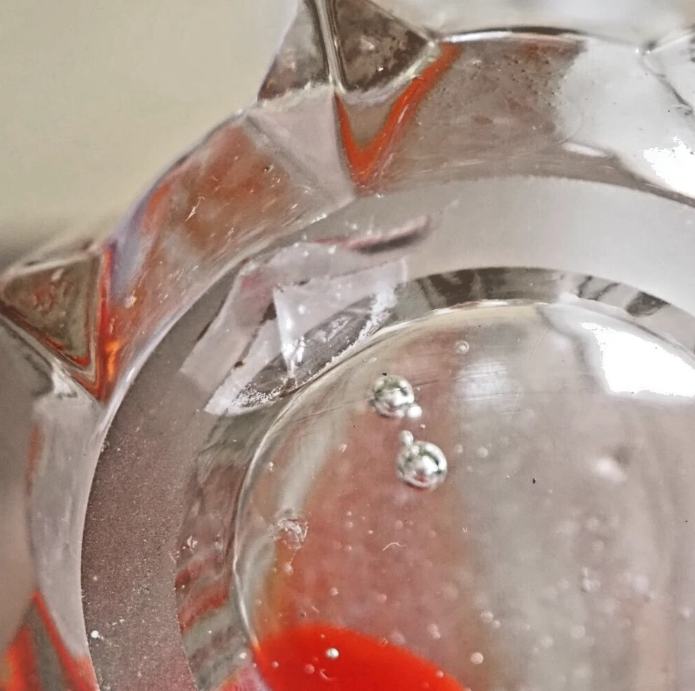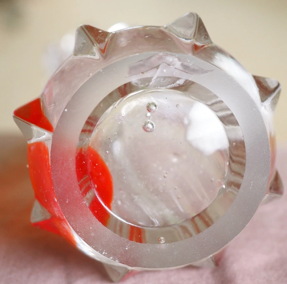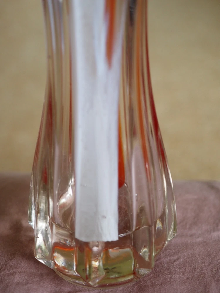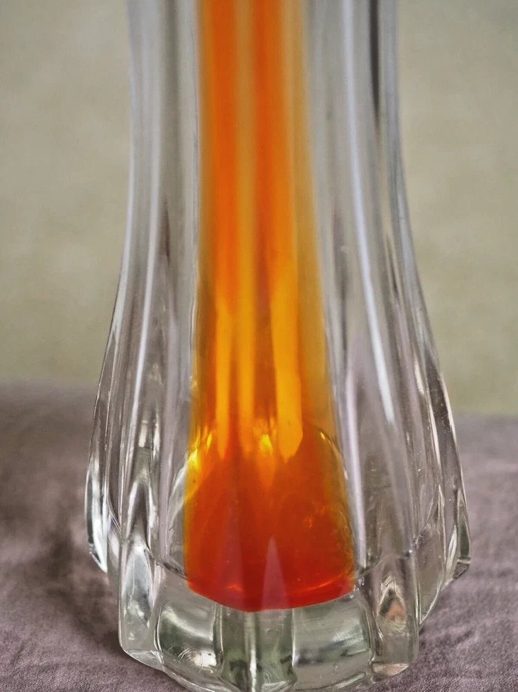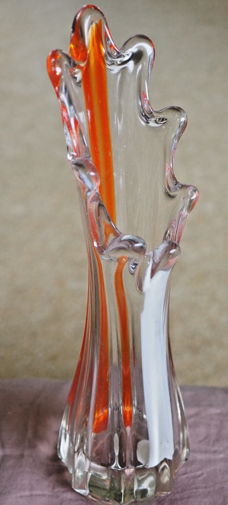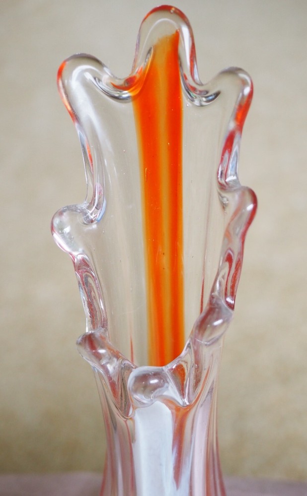 On offer this beautiful vintageFingered Stretch 10.5" Vase Ribbed Swung Orange & White Vase. This vase is so pretty with a mix of orange andwhite. It's a perfect vase for abeside table or entry table. It has no markings. Has a chip in the rim of the base Measures: 8.5 in tall x 2.5 in wide