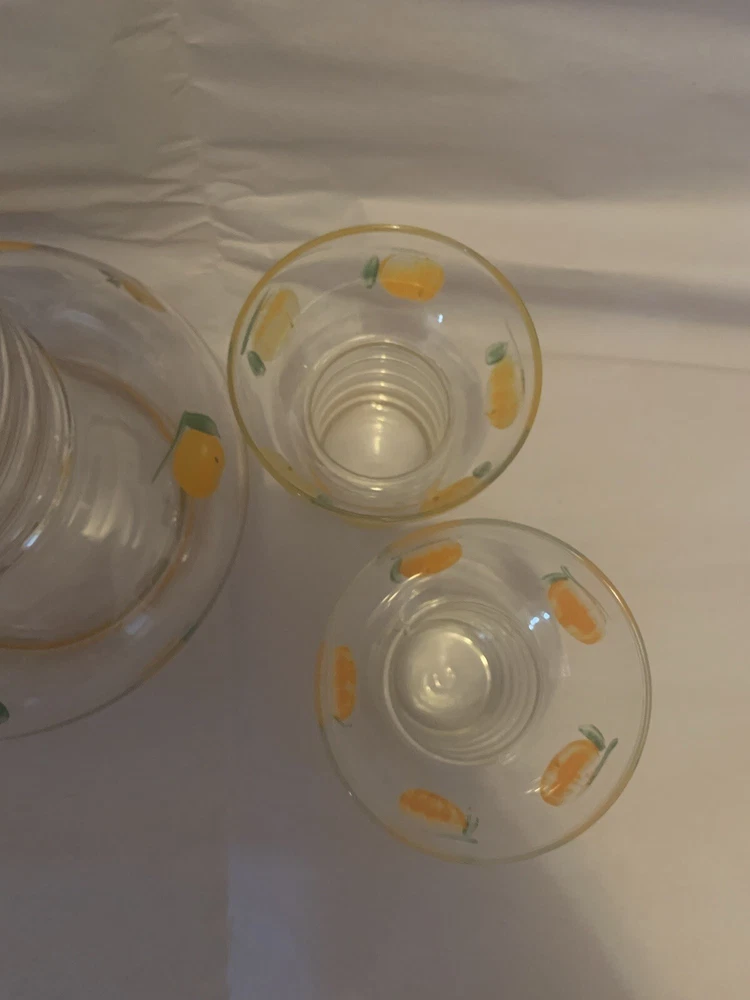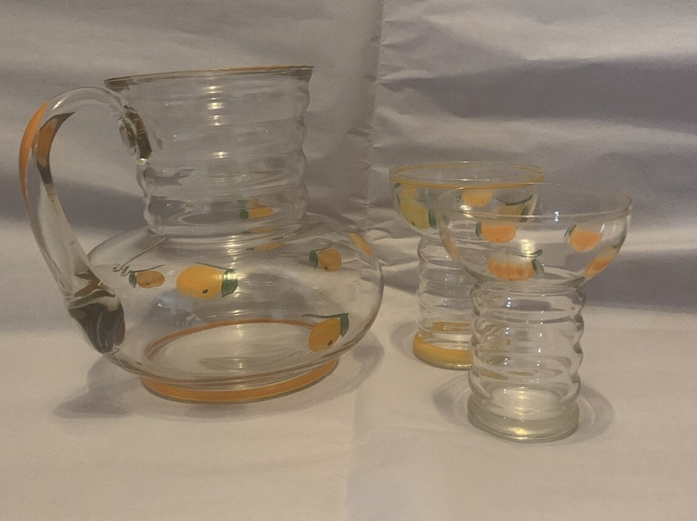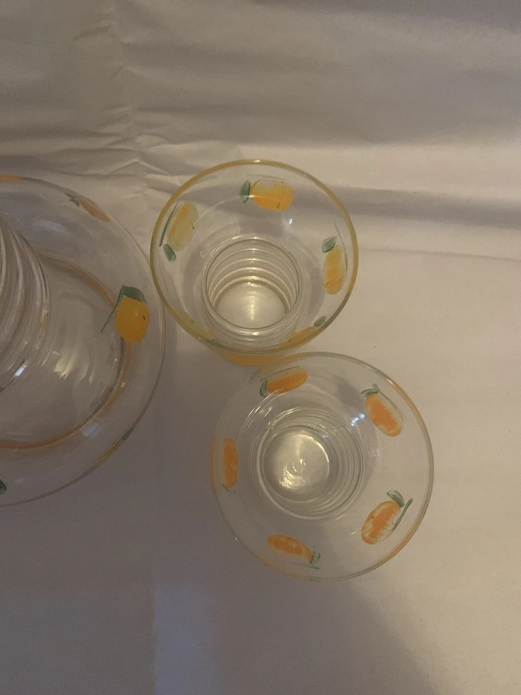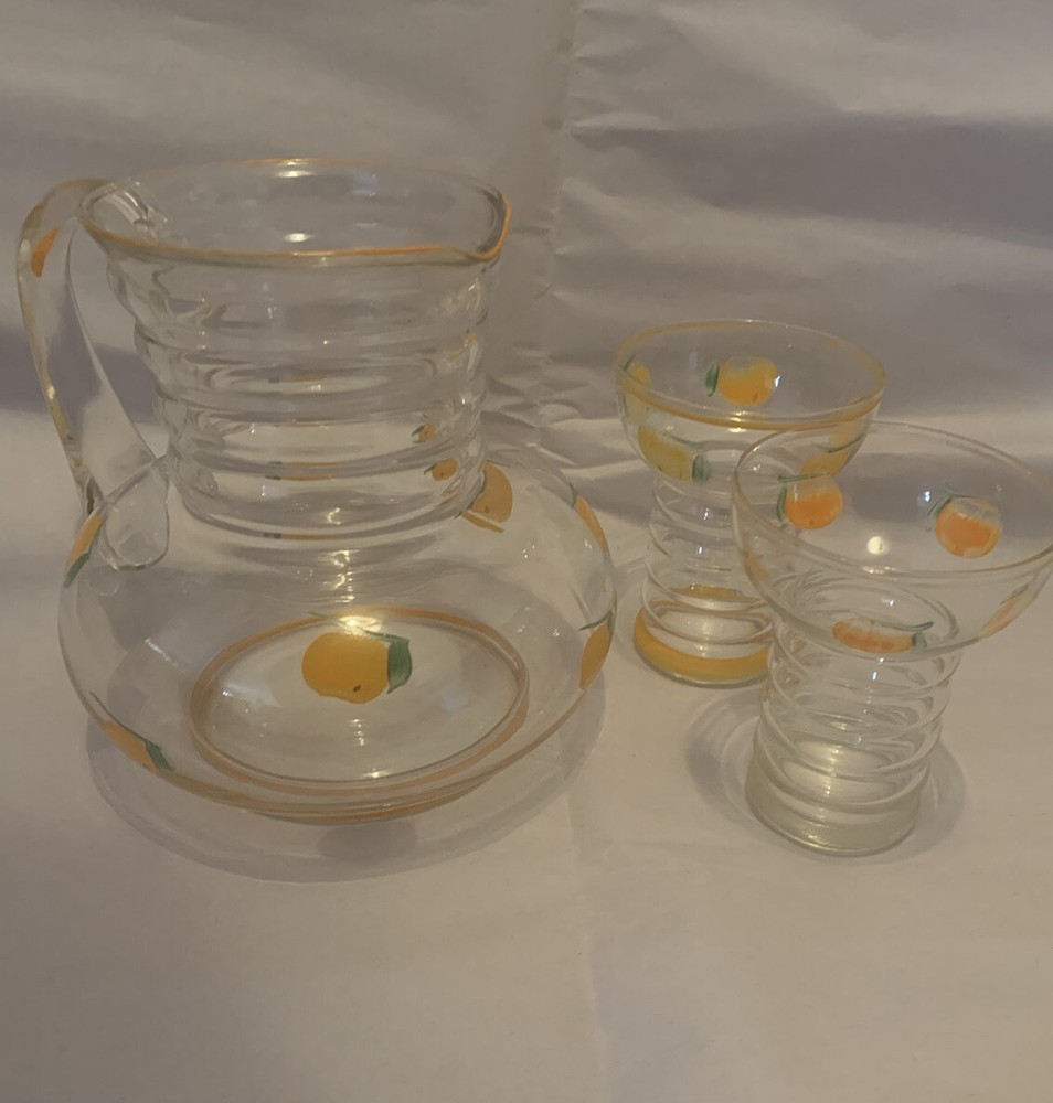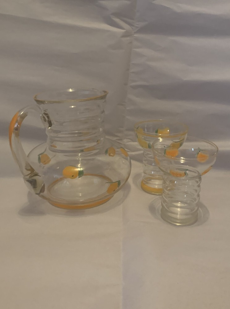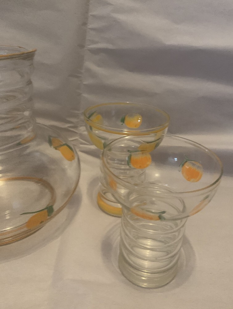 Vintage Mid Century Glass Pitcher & Cups - Hand painted Oranges- Possibly Dunbar. This would be great for any mid century modern kitchen! The oranges look more orange in person- in photos they look more yellow than they are. Please view all photos as they are part of the description! There are no chips or cracks.