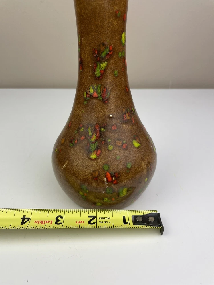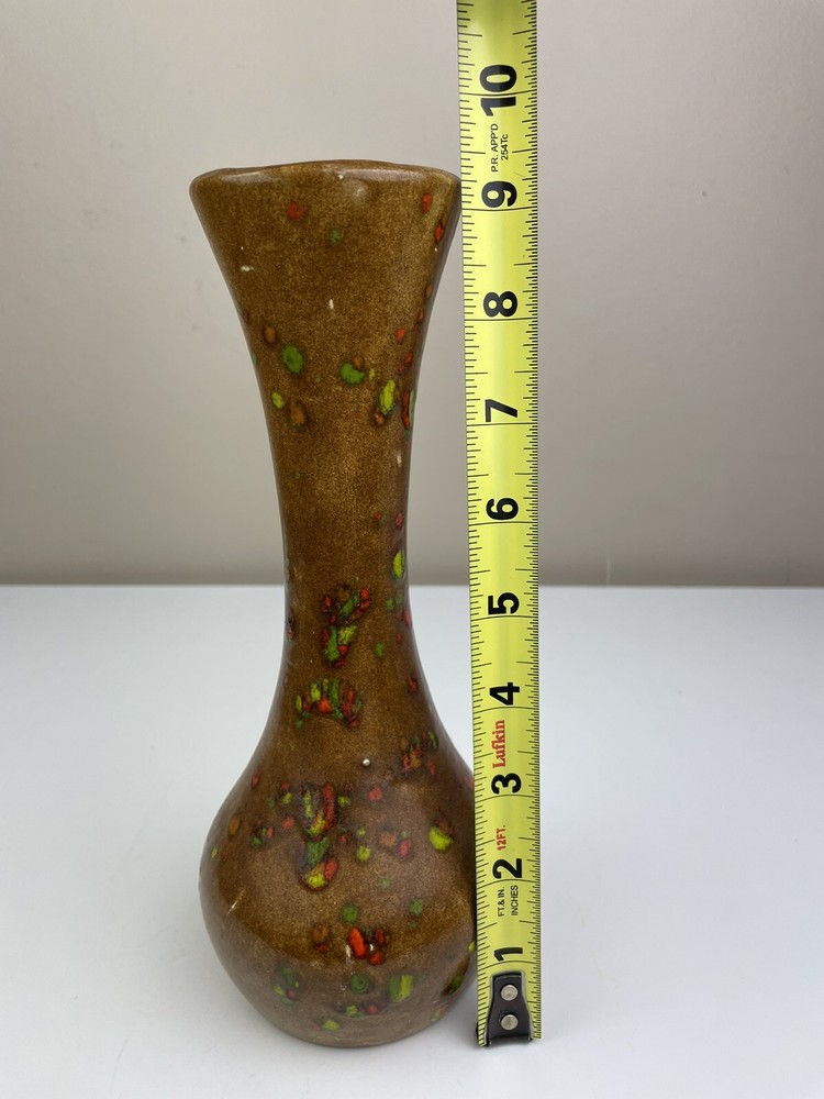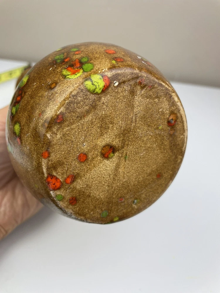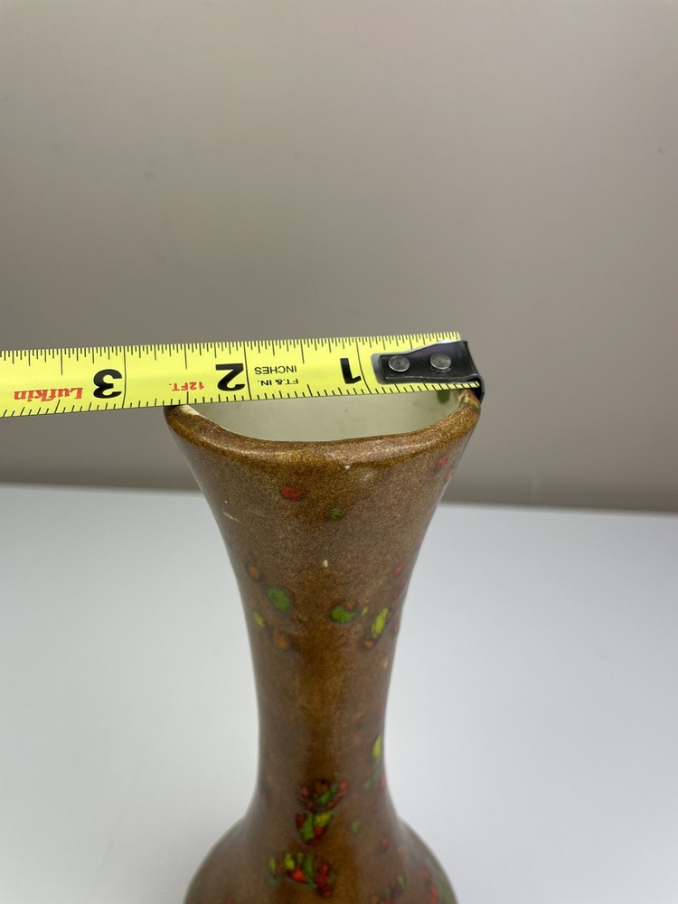 Add a touch of vintage charm to your home with this handcrafted mid-century modern vase. The unique orange, brown, and green speckle design is eye-catching and one-of-a-kind. Made of clay using pottery techniques in the late 20th century, this original piece is perfect for any art pottery collector. The vase is perfect for displaying your favorite flowers or as a standalone decorative item. It's a must-have for any lover of vintage handmade items. It has some spots that doesn’t have colors on- lt doesn’t look like it was damaged or chipped but was made during handcrafted. It has some crazing inside but no leaking found. please see the pictures. If you have any questions, please feel free to send me a message. Thank you for looking! Box A