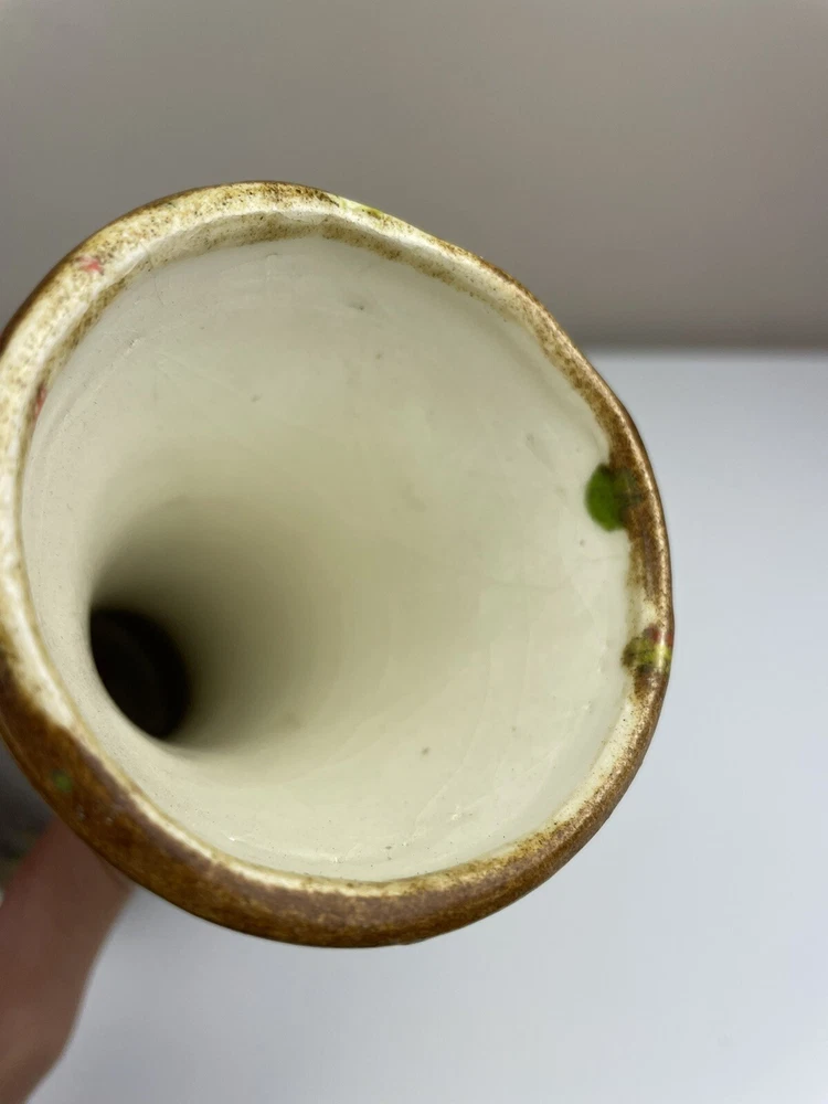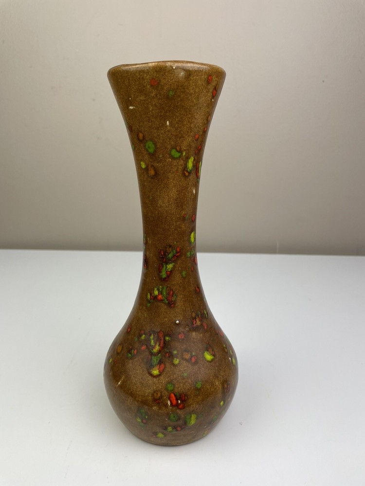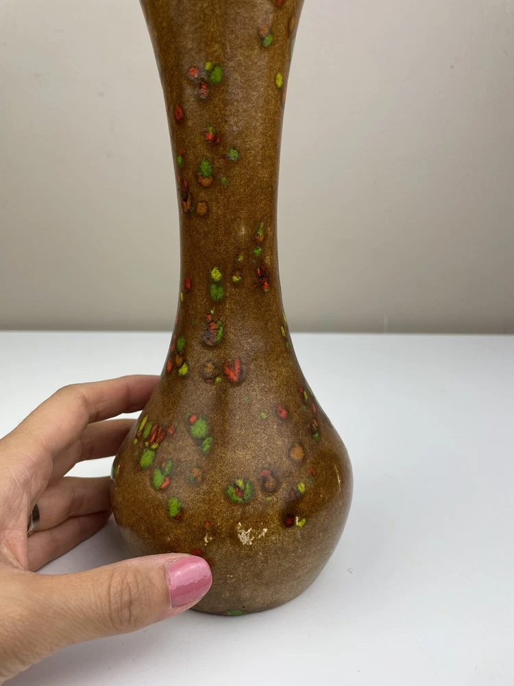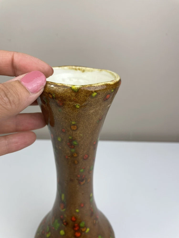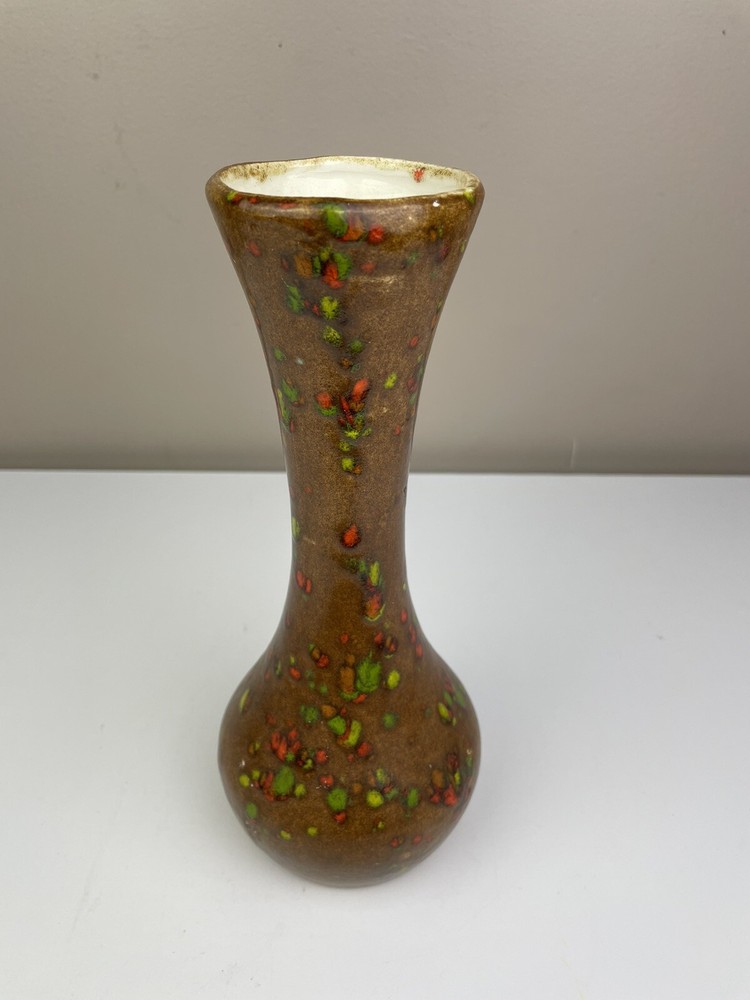 Add a touch of vintage charm to your home with this handcrafted mid-century modern vase. The unique orange, brown, and green speckle design is eye-catching and one-of-a-kind. Made of clay using pottery techniques in the late 20th century, this original piece is perfect for any art pottery collector. The vase is perfect for displaying your favorite flowers or as a standalone decorative item. It's a must-have for any lover of vintage handmade items. It has some spots that doesn’t have colors on- lt doesn’t look like it was damaged or chipped but was made during handcrafted. It has some crazing inside but no leaking found. please see the pictures. If you have any questions, please feel free to send me a message. Thank you for looking! Box A
