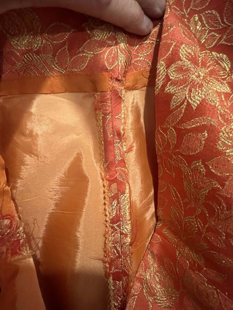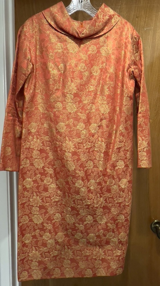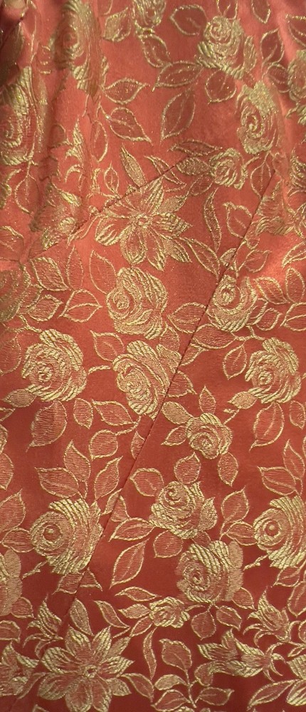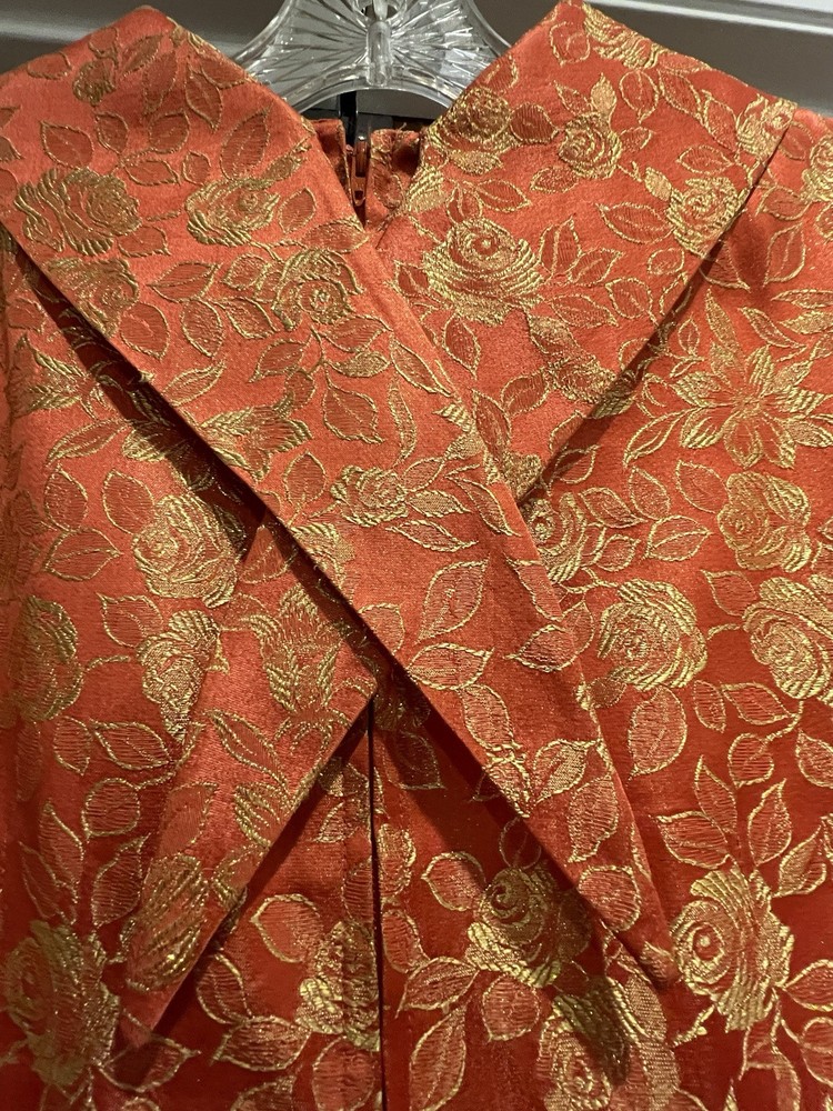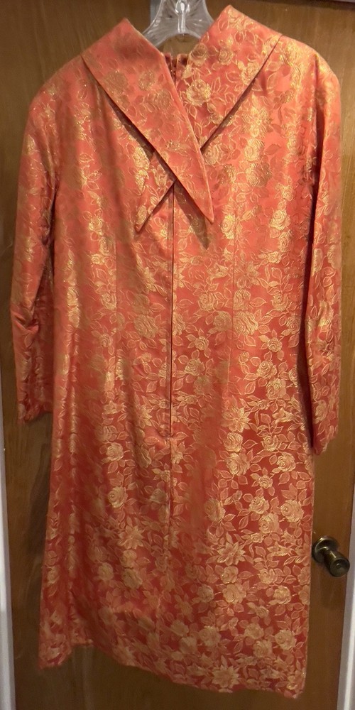Absolutely stunning vintage dress! The rich orange brocade with gold metallic threads gives it such a luxurious, retro vibe. The Asian-inspired design is unique, especially the detailed collar in the back—so elegant! The fabric feels high-quality, and the lining makes it comfortable to wear. Fits like a dream for a size 6, and the craftsmanship is clearly handmade with care. Definitely a standout piece—just remember to dry clean it to keep it looking fabulous!
