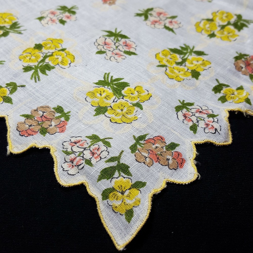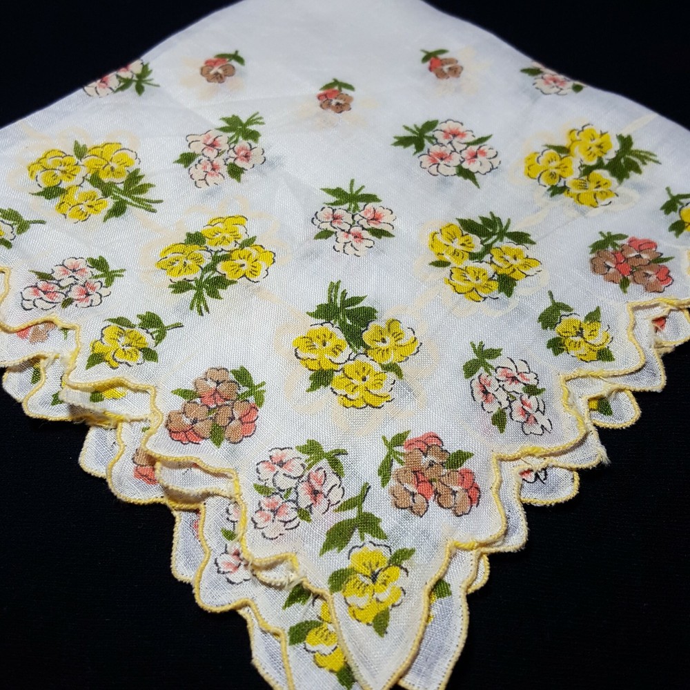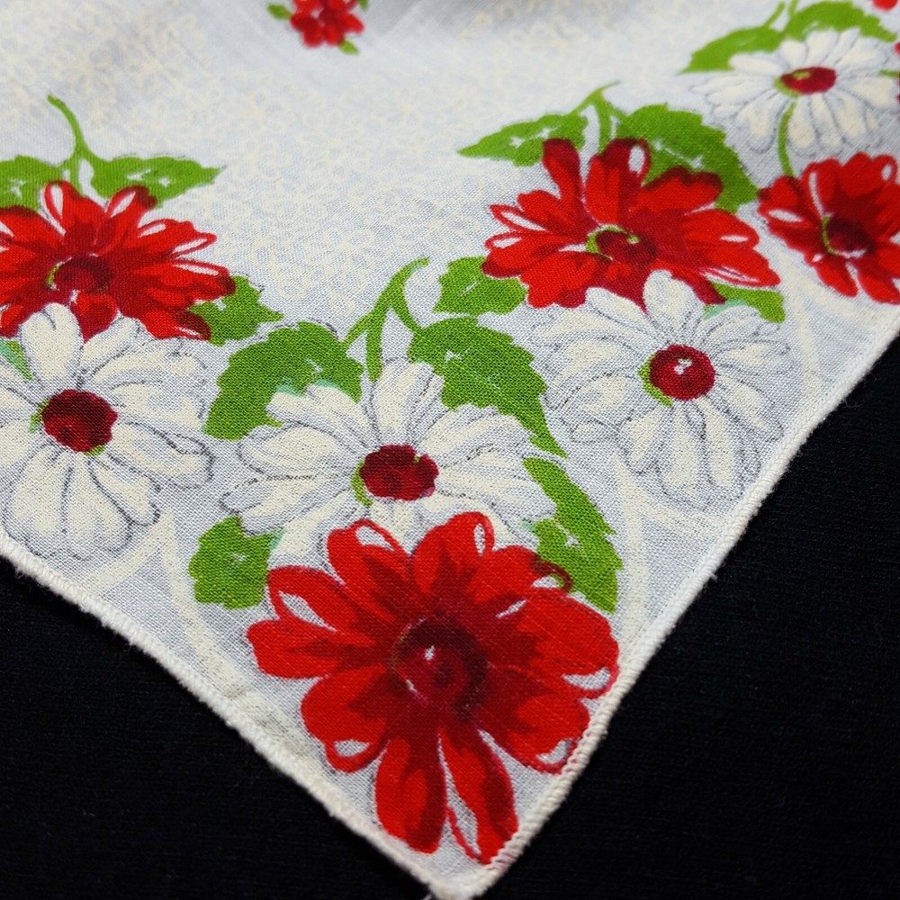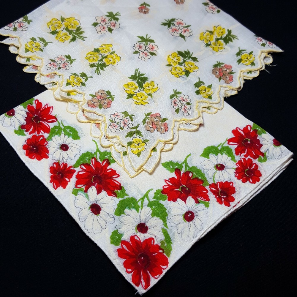 Vintage Mid Century Hankie Handkerchief Scallop Edge Red & Yellow Flowers 2 hankies 13 in square...