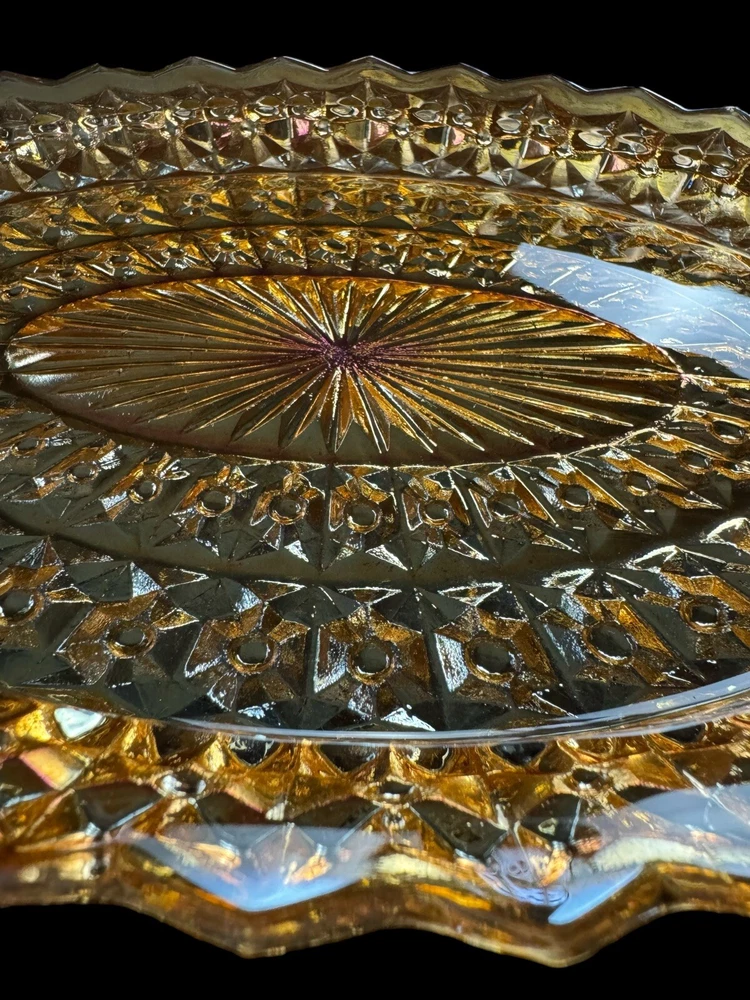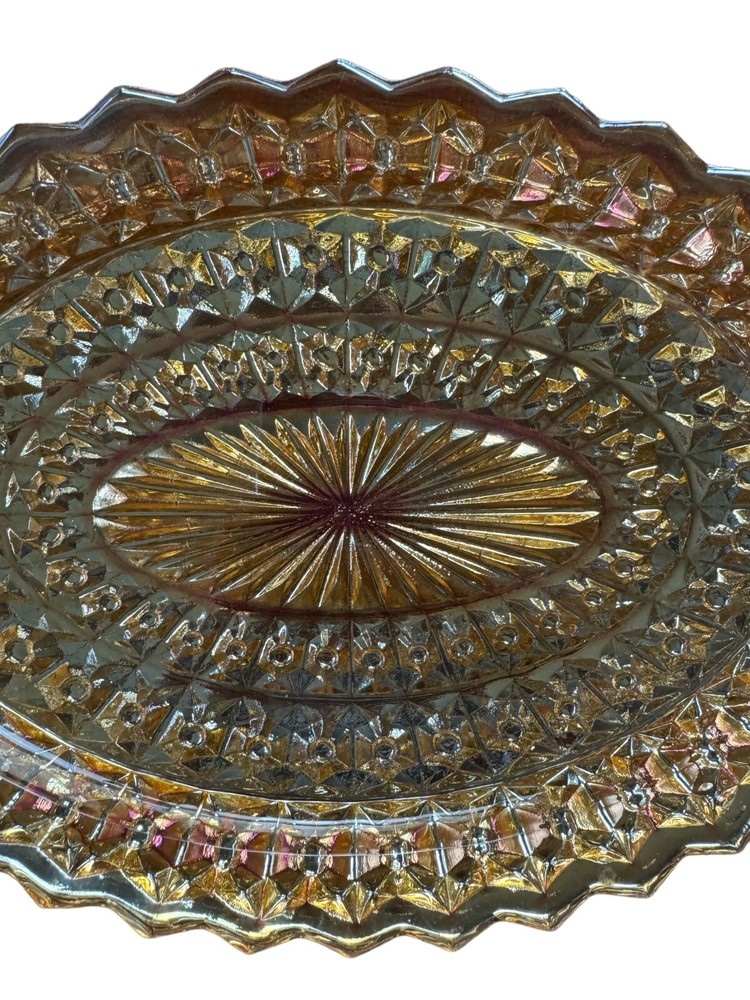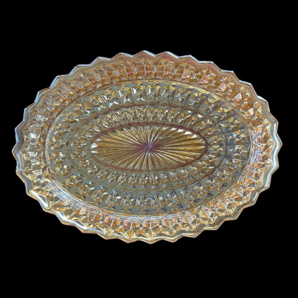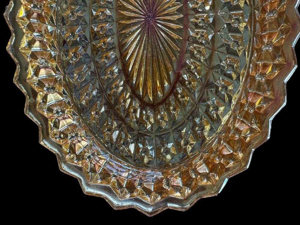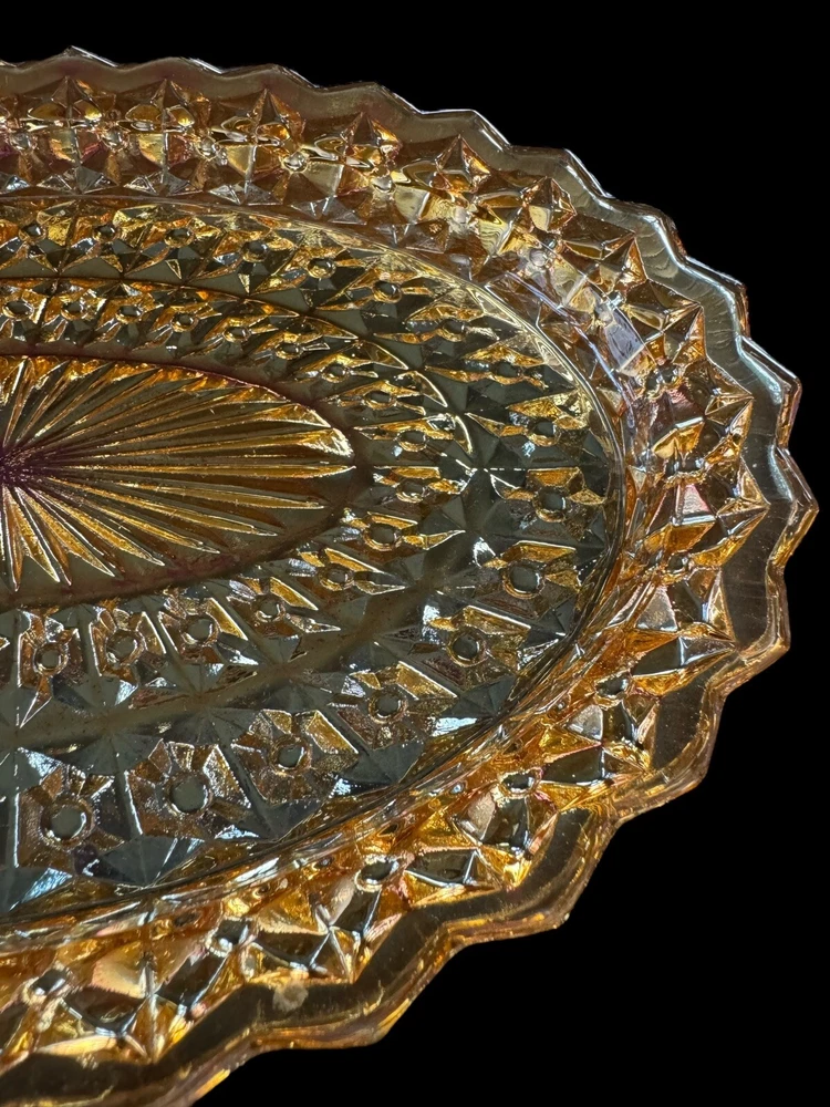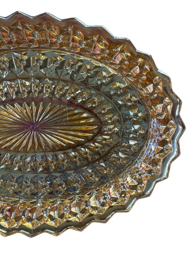 Beautiful vintage orange carnival glass serving tray made by Jeanette Glass Company in the USA during the mid 20th century. This iridescent holiday pattern is a lovely marigold color that reflects a pink luster. The piece is in excellent vintage condition with no chips or cracks. See photos for details. Entertain in style or use as a display tray for jewelry, perfume, or decor! Dimensions: 11.5” x 8” (approx) USPS First Class shipping from Michigan.