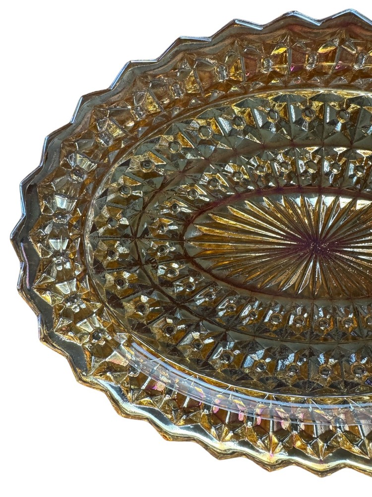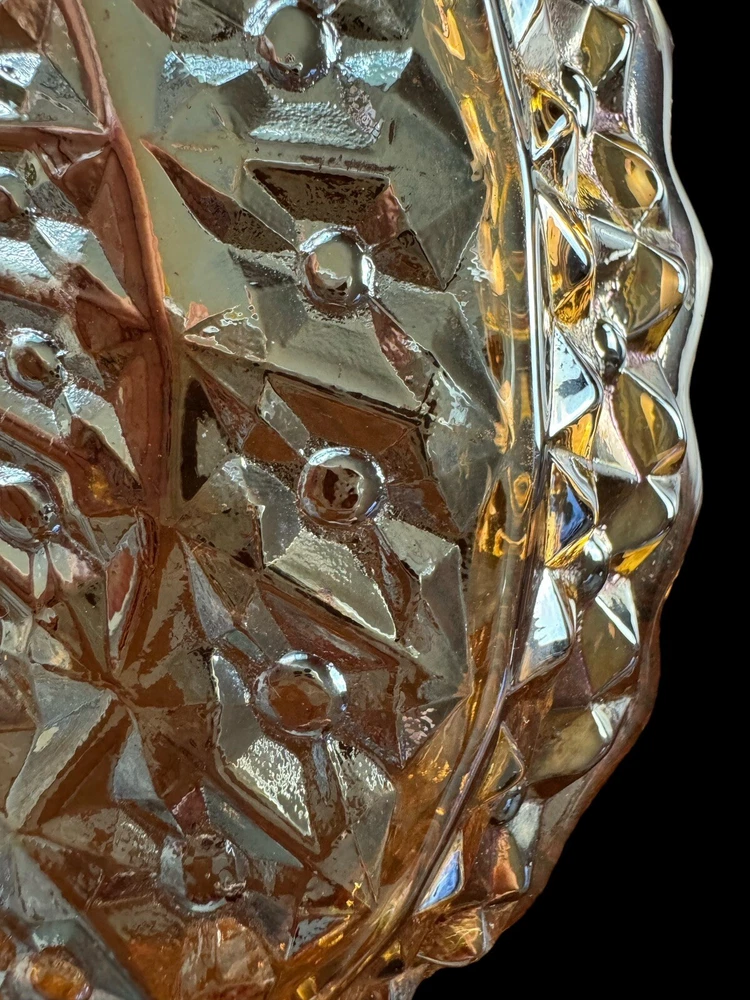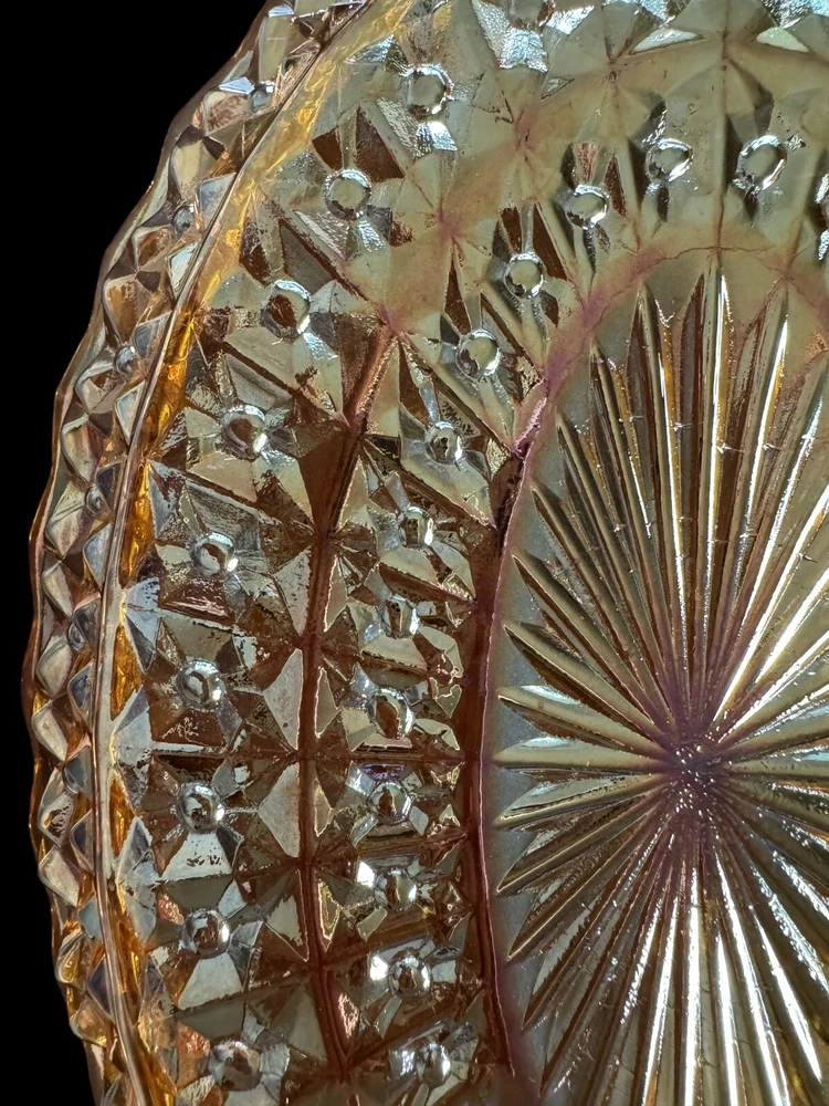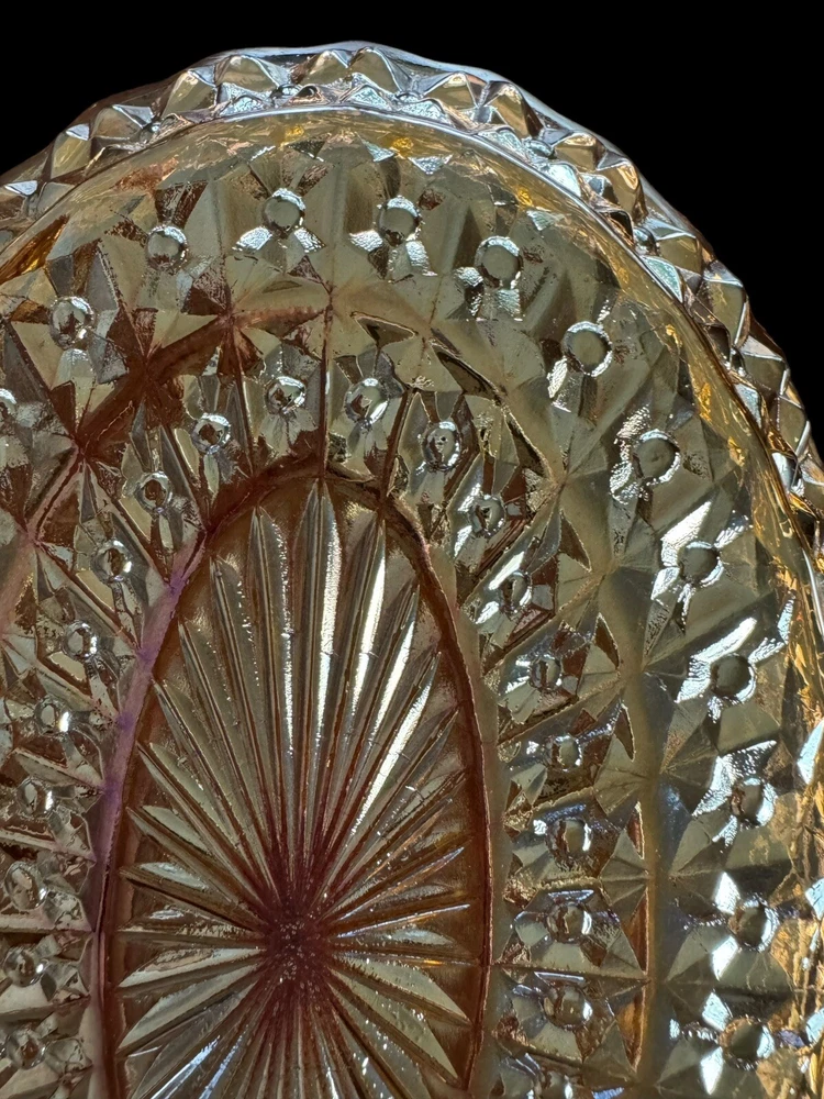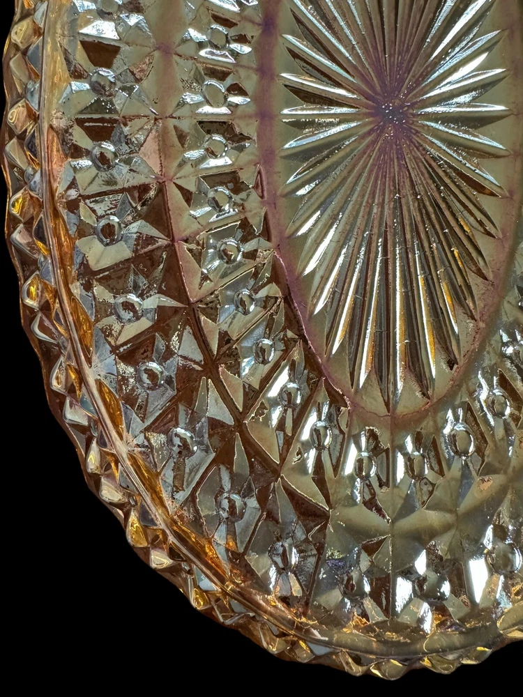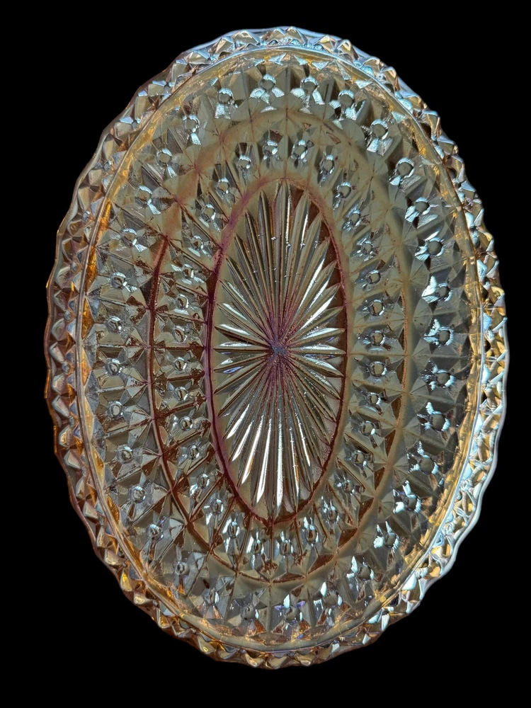 Beautiful vintage orange carnival glass serving tray made by Jeanette Glass Company in the USA during the mid 20th century. This iridescent holiday pattern is a lovely marigold color that reflects a pink luster. The piece is in excellent vintage condition with no chips or cracks. See photos for details. Entertain in style or use as a display tray for jewelry, perfume, or decor! Dimensions: 11.5” x 8” (approx) USPS First Class shipping from Michigan.