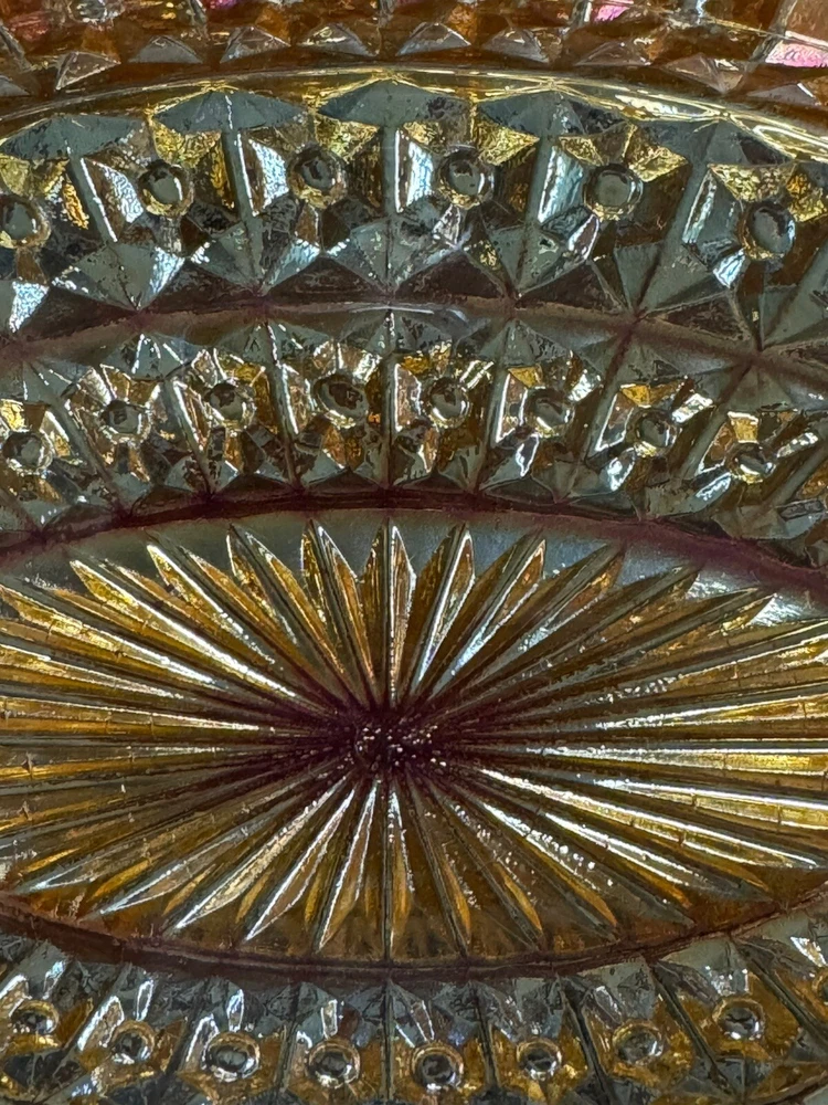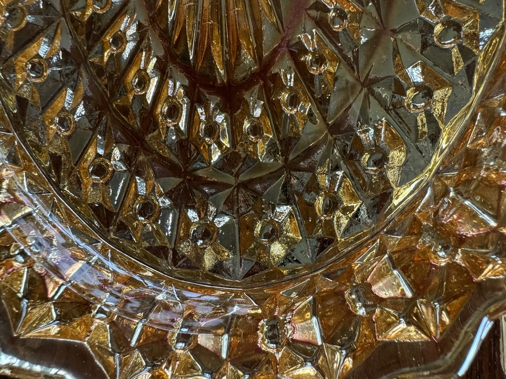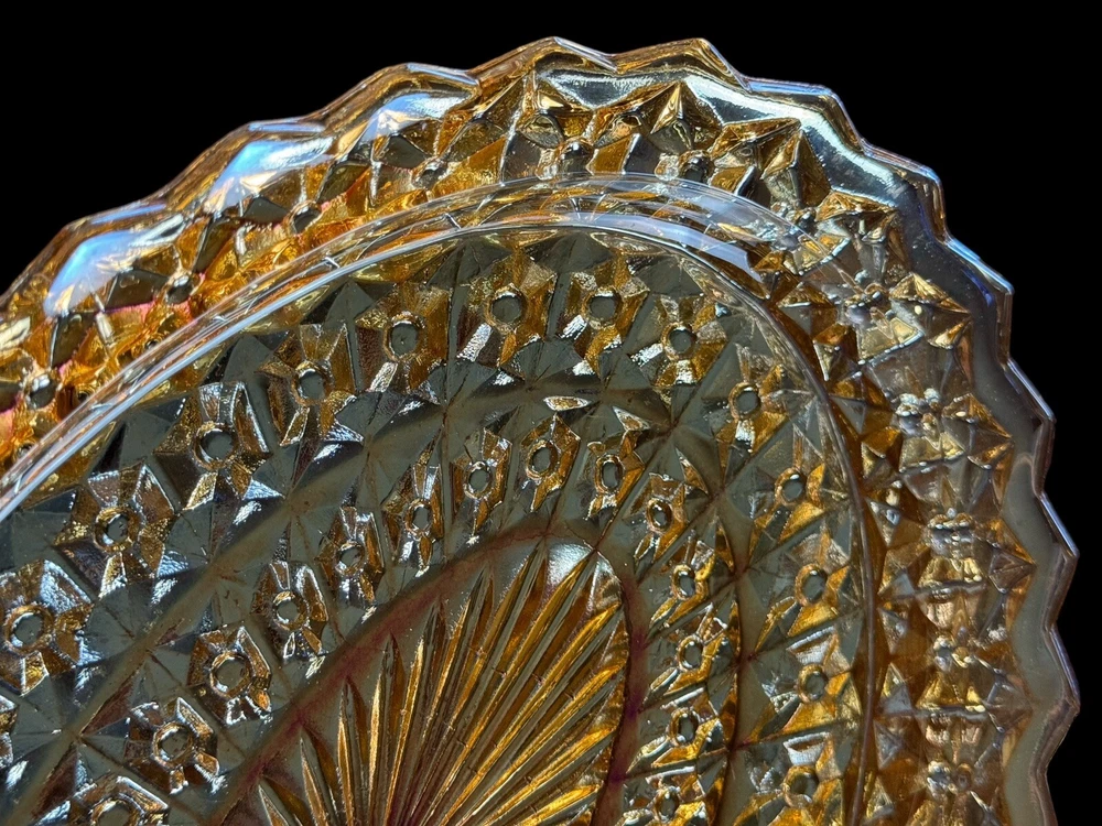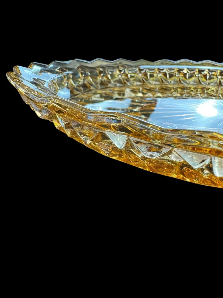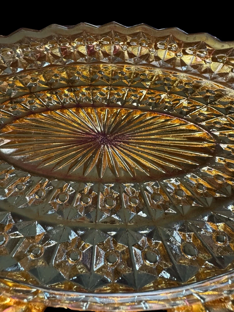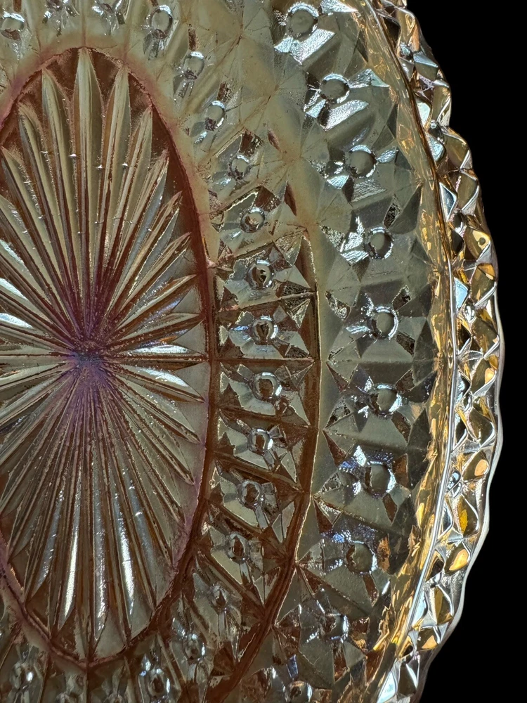 Beautiful vintage orange carnival glass serving tray made by Jeanette Glass Company in the USA during the mid 20th century. This iridescent holiday pattern is a lovely marigold color that reflects a pink luster. The piece is in excellent vintage condition with no chips or cracks. See photos for details. Entertain in style or use as a display tray for jewelry, perfume, or decor! Dimensions: 11.5” x 8” (approx) USPS First Class shipping from Michigan.