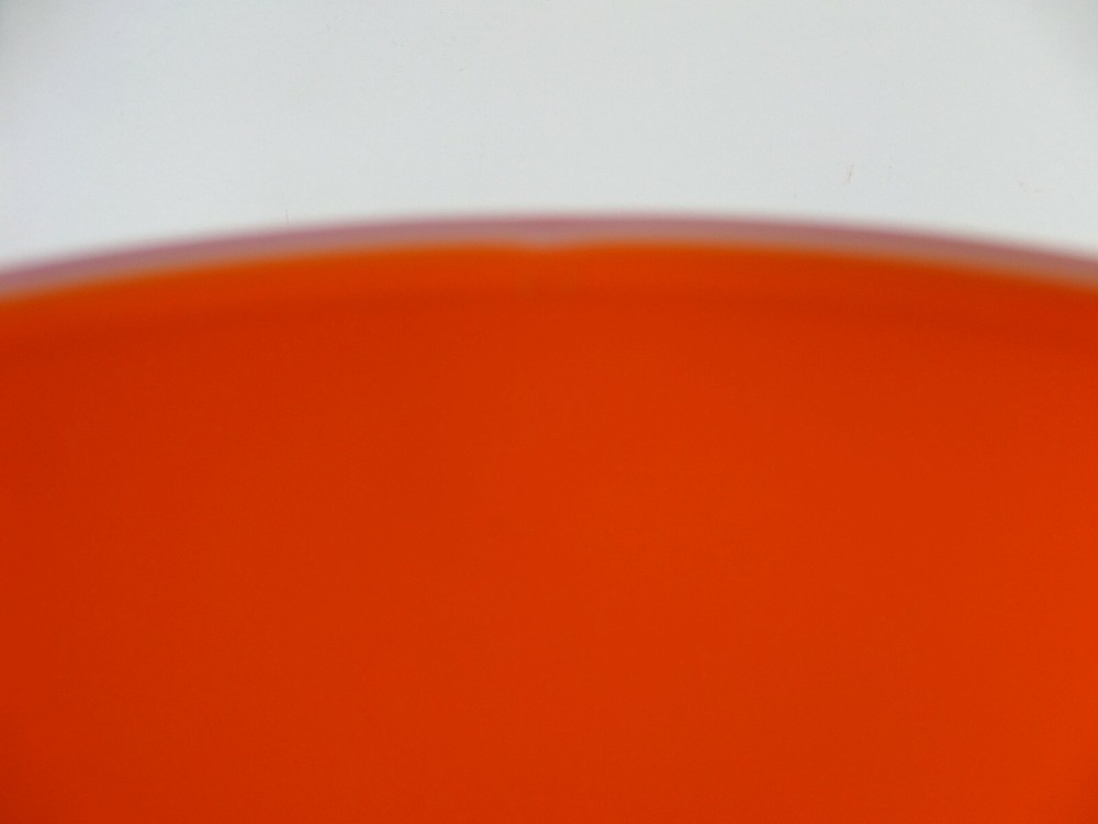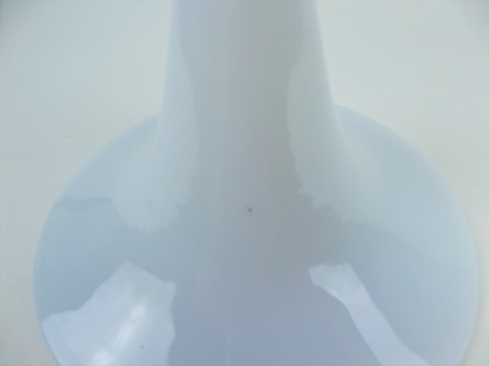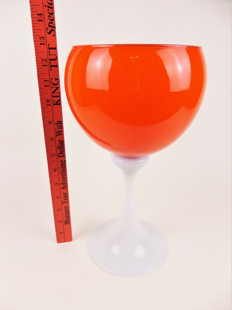 Bright orange glass bowl with white opaque glass stem. Large - 13" high X 6.5" wide. Very unusual, I have never seen another like it. Good condition, tiny chip on inside of the lip. A black dot on the stem and a couple on the inside of the bowl. Shipped in an appropriate size box with plenty of bubble wrap. 134mb