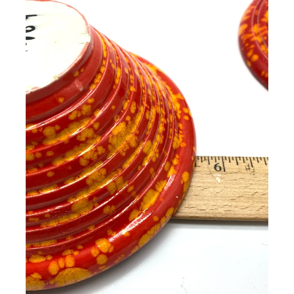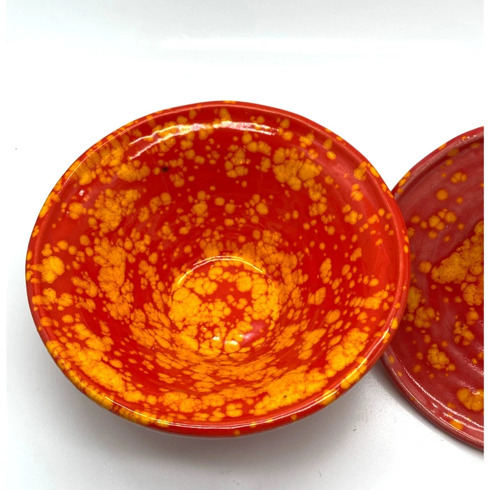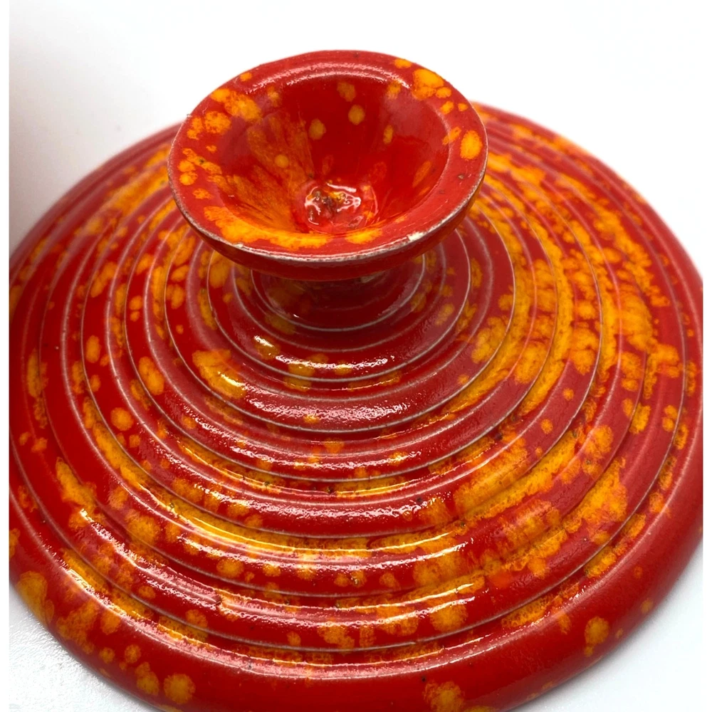 <![CDATA[<div>Midcentury Mid Century Pottery Fire Orange Red with Lid 1969 Trinket dish Sugar bowl Decor Signed...