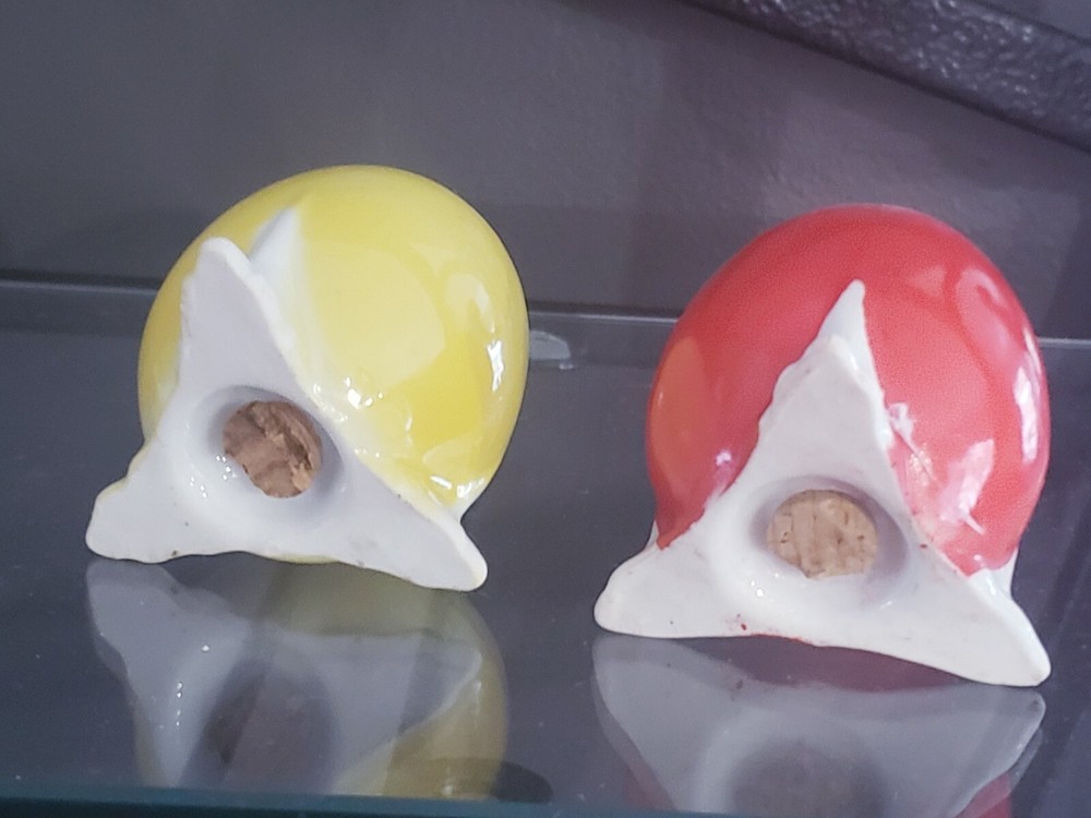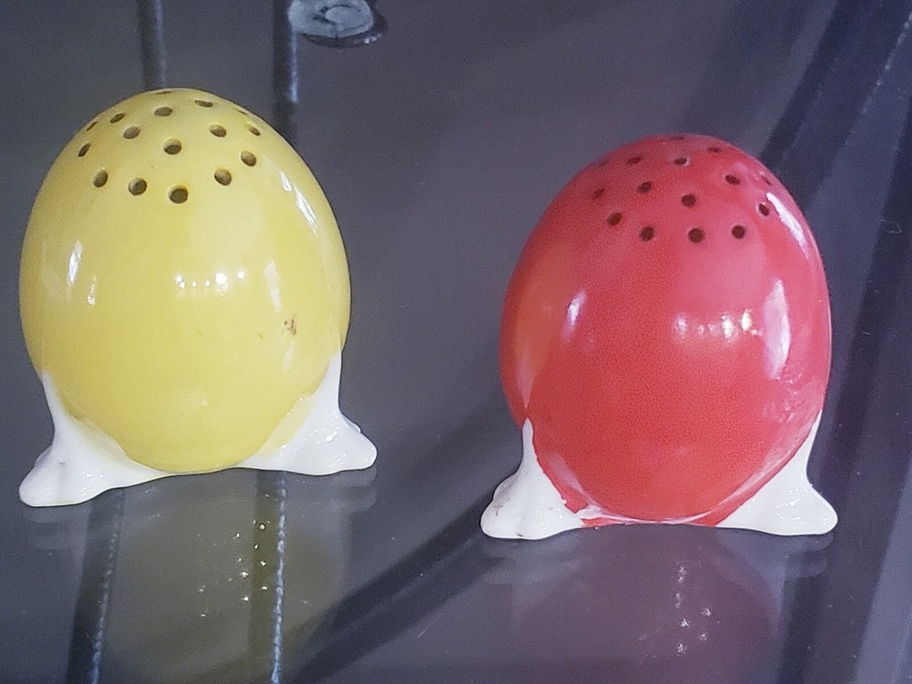 Vintage Mid Century MCM PRIMARY COLORS RED YELLOW Egg Salt & Pepper . Each approximately 2.5" high. Minor color wear around feet. Original cork 3. No cracks or chips.