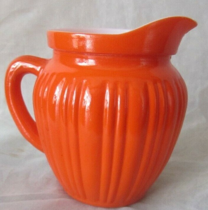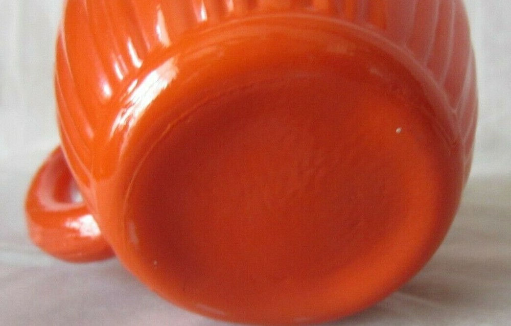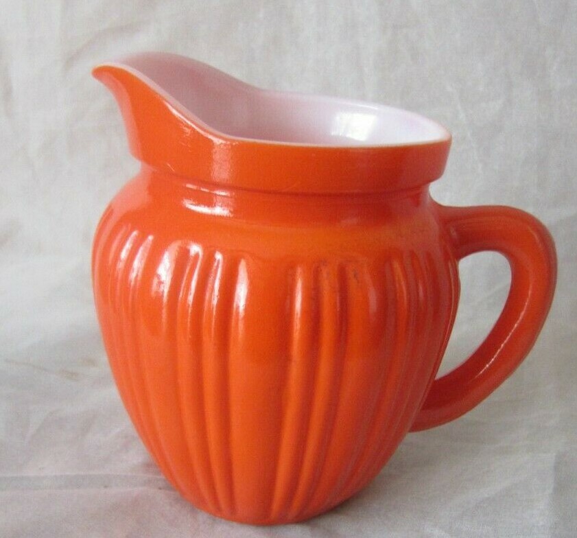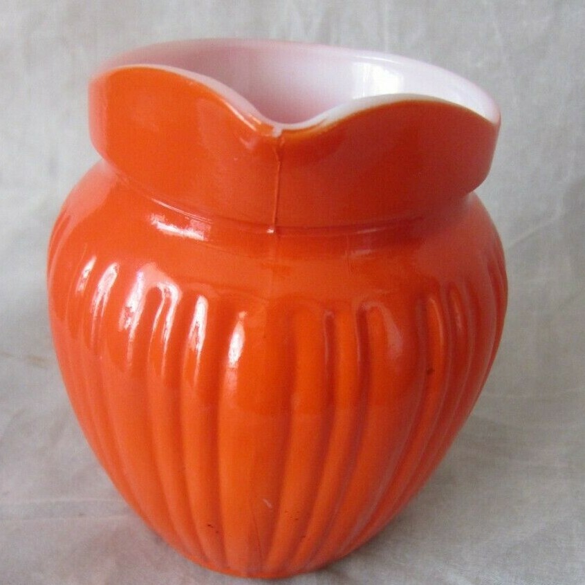 Vintage Mid Century Mod 60s Hazel Atlas Orange Ribbed Platonite Creamer Pitcher Measures: 4 1/4" tall Condition: Pre-owned, very good no chips or cracks.