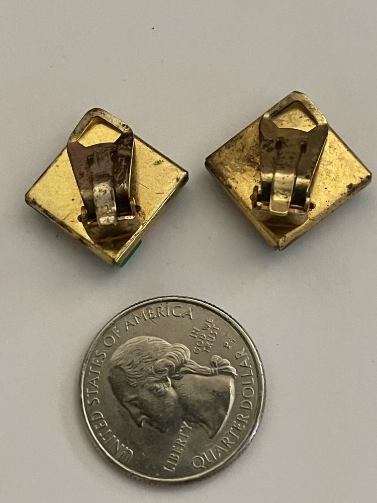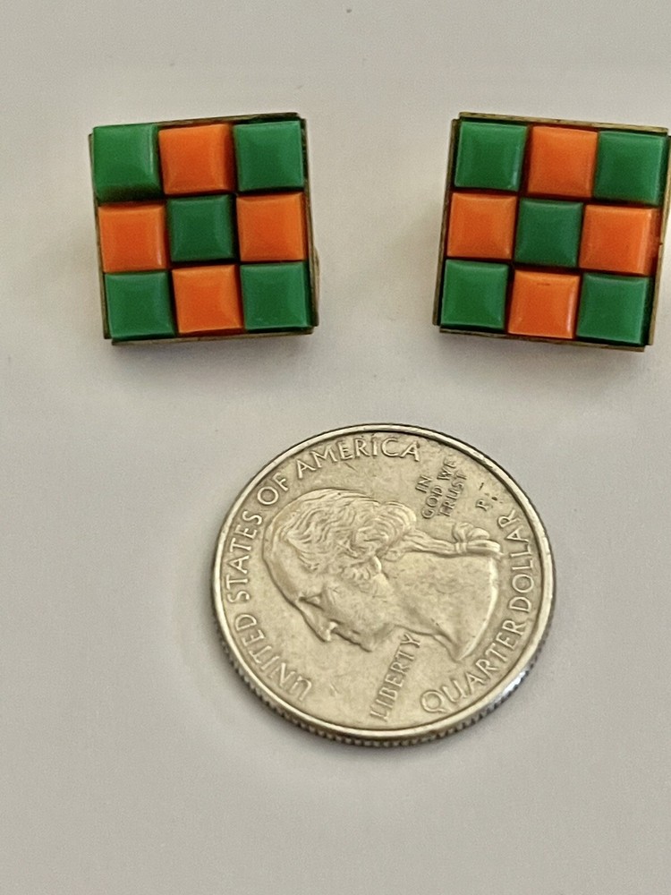 This auction is for a Vintage Mid Century Mod Orange & Green Lucite Checkerboard Bead Clip Earrings …Approx 3/4” long and wide...... unmarked …. in beautiful Pre loved condition ....photos in natural & flash light…..please see all my photos as they are part of my description……I have a matching ring on eBay in a separate auction….. this auction is only for the earrings…… I have other jewelry on ebay and I happily combine shipping... Questions - please email me before auction ends. Winning bidder to pay shipping and handling, item will be mailed in a first class padded envelope ...Payment is due within 24 hours of auctions end…..THESE TERMS ARE NOT NEGOTIABLE AFTER AUCTION ENDS..... *** International buyers will pay at a different rate for shipping..I OTHER IMPORTANT INFORMATION Most of the items I offer are bought on the secondary market and therefore I do not know the history behind them. I strive to purchase and sell only quality items and once they come to my home they are stored in a clean, smoke-free environment. I will do my best to describe each item, pointing out any missing items, minor flaws, etc. however, being only human - there may be an occasion when something has been overlooked. It is never my intention to deliberately withhold information or misrepresent the item in anyway. Please keep in mind these items have been previously owned and are not new. Please review the description and the pictures carefully and if I can answer any questions or provide you with additional photos please do not hesitate to e-mail me before bidding.