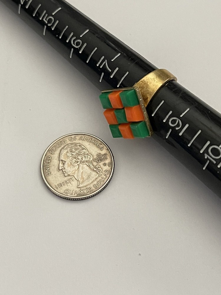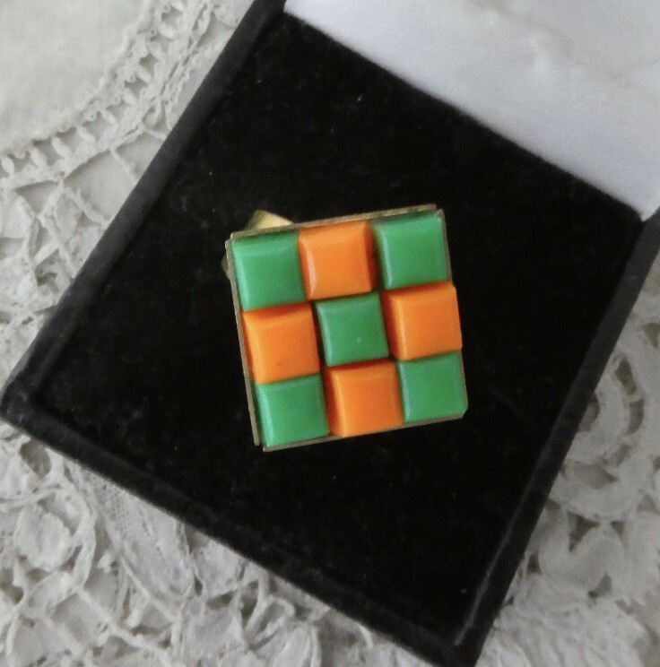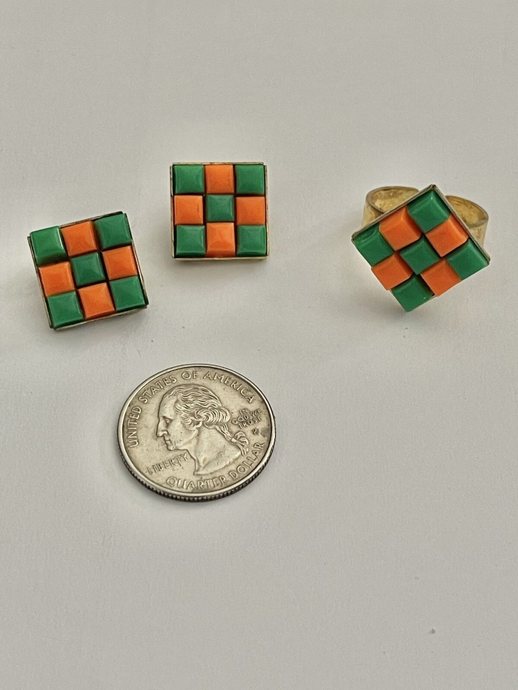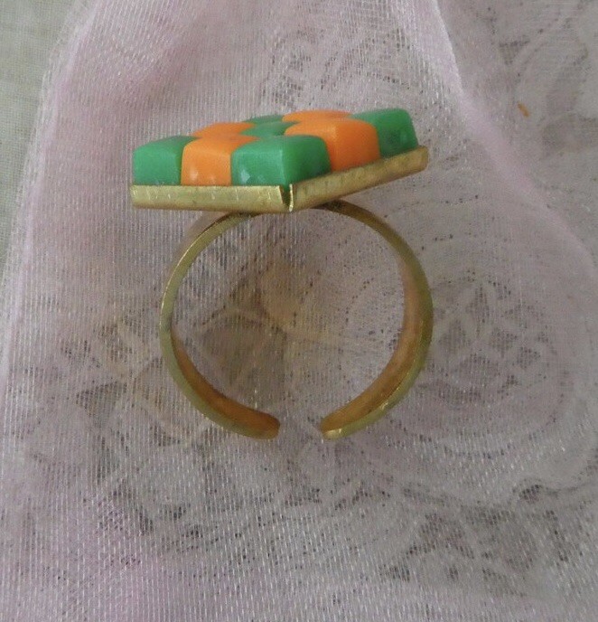 This auction is for a Vintage Mid Century Mod Orange & Green Lucite Checkerboard Bead Ring #Hippie…. Approx 7/8” long and 5/8” wide...... adjustable Size 8 ….unmarked …. in beautiful Pre loved condition ....photos in natural & flash light…..please see all my photos as they are part of my description……I have matching clip earrings on eBay in a separate auction….. this auction is only for the Ring…… I have other jewelry on ebay and I happily combine shipping... Questions - please email me before auction ends. Winning bidder to pay shipping and handling, item will be mailed in a first class padded envelope ...Payment is due within 24 hours of auctions end…..THESE TERMS ARE NOT NEGOTIABLE AFTER AUCTION ENDS..... *** International buyers will pay at a different rate for shipping..I OTHER IMPORTANT INFORMATION Most of the items I offer are bought on the secondary market and therefore I do not know the history behind them. I strive to purchase and sell only quality items and once they come to my home they are stored in a clean, smoke-free environment. I will do my best to describe each item, pointing out any missing items, minor flaws, etc. however, being only human - there may be an occasion when something has been overlooked. It is never my intention to deliberately withhold information or misrepresent the item in anyway. Please keep in mind these items have been previously owned and are not new. Please review the description and the pictures carefully and if I can answer any questions or provide you with additional photos please do not hesitate to e-mail me before bidding.