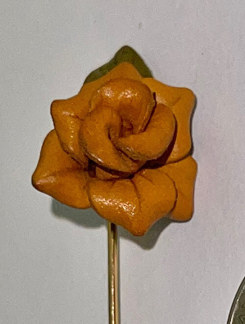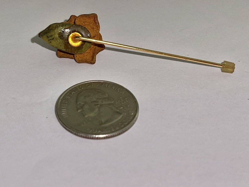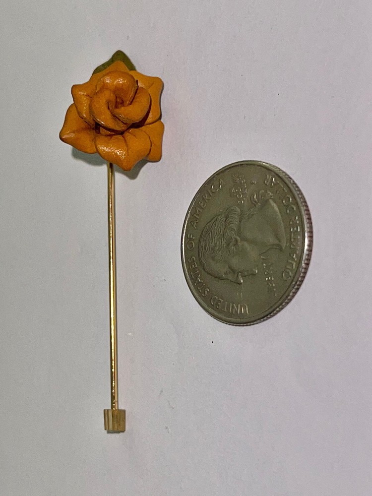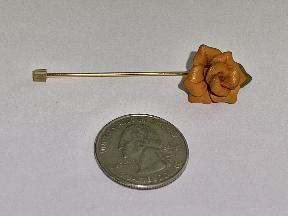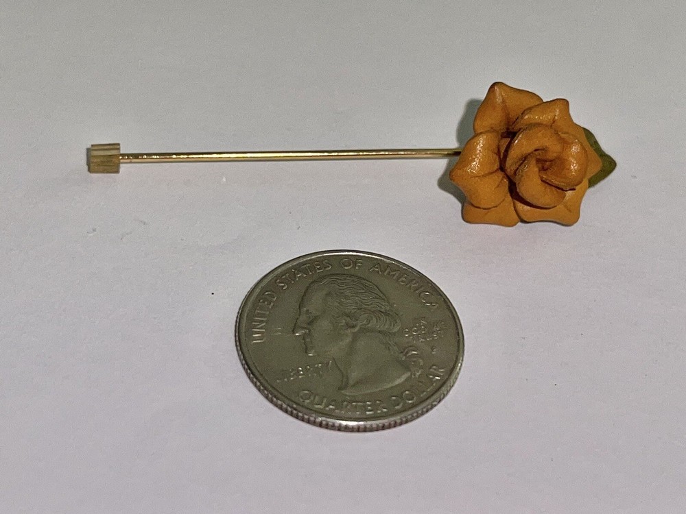 This auction is for a Vintage Mid Century Mod Tooled Leather Burnt Orange Rose & Leaf Stick Pin….. measures approx 2” long …..the rose measures 5/8” at its widest and 3/4” longest…..unmarked …..preloved…..please see all my photos as they are part of my description …… I have other jewelry on Ebay and happily combine shipping.. Questions - please email me before auction ends. Winning bidder to pay shipping, handling of first class mail padded envelope. .... International buyers will pay at a different rate....Payment is due within 24 hours of auctions end …..THESE TERMS ARE NOT NEGOTIABLE AFTER AUCTION ENDS..... International Buyers – Please Note: * Import duties, taxes and charges are not included in the item price or shipping charges. These charges are the buyer's responsibility. * Please check with your country's customs office to determine what these additional costs will be prior to bidding/buying. * These charges are normally collected by the delivering freight (shipping) company or when you pick the item up – do not confuse them for additional shipping charges. * We do not mark merchandise values below value or mark items as "gifts" - US and International government regulations prohibit such behavior. OTHER IMPORTANT INFORMATION Most of the items I offer are bought on the secondary market and therefore I do not know the history behind them. I strive to purchase and sell only quality items and once they come to my home they are stored in a clean, smoke-free environment. I will do my best to describe each item, pointing out any missing items, minor flaws, etc. however, being only human - there may be an occasion when something has been overlooked. It is never my intention to deliberately withhold information or misrepresent the item in anyway. Please keep in mind these items have been previously owned and are not new. Please review the description and the pictures carefully and if I can answer any questions or provide you with additional photos please do not hesitate to e-mail me before bidding