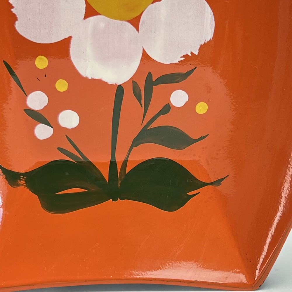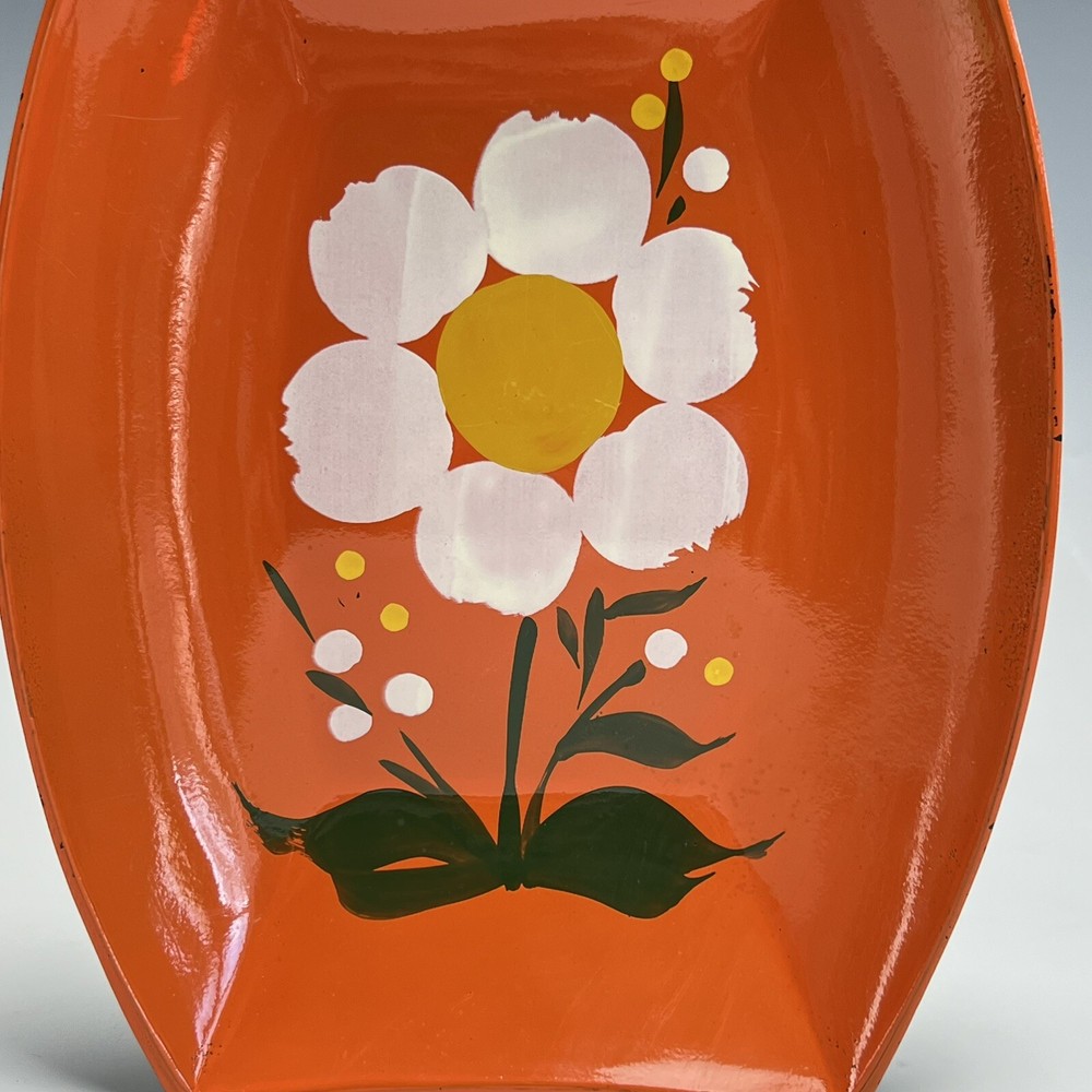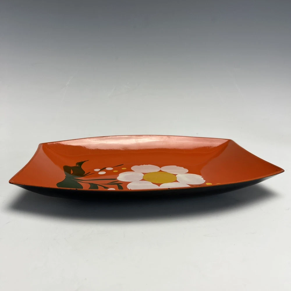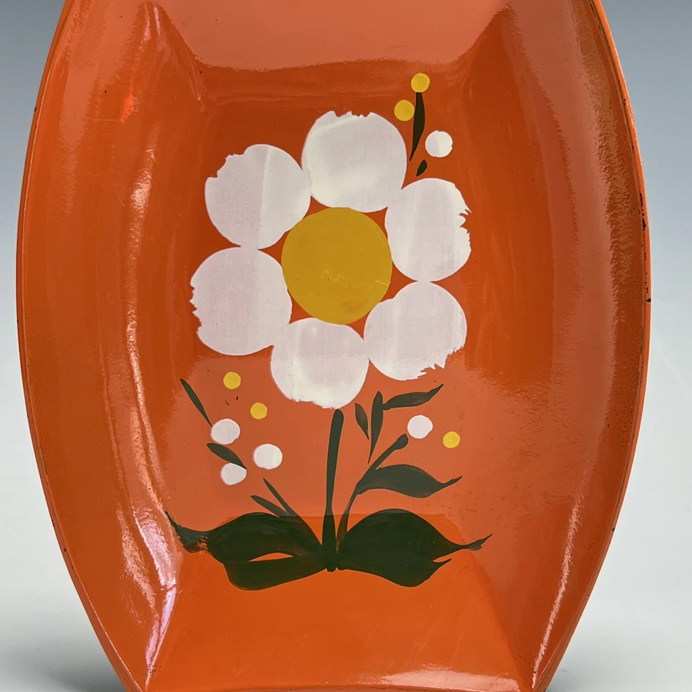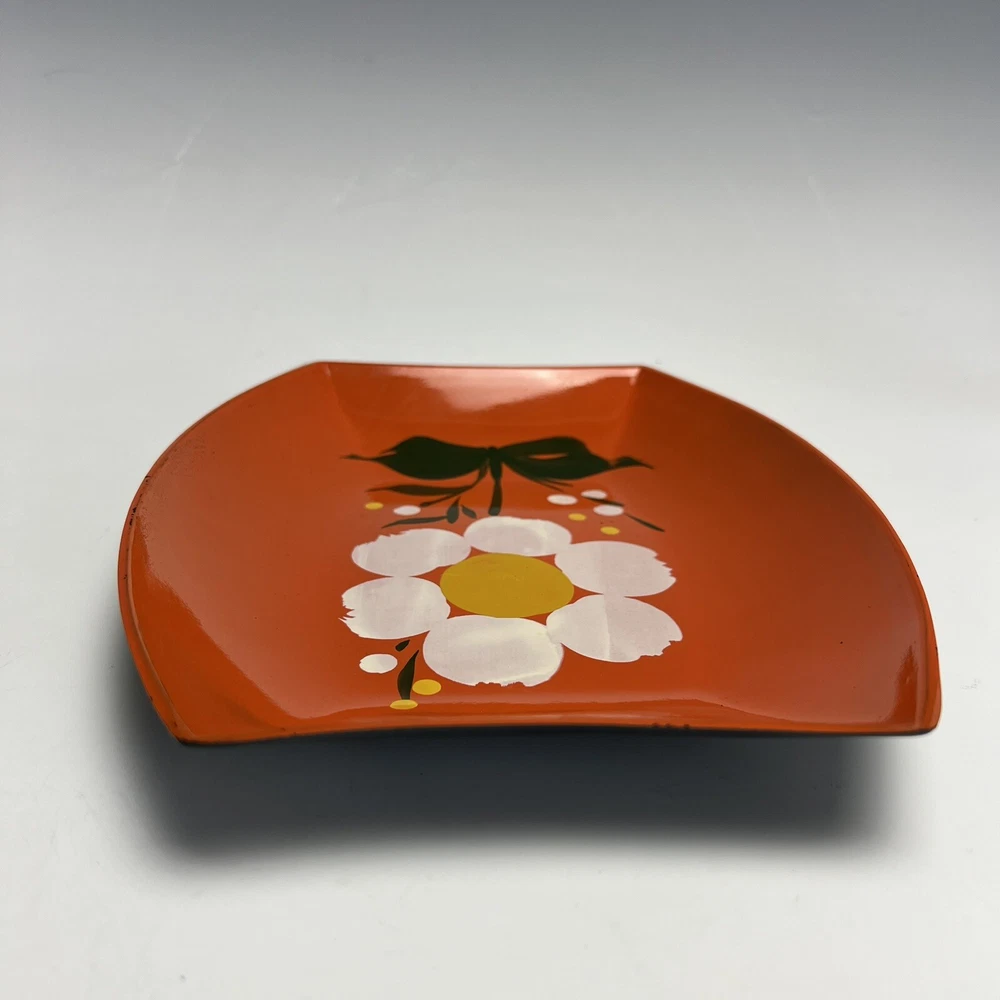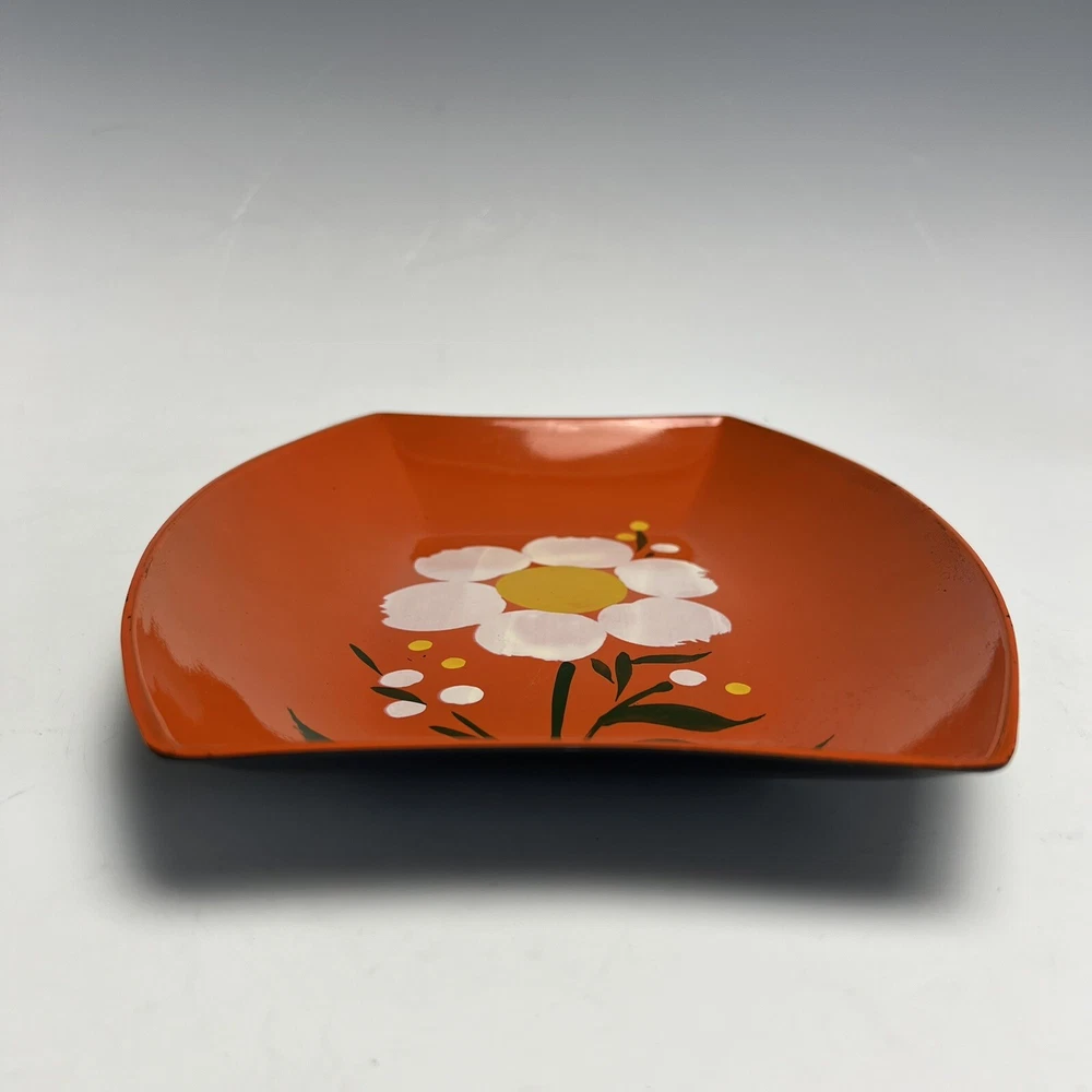 Vintage Mid Century Modern 1960s Flower Orange Plate Lacquer Ware Davar? Lovely hand painted orange tray with large White Flower motif. Measures: 9 7/8" x 7.75" AI Description: This vintage plate with a mid-century modern style is truly a unique piece of art. The beautiful flower design on orange colored tray is a perfect addition to your collection. With its timeless design, this plate adds an elegant touch to your kitchen or dining room. It is perfect for serving your favorite dishes or as a decorative piece on your shelves. Don't miss out on the opportunity to own this beautiful vintage piece.