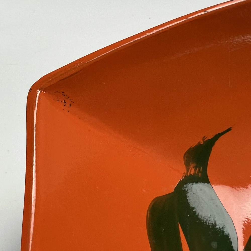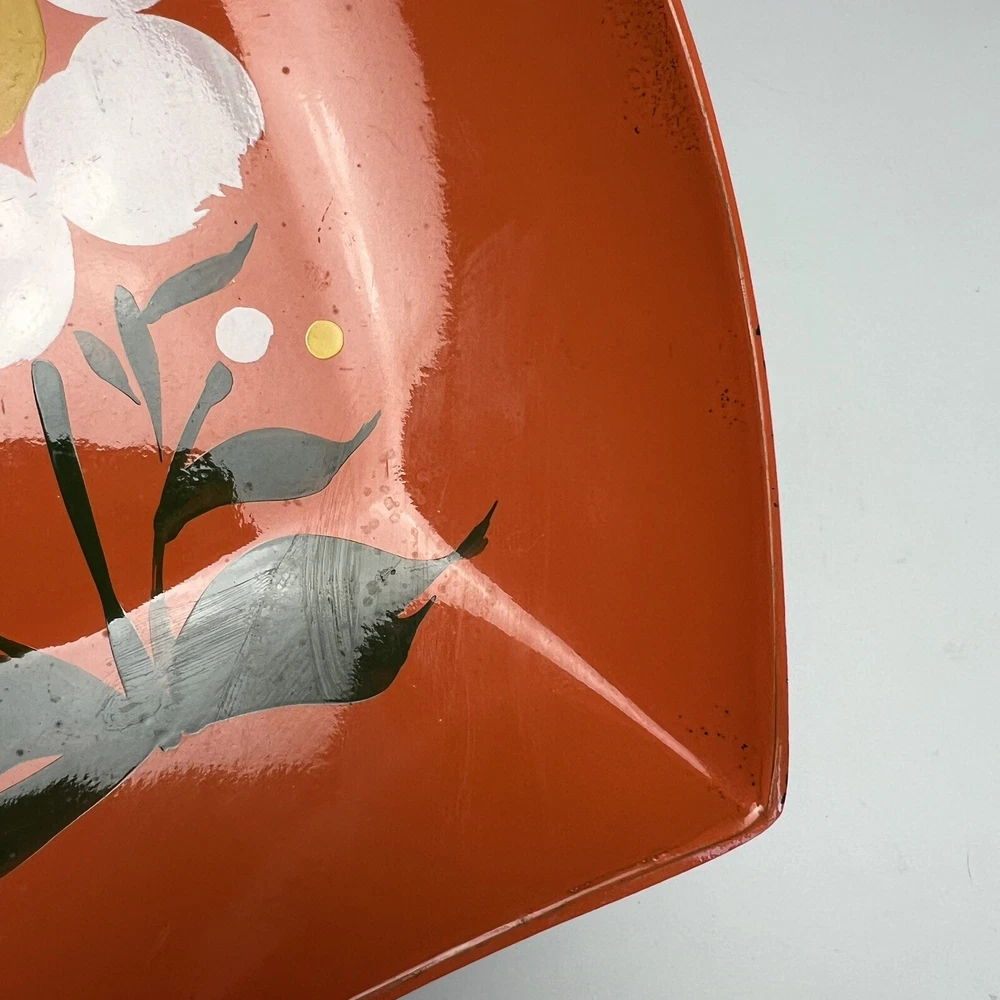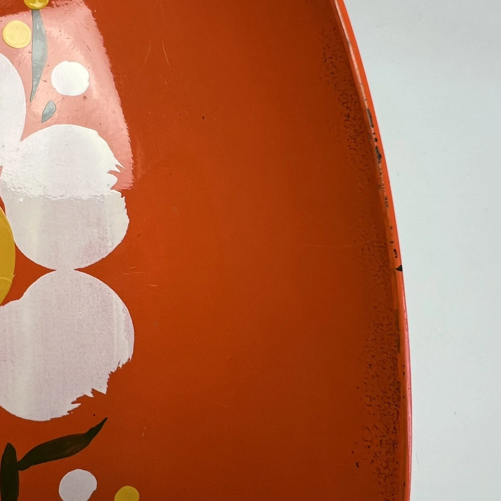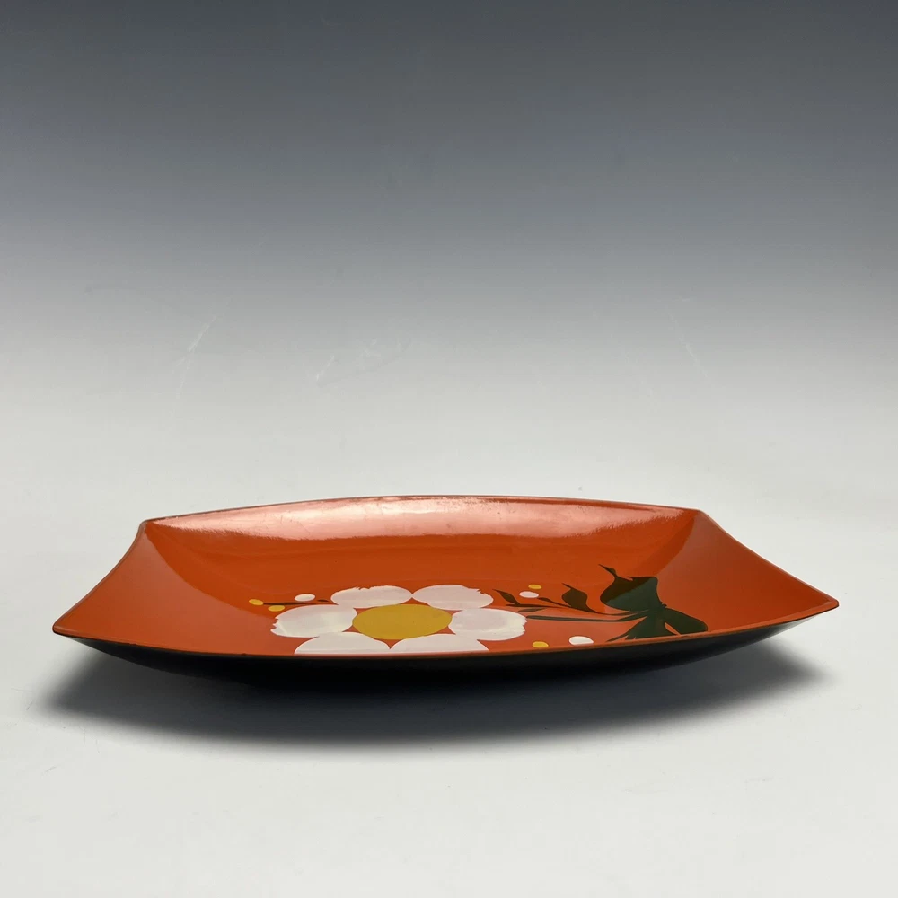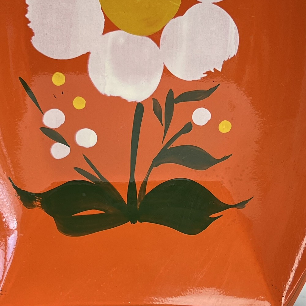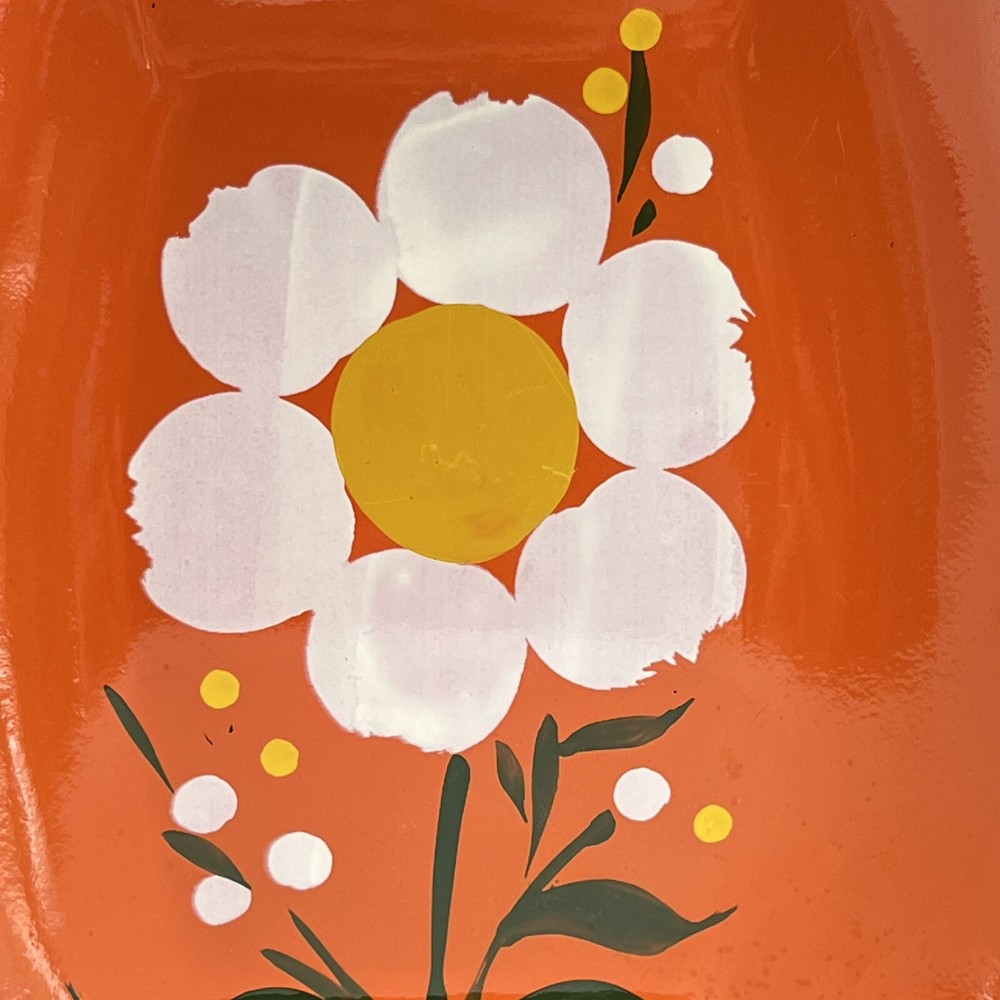 Vintage Mid Century Modern 1960s Flower Orange Plate Lacquer Ware Davar? Lovely hand painted orange tray with large White Flower motif. Measures: 9 7/8" x 7.75" AI Description: This vintage plate with a mid-century modern style is truly a unique piece of art. The beautiful flower design on orange colored tray is a perfect addition to your collection. With its timeless design, this plate adds an elegant touch to your kitchen or dining room. It is perfect for serving your favorite dishes or as a decorative piece on your shelves. Don't miss out on the opportunity to own this beautiful vintage piece.