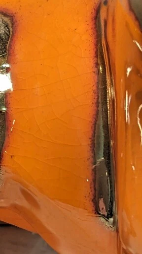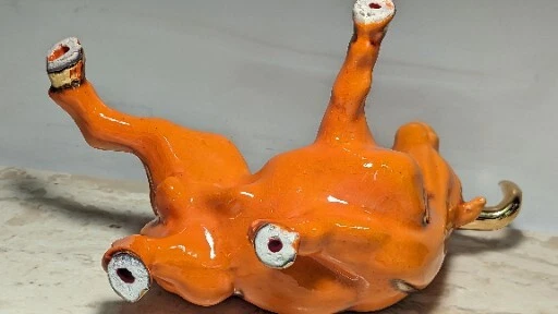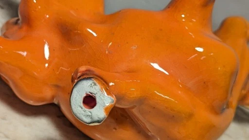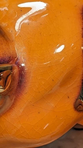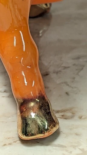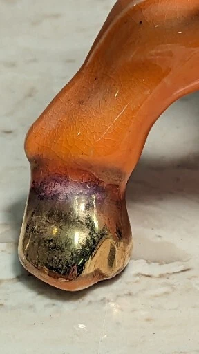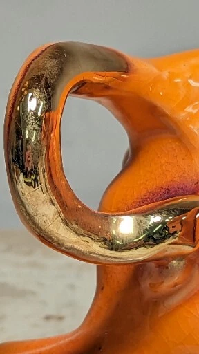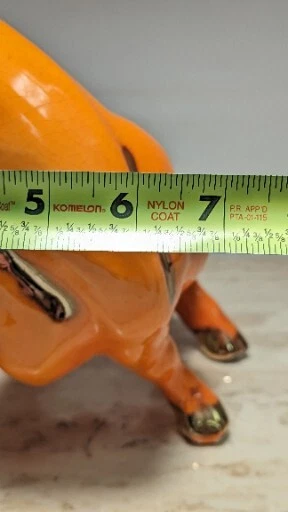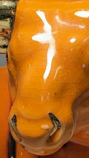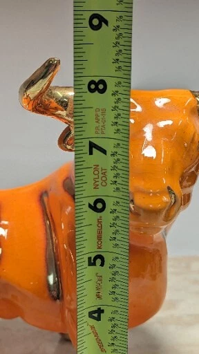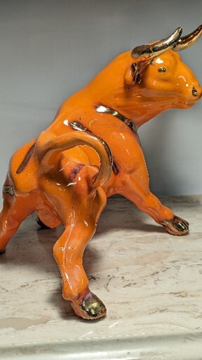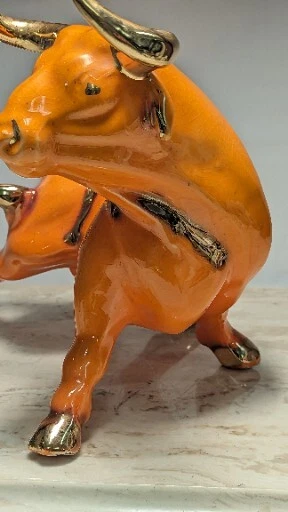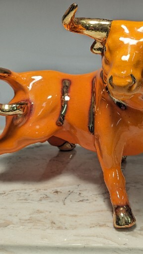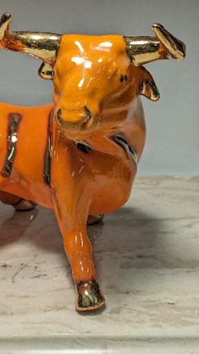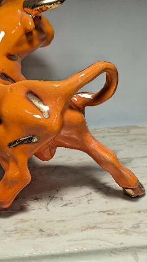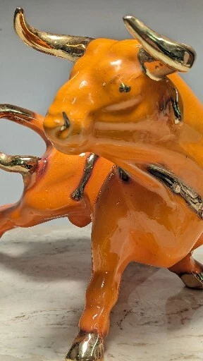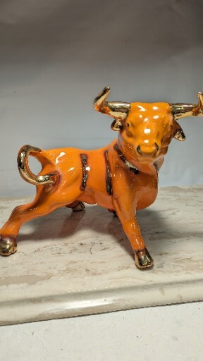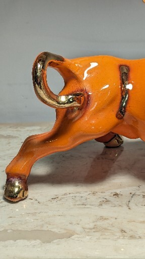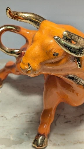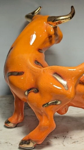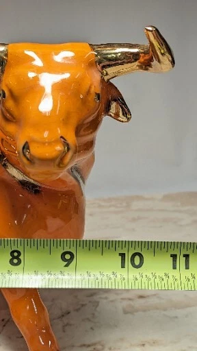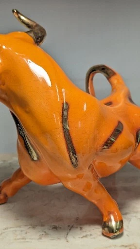 This vintage mid-century modern figurine is a stunning piece that captures the spirit of the 1950s. The charging bull is made of ceramic with a glossy orange and gold finish that gives it an eye-catching look. Measuring 11 inches in length, 8.25 inches in height, and 8 inches in width, this figurine is a medium-sized piece that will fit in any room. There is crazing from age, but there are no chips or cracks. The bull figurine is perfect for collectors of decorative items and fans of animals. It was manufactured in the United States in the mid-20th century (1950-1959) and has a timeless style that will never go out of fashion. This figurine is in excellent condition and will make a great addition to any collection. M 3.