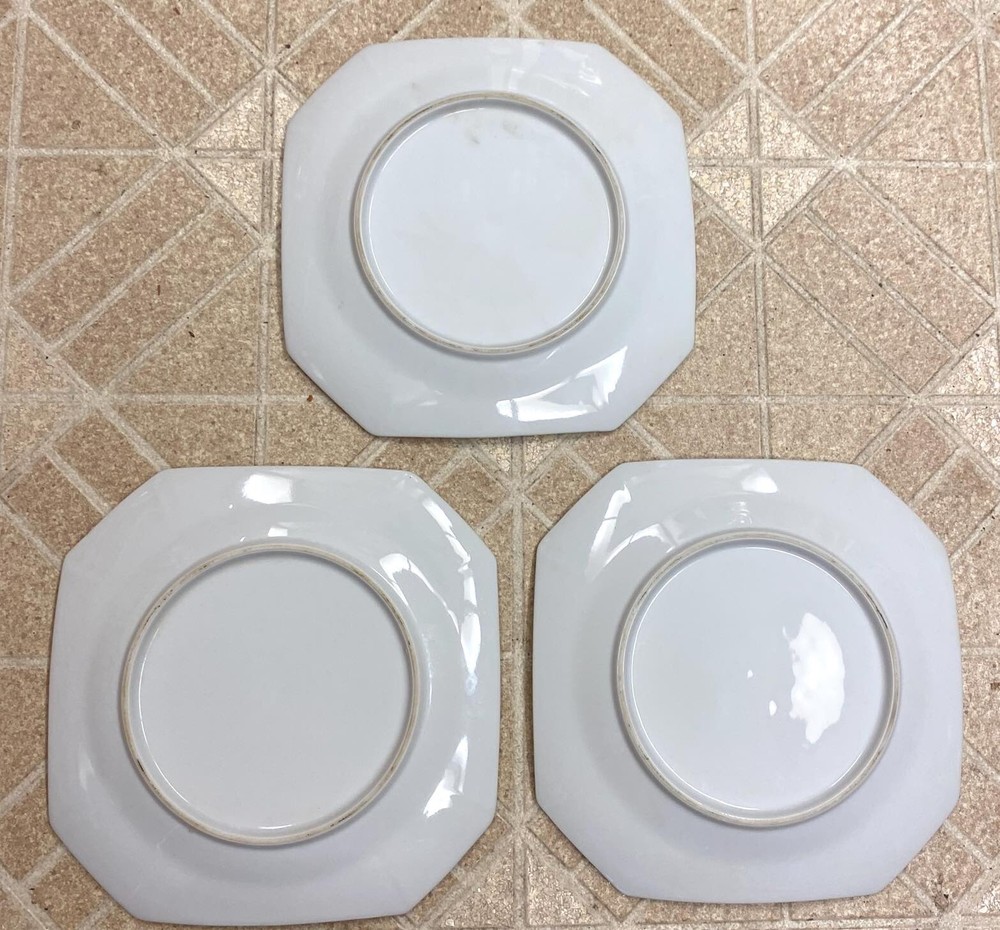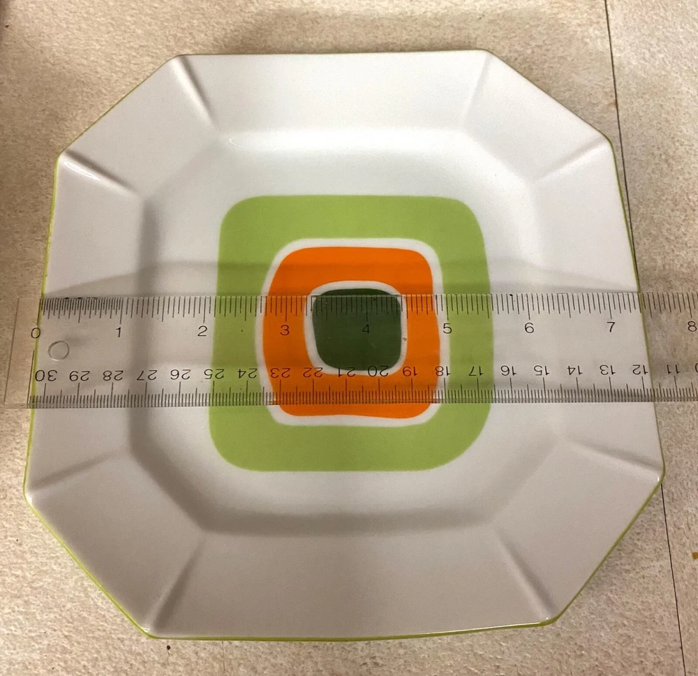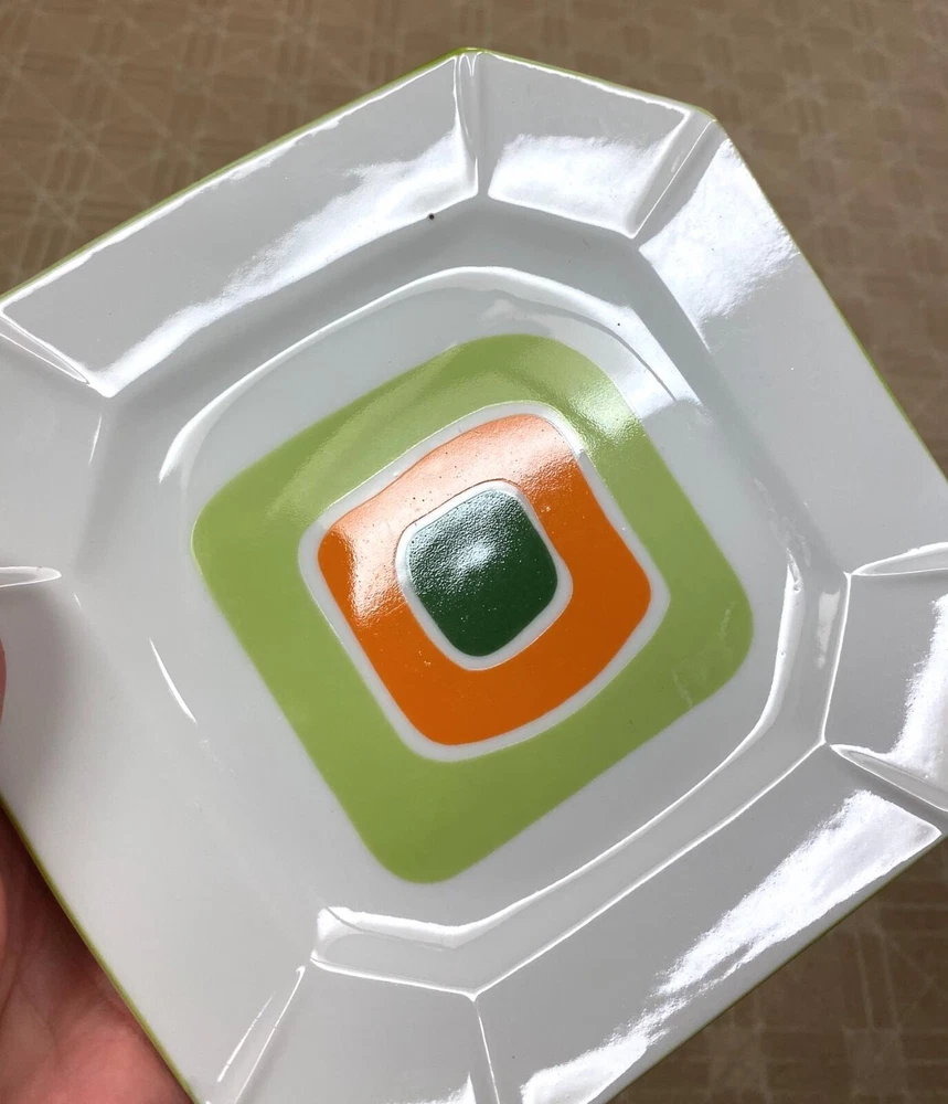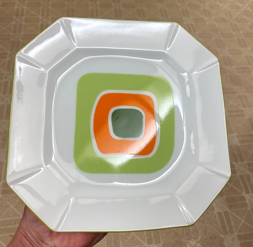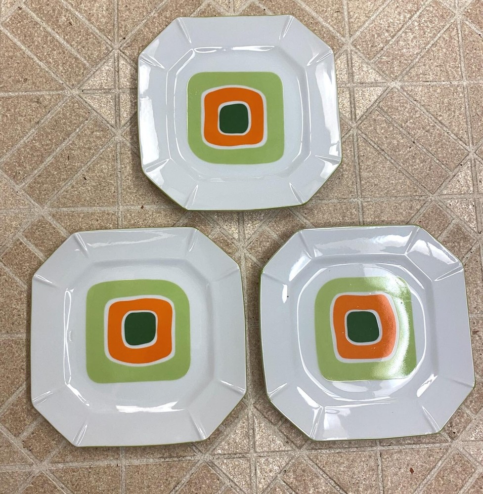 Vintage Mid Century Modern Abstract Square Green Orange 7.5” Plate Set Set of three, ca.1950s square plates. They measure 7-1/2” and have a super cool shades of green and orange, geometric design. One has a tiny black dot (original to the plate) and one has a small, glaze miss line (original to the plate) please see close ups. I doubt if these were used at all. Excellent condition, very groovy and would make a super addition to any vintage/modern kitchen collection! Comes from a smoke-pet free home. Shipping within the USA is $12.75 Please take a moment and look over my other estate and bargain auctions! I'LL BE GLAD TO COMBINE SHIPPING!! We guarantee all of our merchandise to be as described! All sales are final so please e-mail me if you have further questions. Thank you for looking and enjoy the auction!