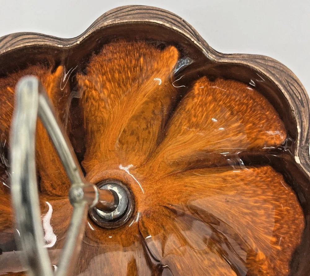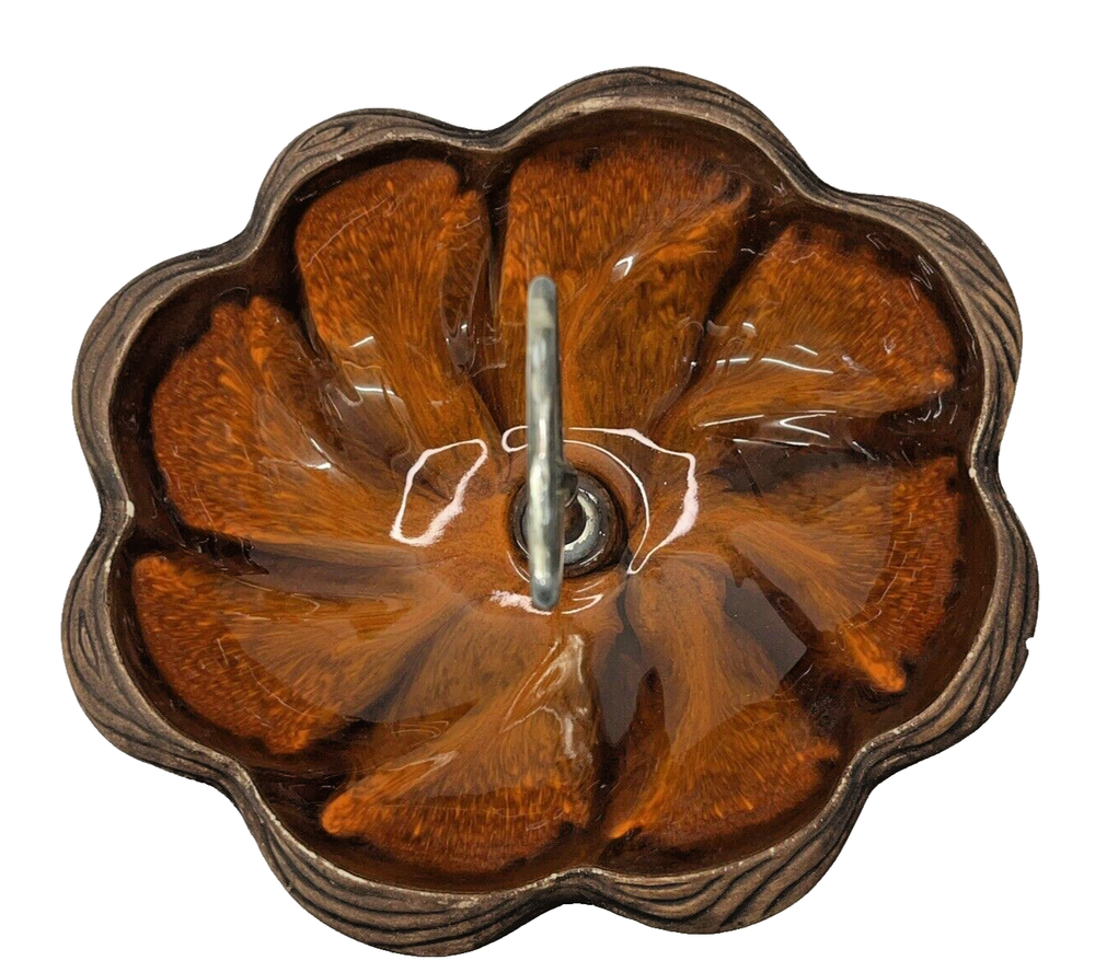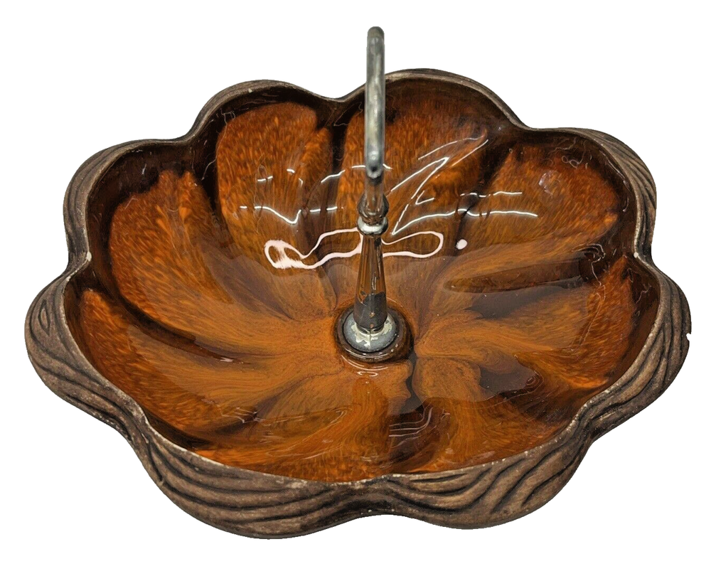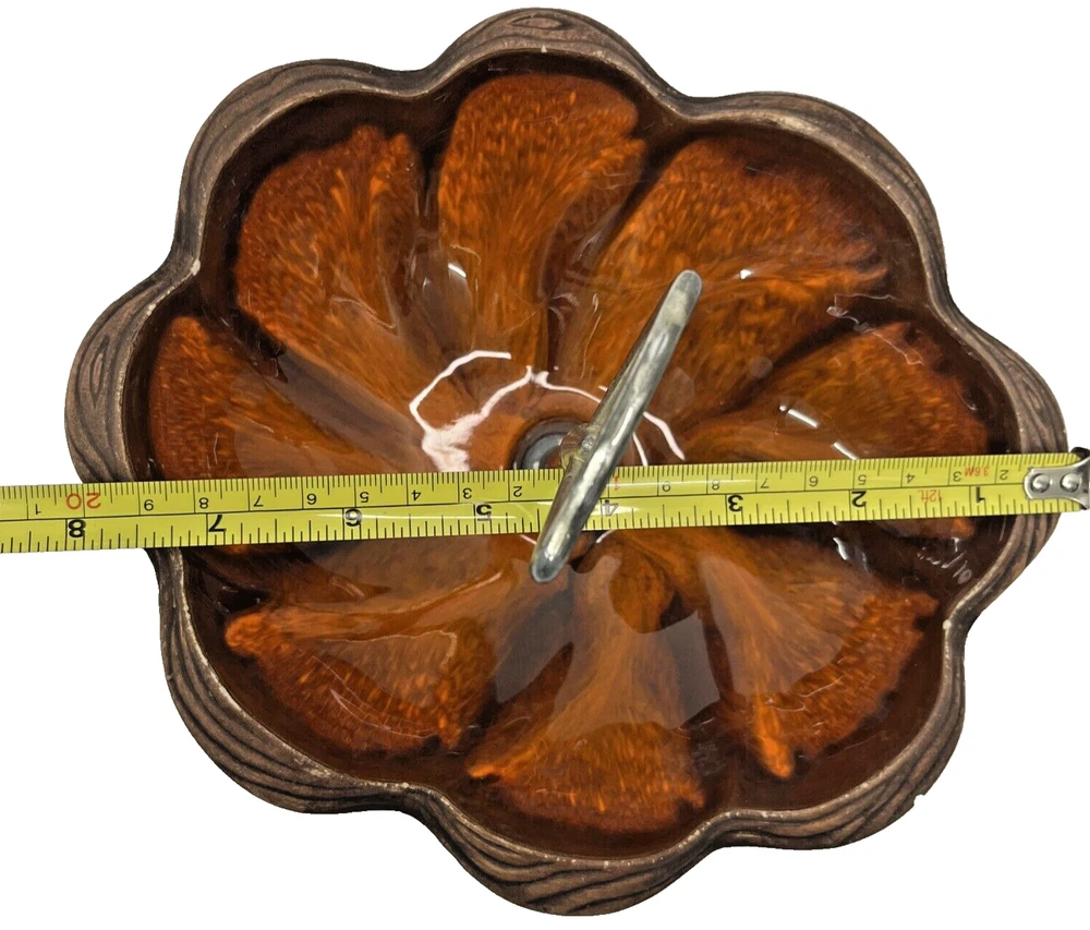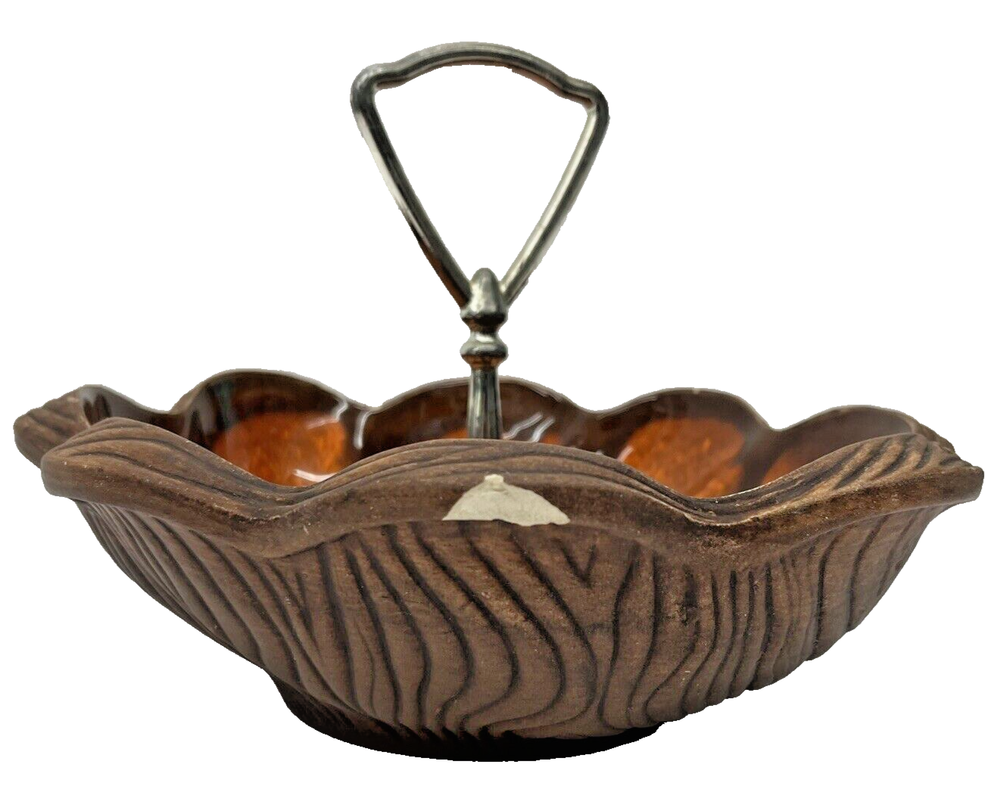 Vintage Mid Century Modern Candy Nut Bowl Orange California Pottery 7205 USA. Has A Chip On The Bottom Of The Rim Of Dish. Some Silver Has FLaked Off The Handle. See Pictures. Thanks For Looking!
