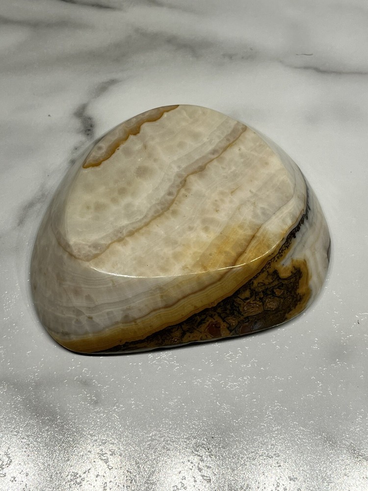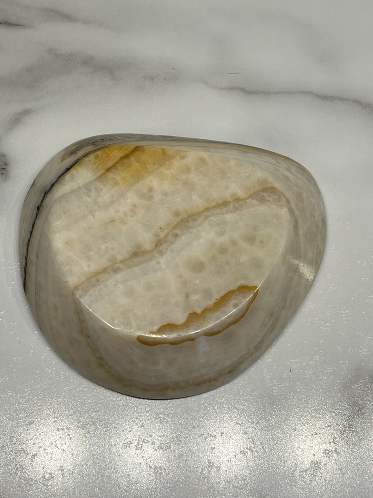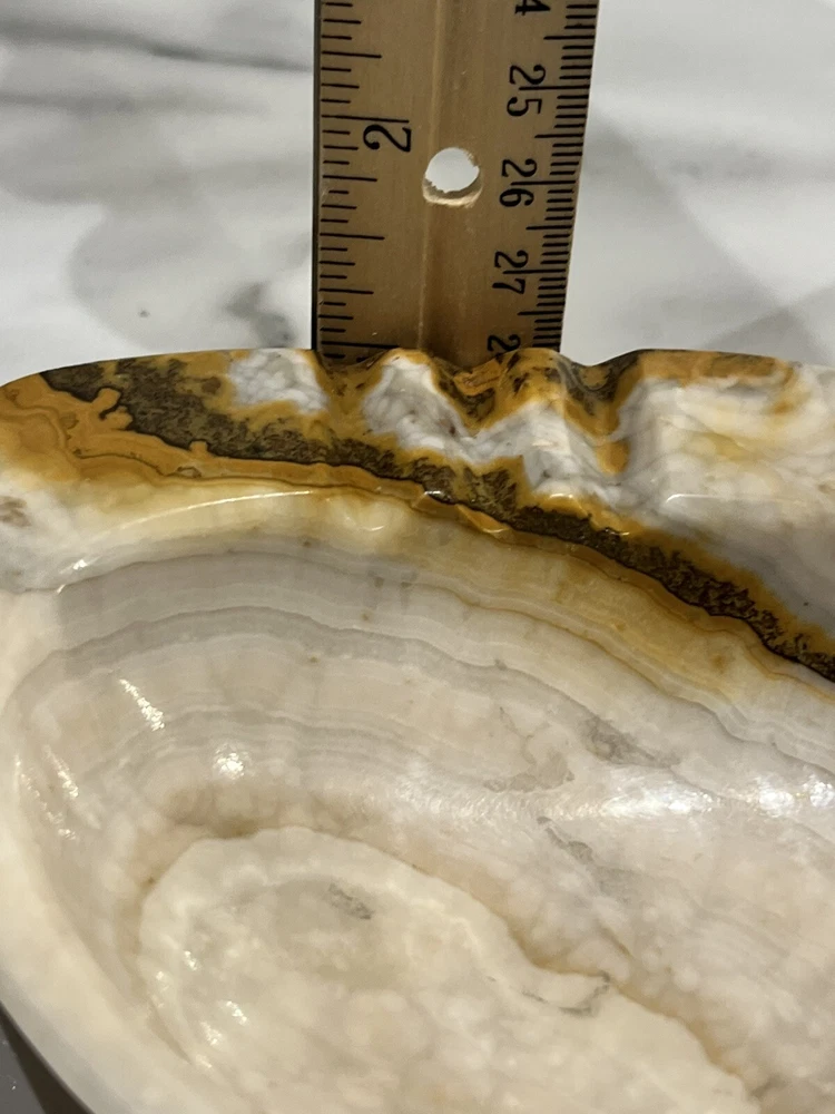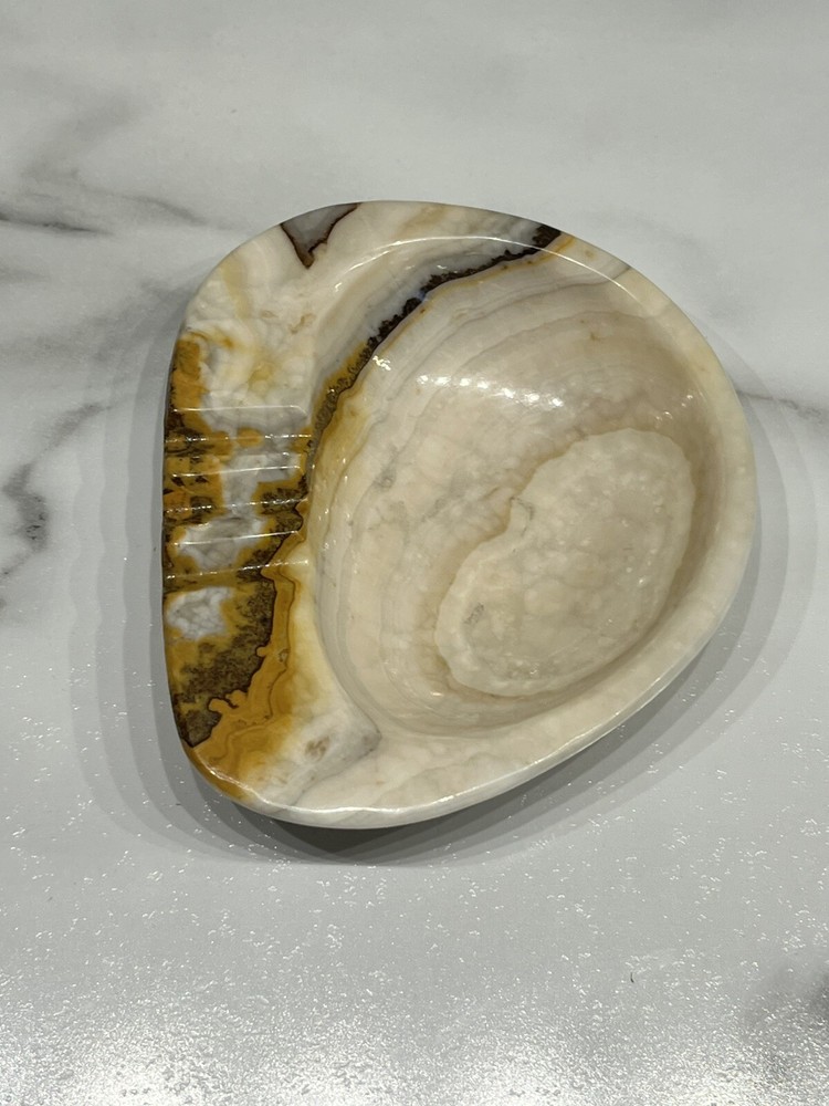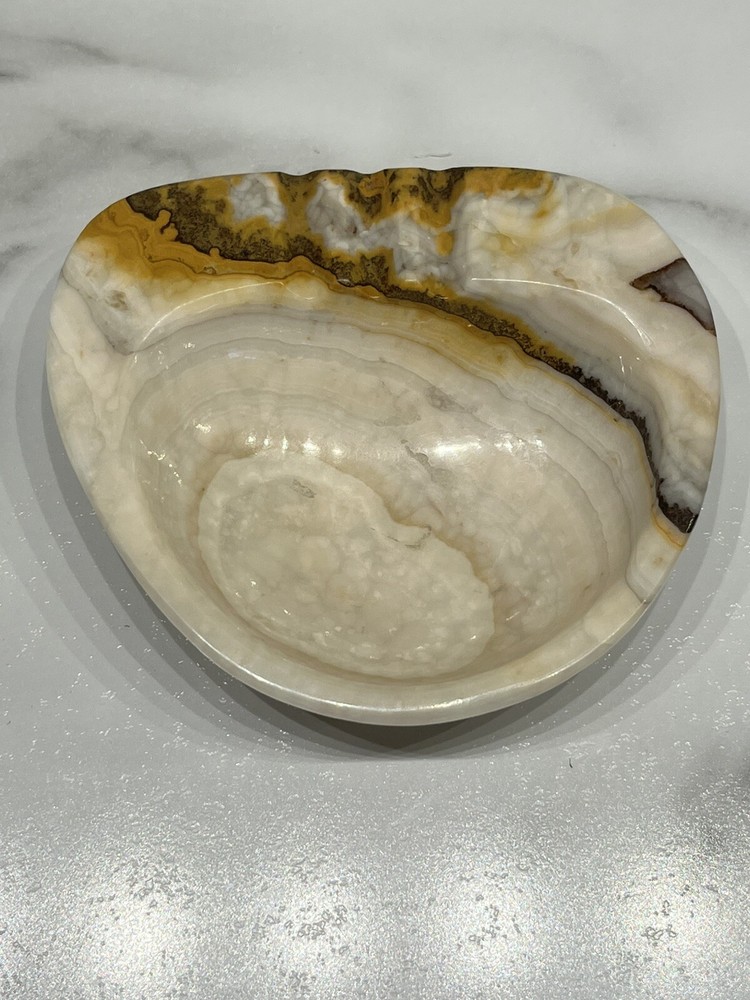 This is a vintage Mid Century Modern carved alabaster stone ashtray in shades of browns and orange. It is handmade and designed suitable for use as an ashtray. The ashtray has a unique and stylish appearance, making it a collectible item in the category of Tobacciana. Be sure to check out my other vintage items for sale in my store. In good preowned condition. Comes from a smoke free home. Please ask questions and inspect pictures as they are the best representation of the condition. Sorry no returns.