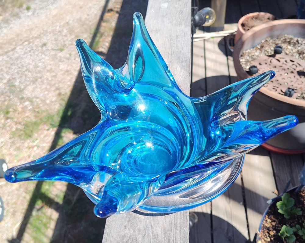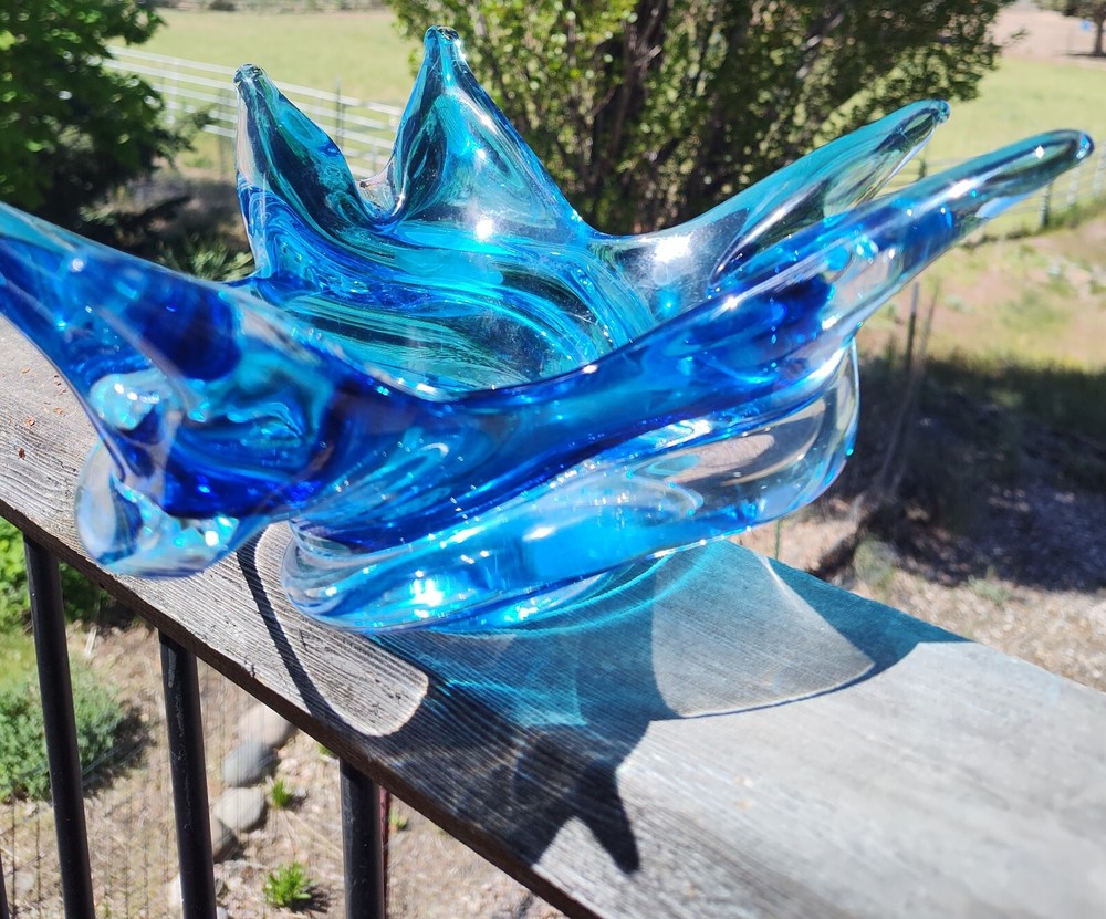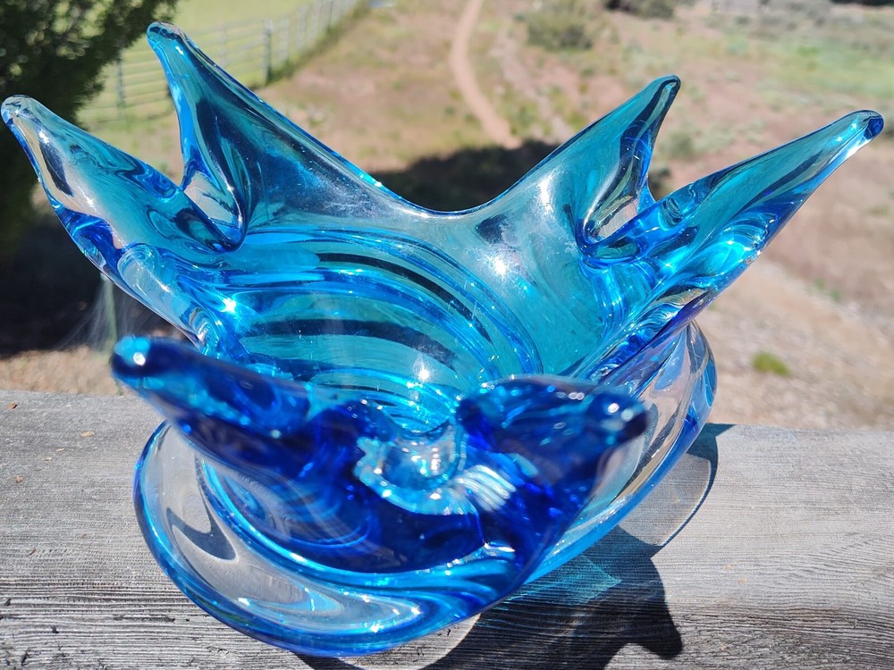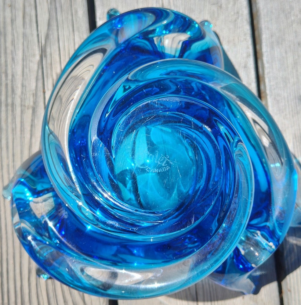 The Chalet company was founded by creative Murano immigrants in the 1940's who were unhappy with the restrictions placed on them by the then-prevailing glassmakers in Italy. Add a touch of vintage charm to your home decor with this stunning mid-century modern Chalet Art Glass bowl. The unique blue and clear glass composition, along with the swirl pattern, makes it a standout piece. The bowl is signed and features an acid stamp backstamp for authenticity. Crafted in Canada, this free-form bowl is a rare find and perfect for any collector. The item measures 8+ inches in diameter and is approx. 5 inches in height and is made of high-quality glass material. This original studio-crafted piece is ideal for display and its decorative features will surely enhance any room.