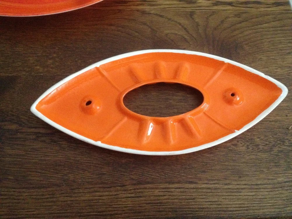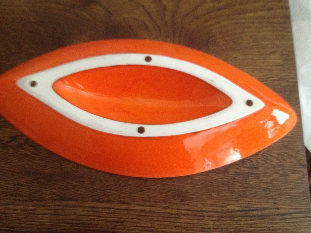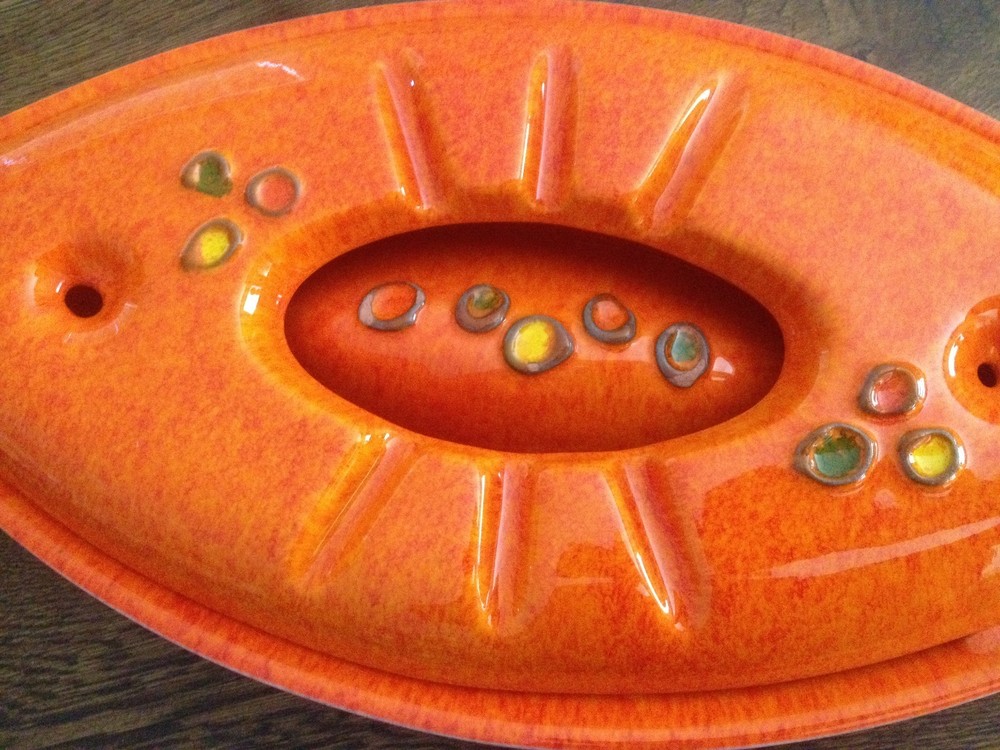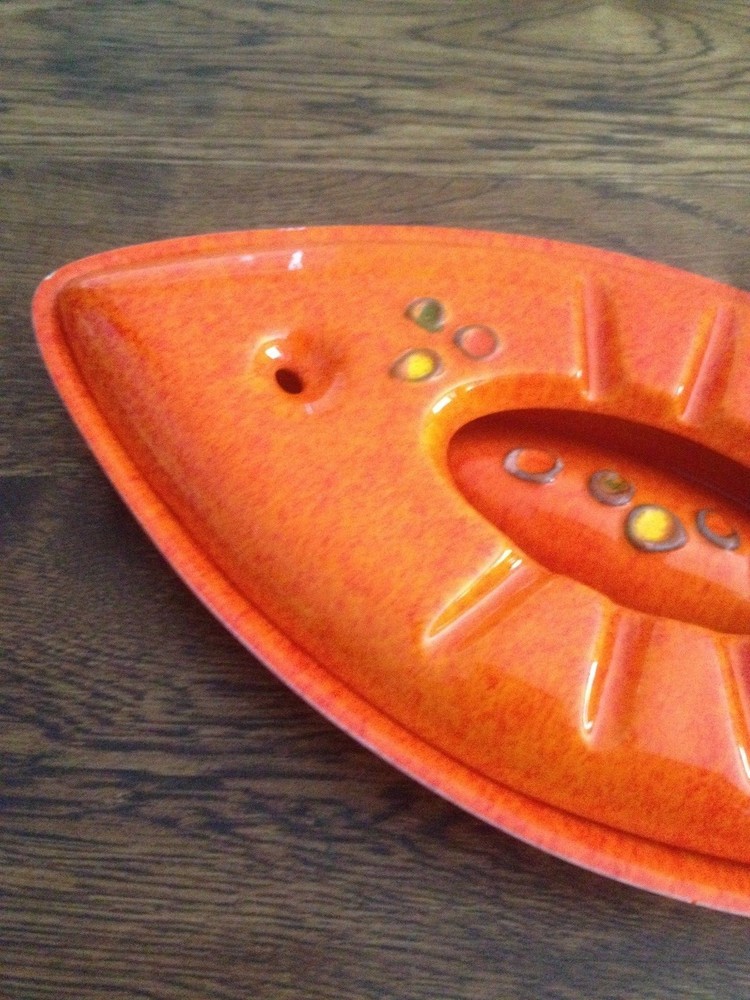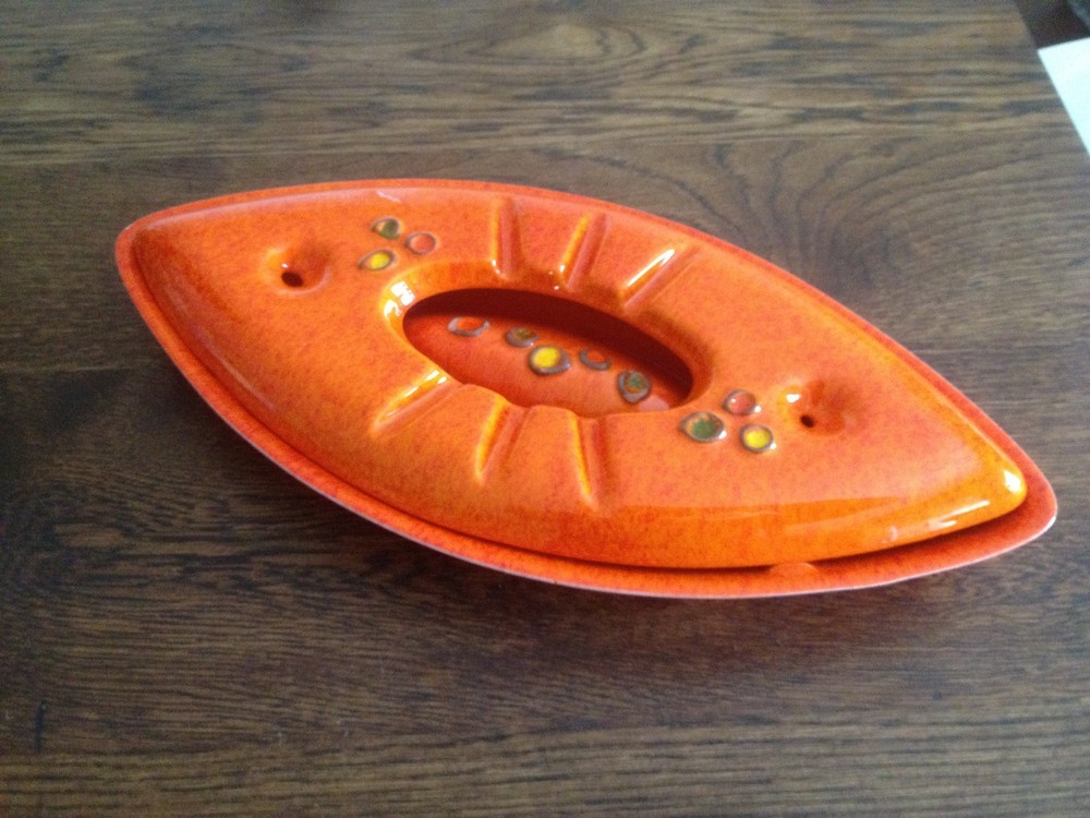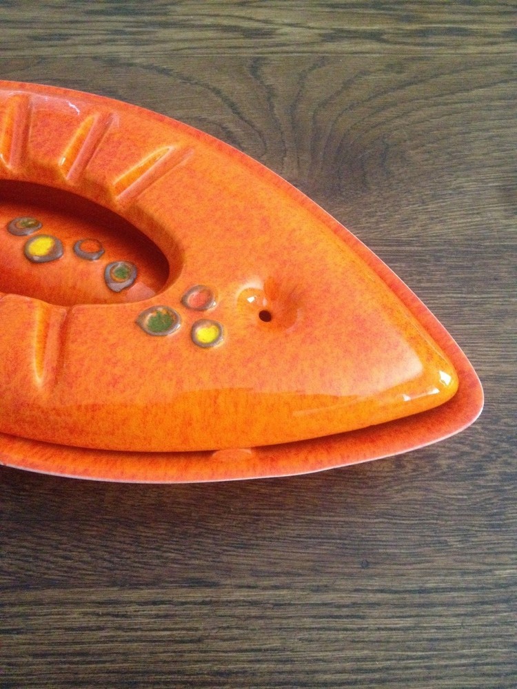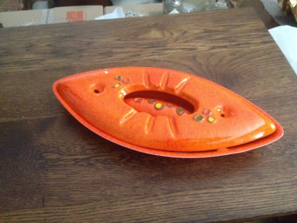 Hi, Up for sale today is this really cool old ash tray.WOW !! is this cool or what?? meas. 17 1/2" long, 8 1/4" wide, 2 1/2" tall. Small nick on one of the tips ,pictured for you, and a chip under the lid on the edge, not very noticeable.I think it is unusual that it is two pieces. I have given you many pictures for your inspection. Any questions feel free!! Thanks for looking!! Wanted to mention any white spots you see are not damage spots, they are reflections.