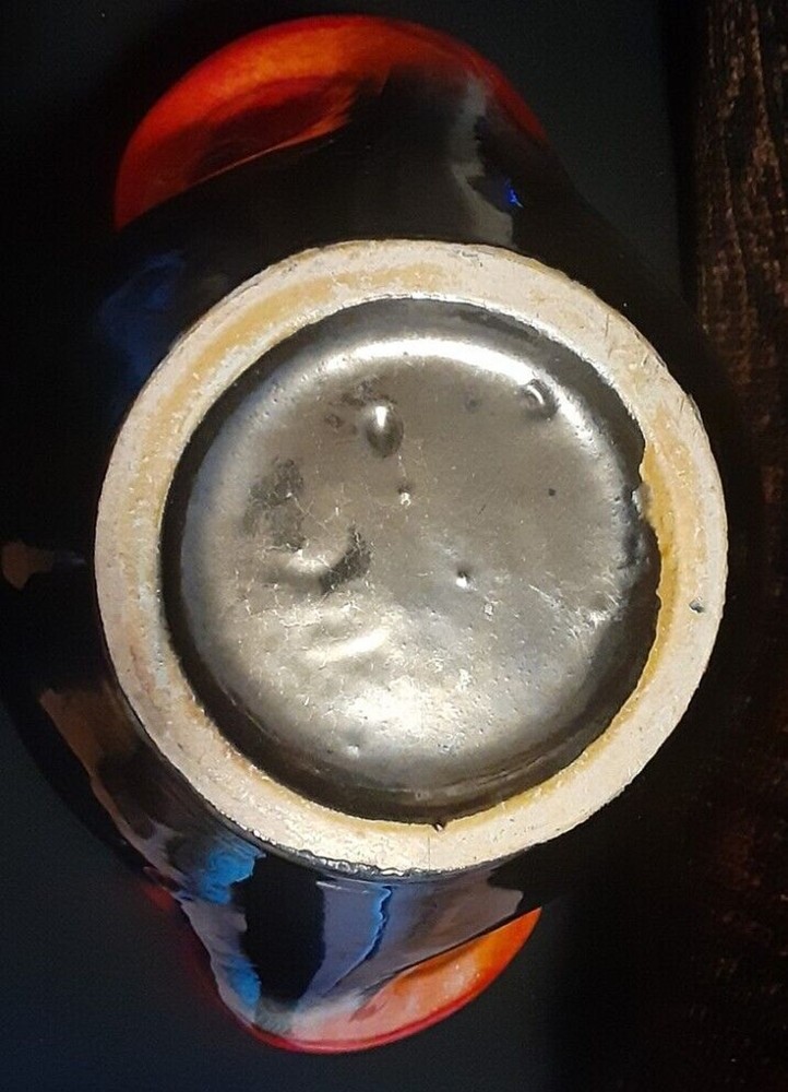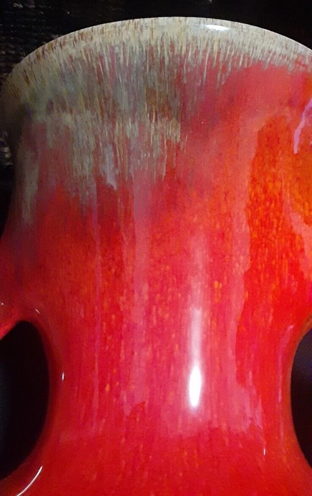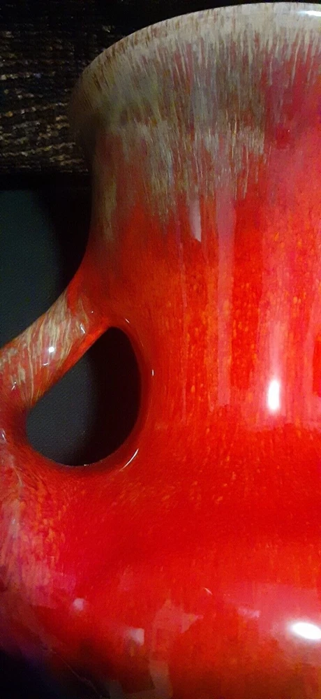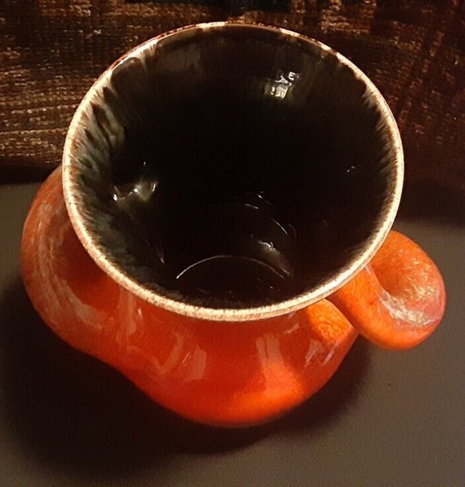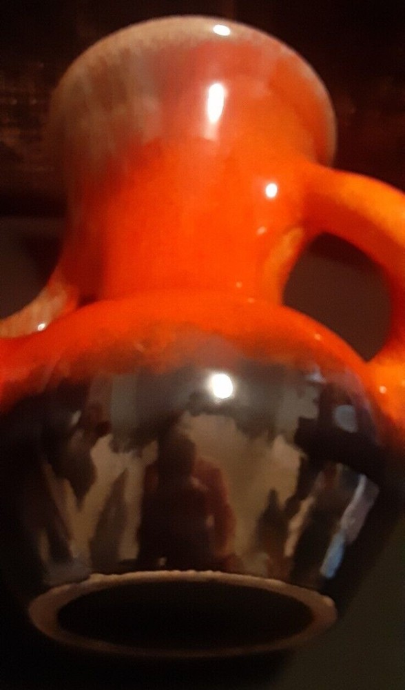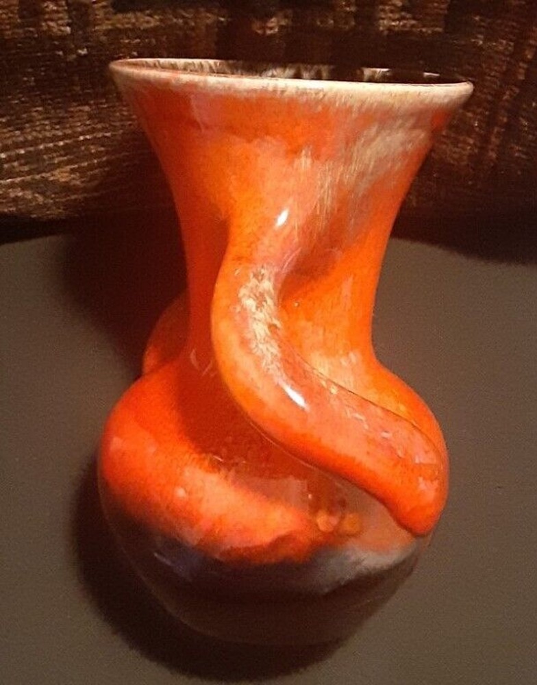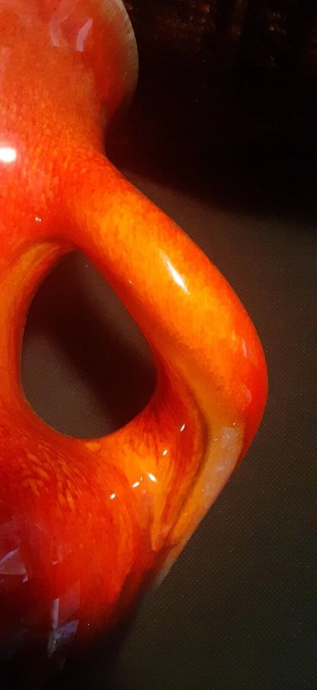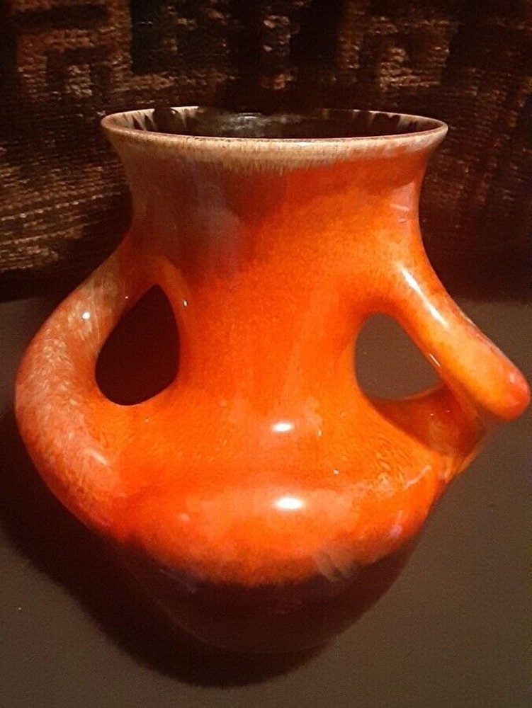 This is an absolutely stunning Mid Century Modern ceramic vase that can light up your room and your conversations. The orange glaze has a tremendous depth that makes it seem to glow, and that gives the impression of glass-like translucence. The lower curve is an iridescent black that blends upward into the orange, giving a lava-like look. The upper rim and handles have an additional smoky yellow-tan speckling that lays smoothly within the orange in a marrow pattern, giving the impression of a rough texture inside of the glassy orange. The handles curve almost sensually around the body as they descend, and they flow seamlessly out of and back into the body of the vase without any abrupt joinings, so that the entire vase is truly a single piece. This is an extremely fine example of Mid Century Modern art. It deserves a lighted shelf in a darkened display alcove, or a central position on an end table where it can be admired and cherished. Height: 9.5" Width Across Handles: 9.5"