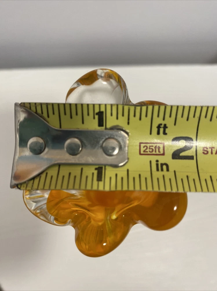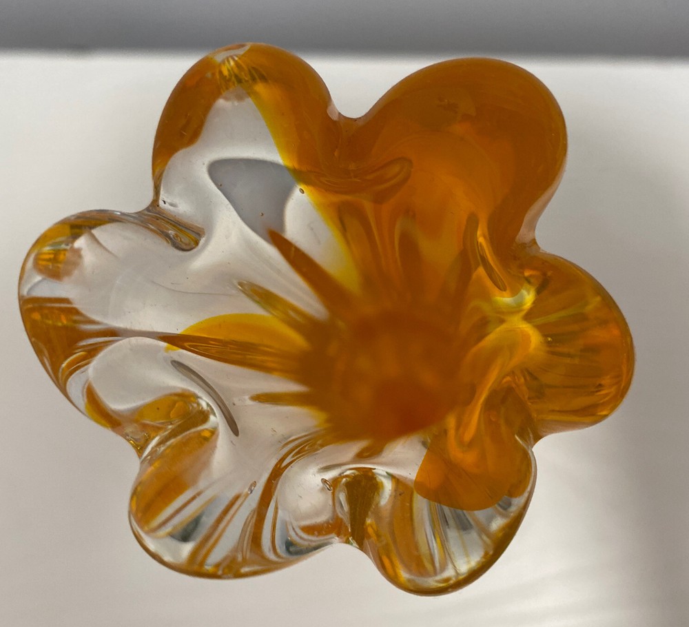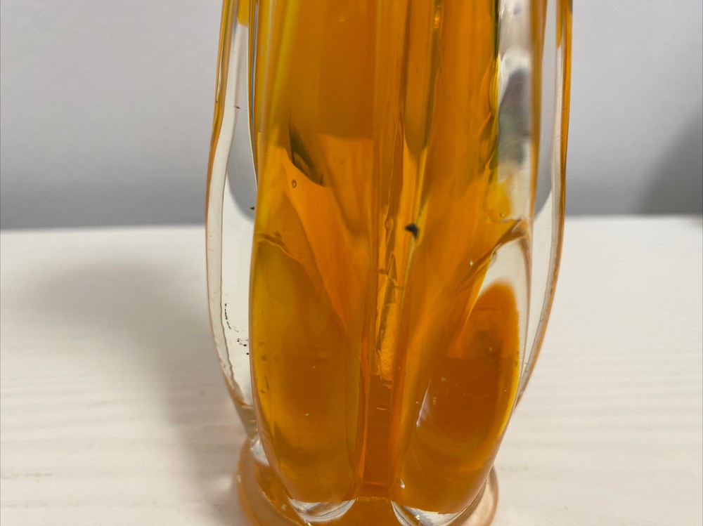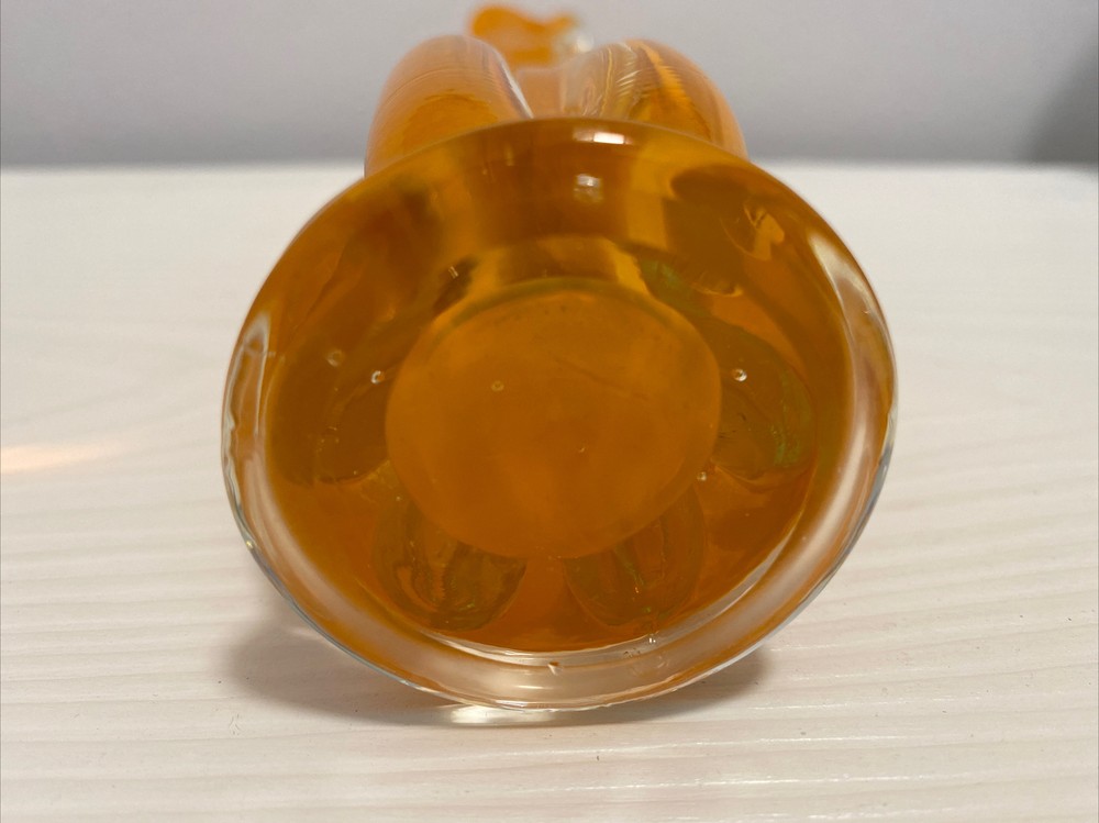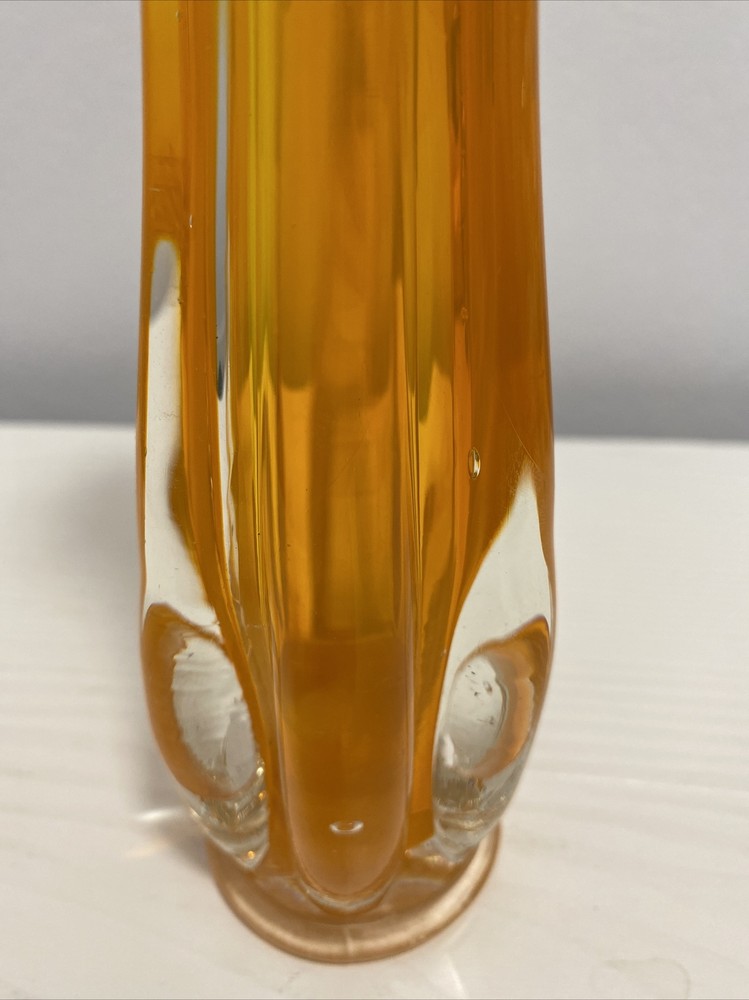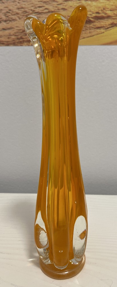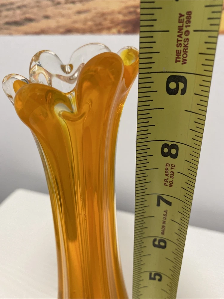 Vintage Mid Century Modern Orange Clear Swung Glass Flower floral Vase EC. From my own personal collection. I purchased this in the 1980s when I lived in Washington state at an antique store. This little guy is pretty darn cute, excellent condition. You can see some of the little air bubbles left over from when this was blown. it also looks like something got blown into the glass by mistake. You'll see it in one of the pictures. It's a little dark spot. The bottom does have a little sticker residue which can be easily wiped off. Check out the photos for measurements, and if you have any questions, feel free to reach out.