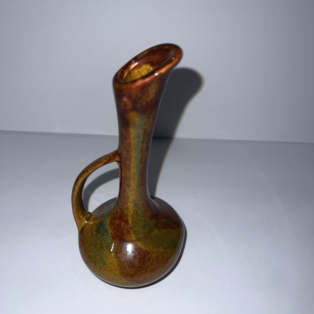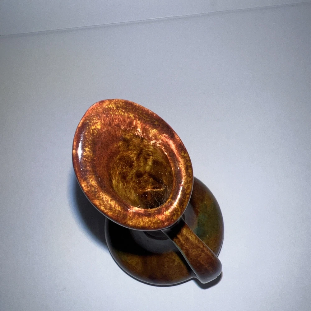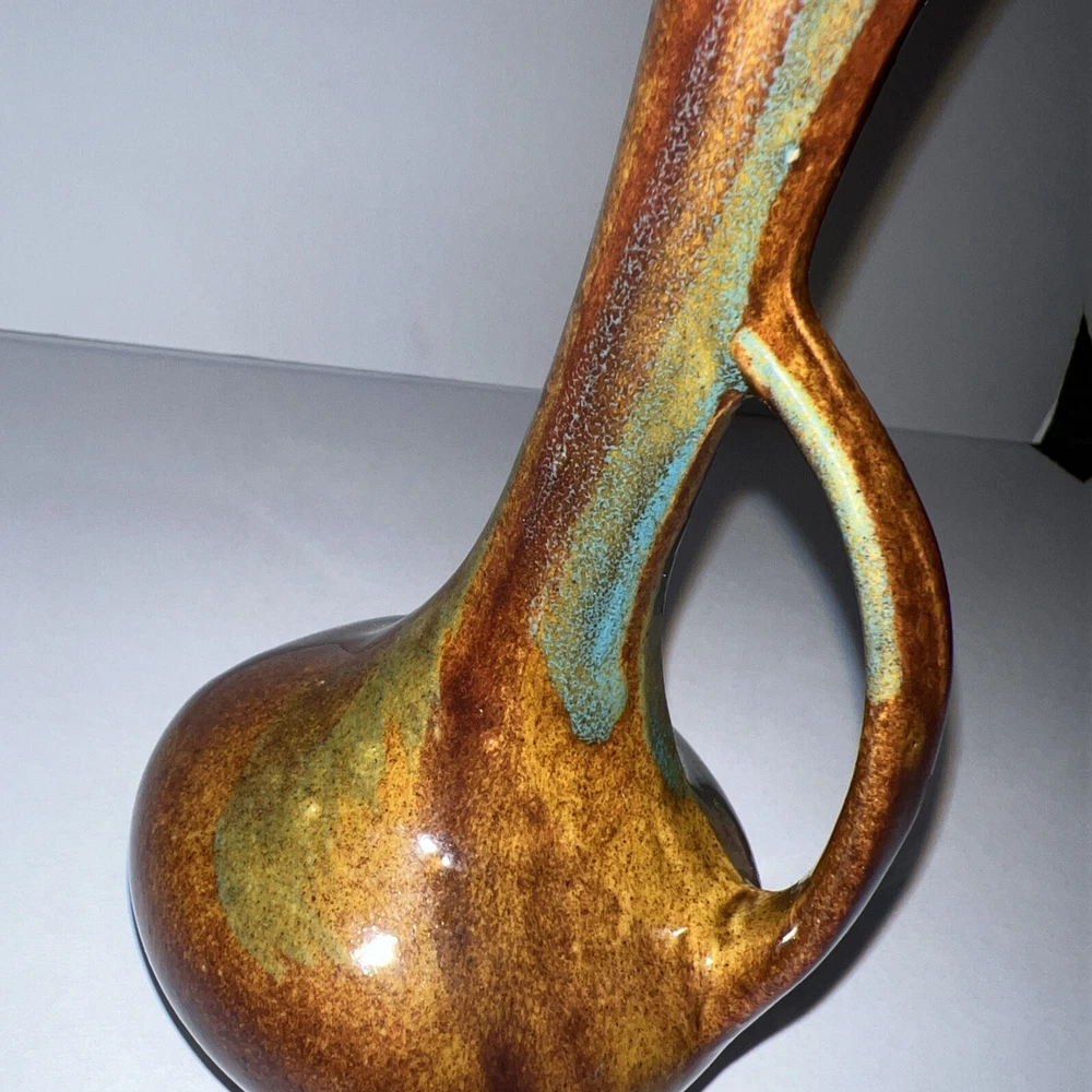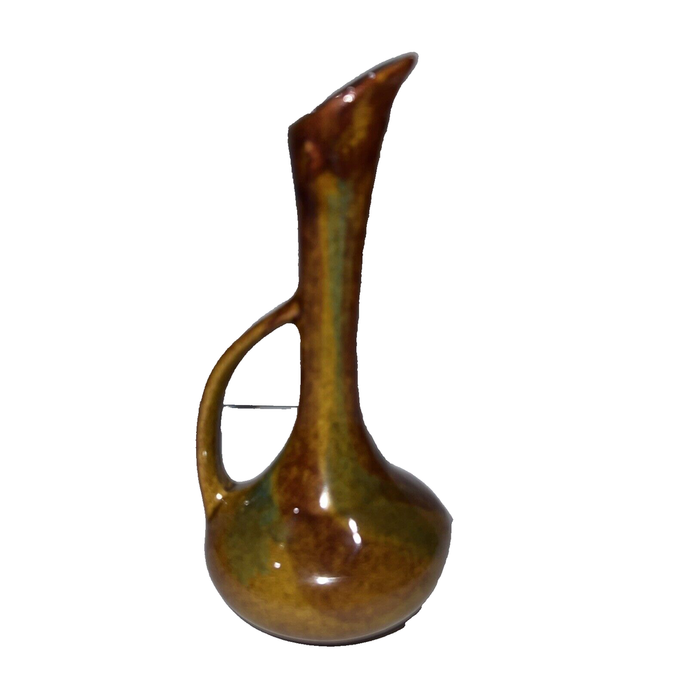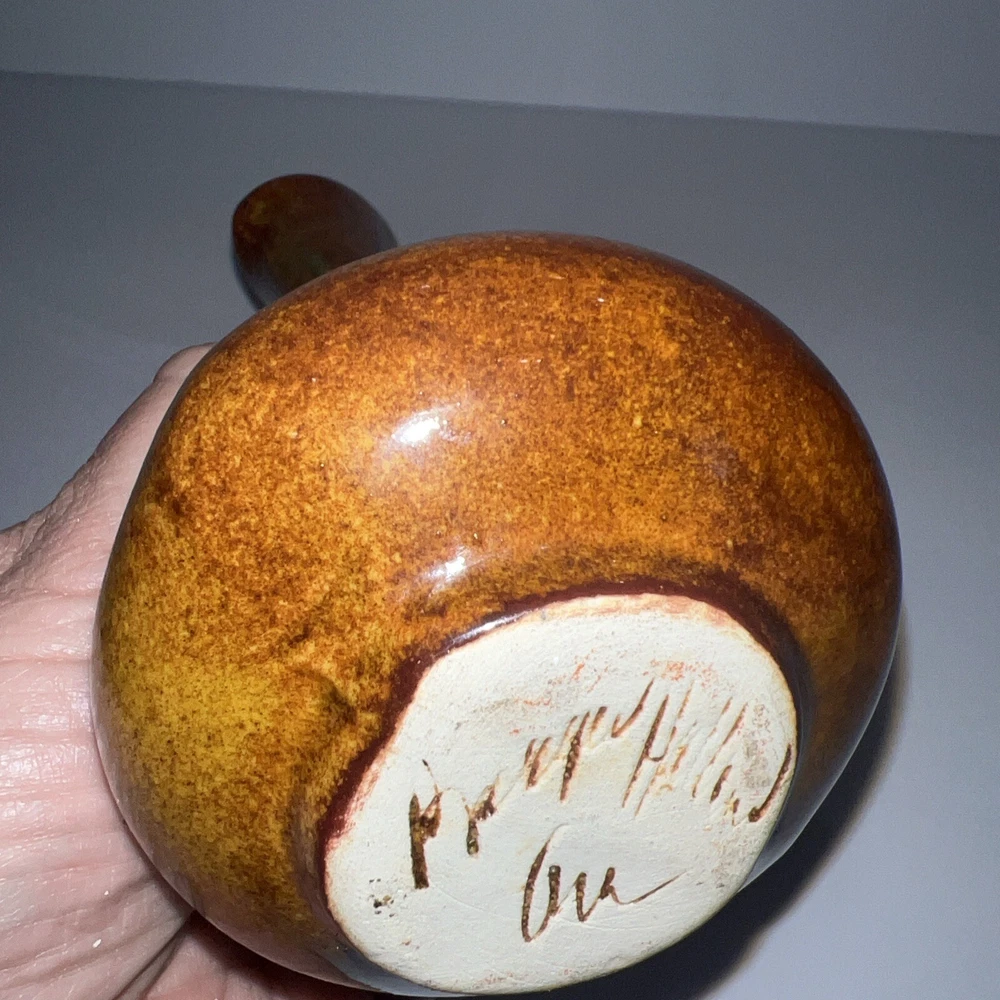 This vintage mid-century modern orange drip glaze pitcher vase is a beautiful addition to any collection. Handmade with ceramic material, it features a unique 1970s style with a glazed finish. The pitcher vase stands at 7.75 inches tall and has one compartment, making it perfect for serving drinks or displaying as a decorative piece. The item is sold in a set of one and is branded by the artist's signature. With its vibrant orange color and vintage charm, this pitcher vase is a must-have for any art or pottery enthusiast.
