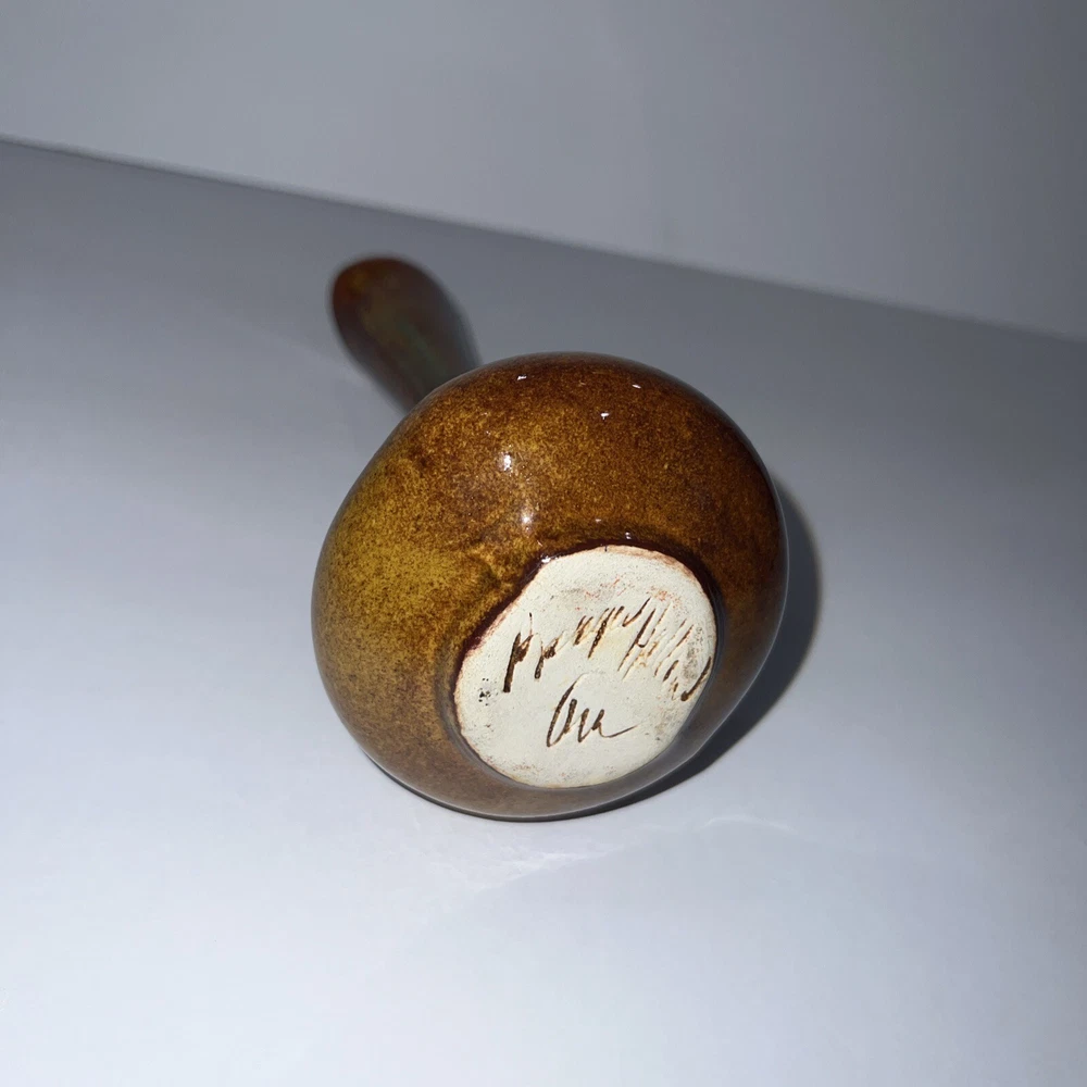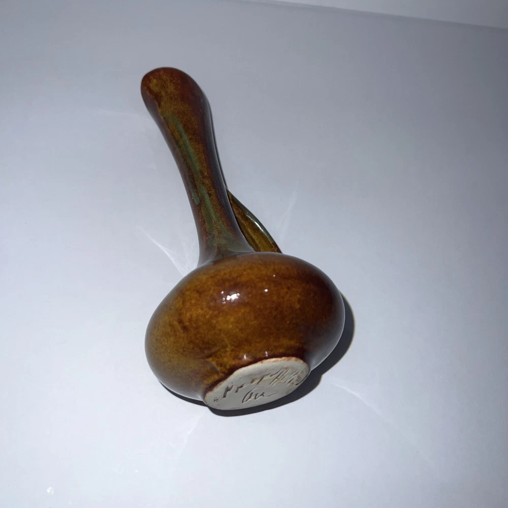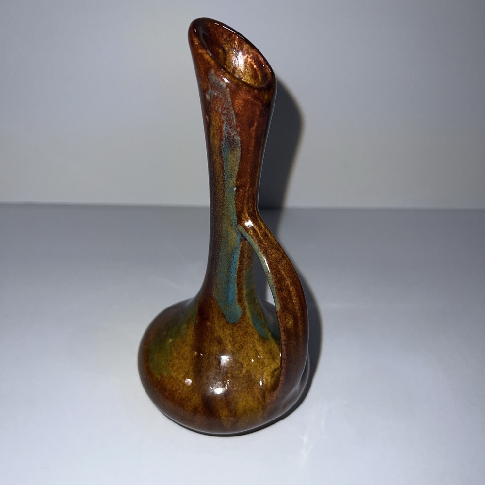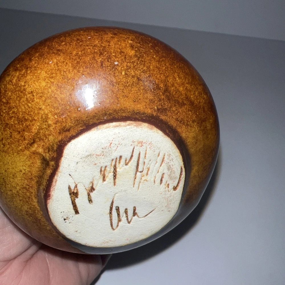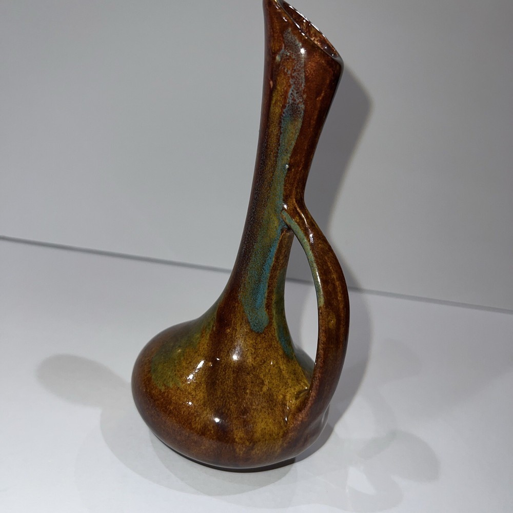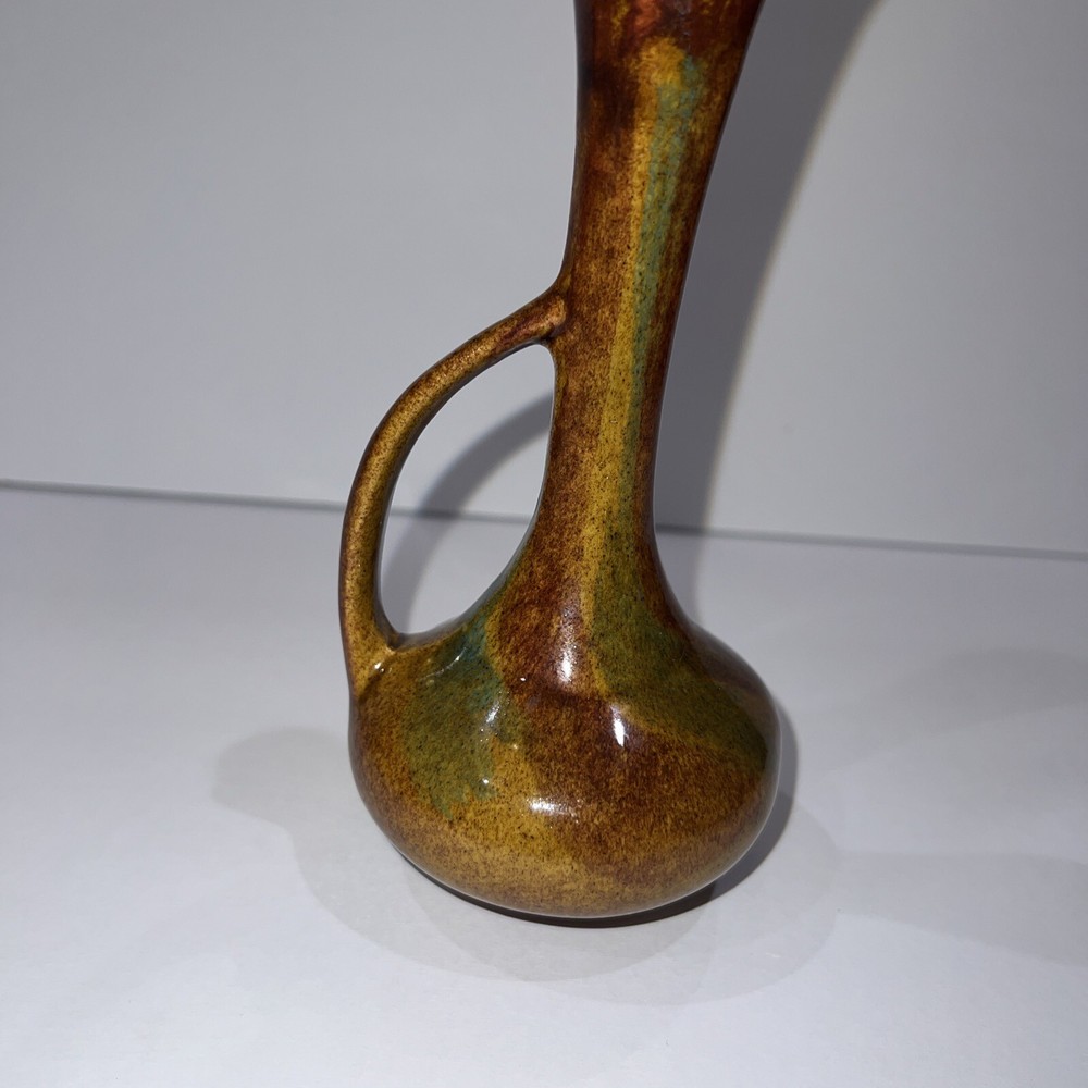 This vintage mid-century modern orange drip glaze pitcher vase is a beautiful addition to any collection. Handmade with ceramic material, it features a unique 1970s style with a glazed finish. The pitcher vase stands at 7.75 inches tall and has one compartment, making it perfect for serving drinks or displaying as a decorative piece. The item is sold in a set of one and is branded by the artist's signature. With its vibrant orange color and vintage charm, this pitcher vase is a must-have for any art or pottery enthusiast.