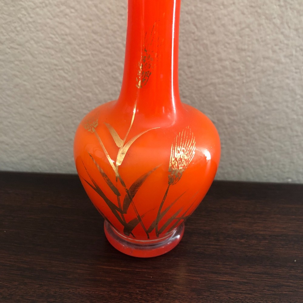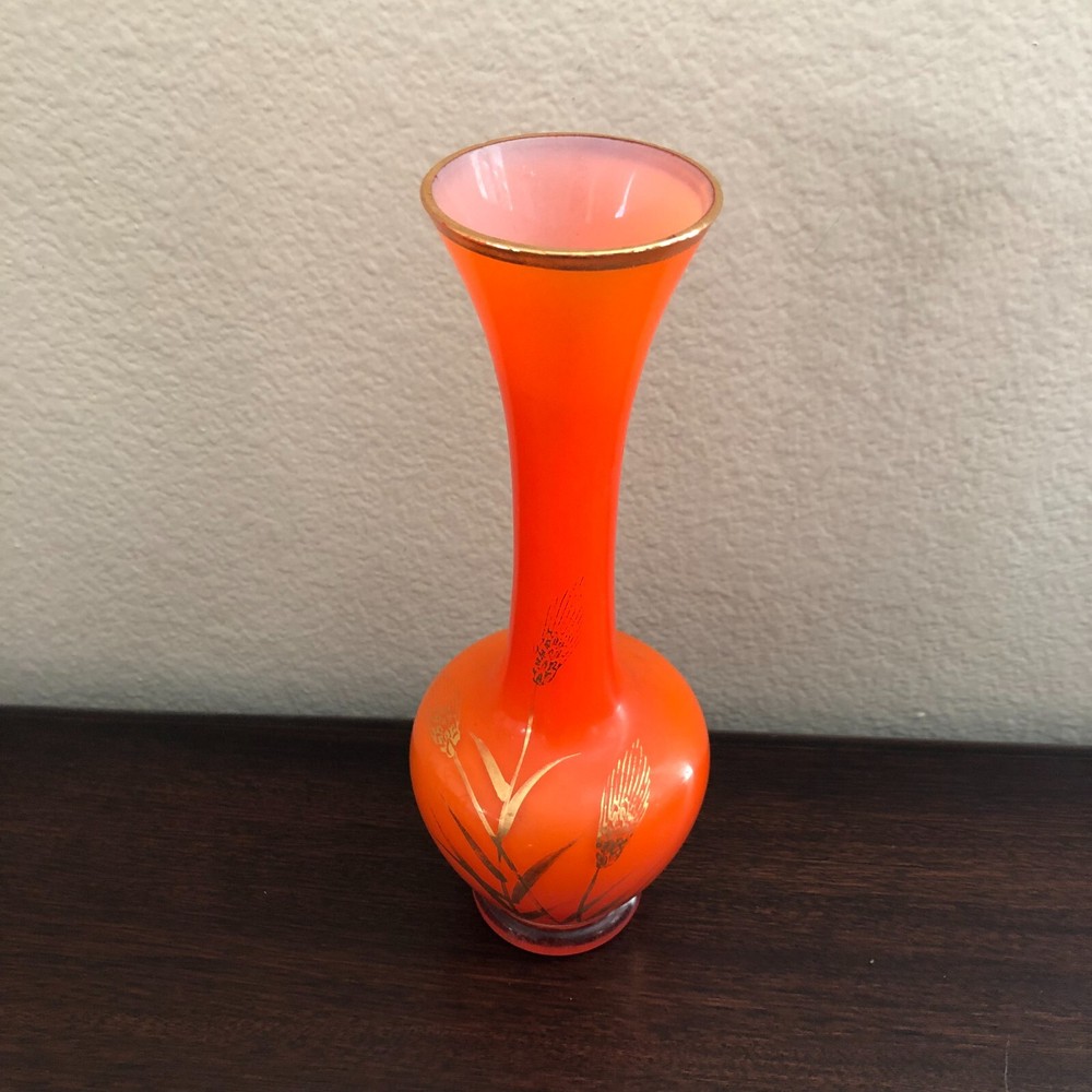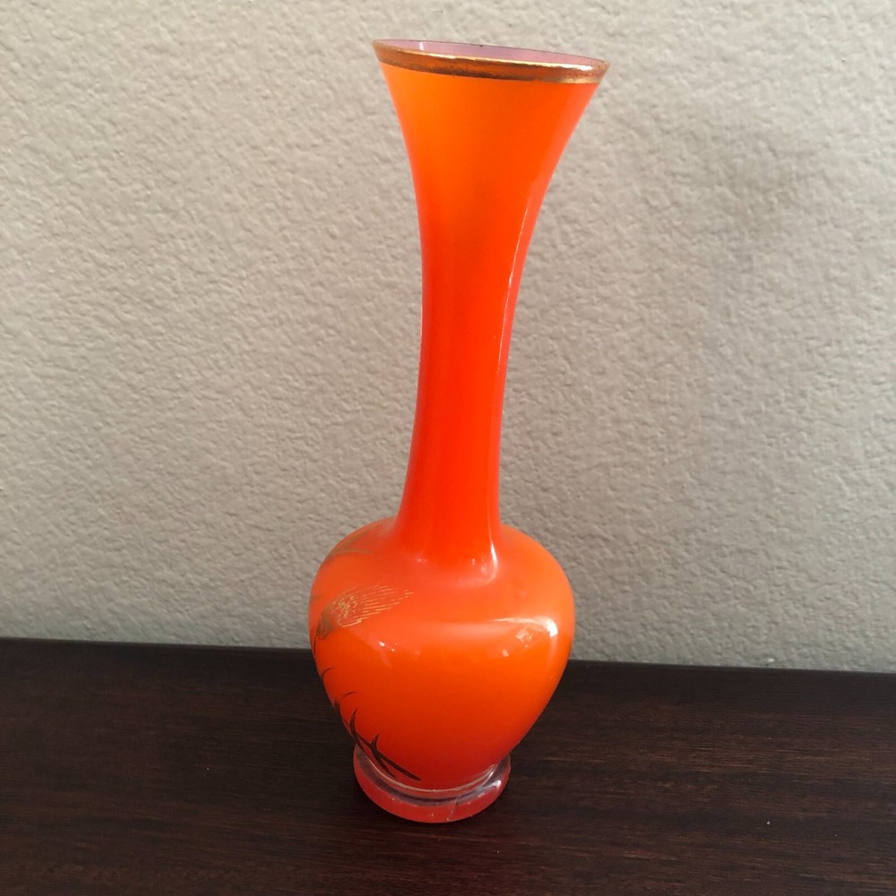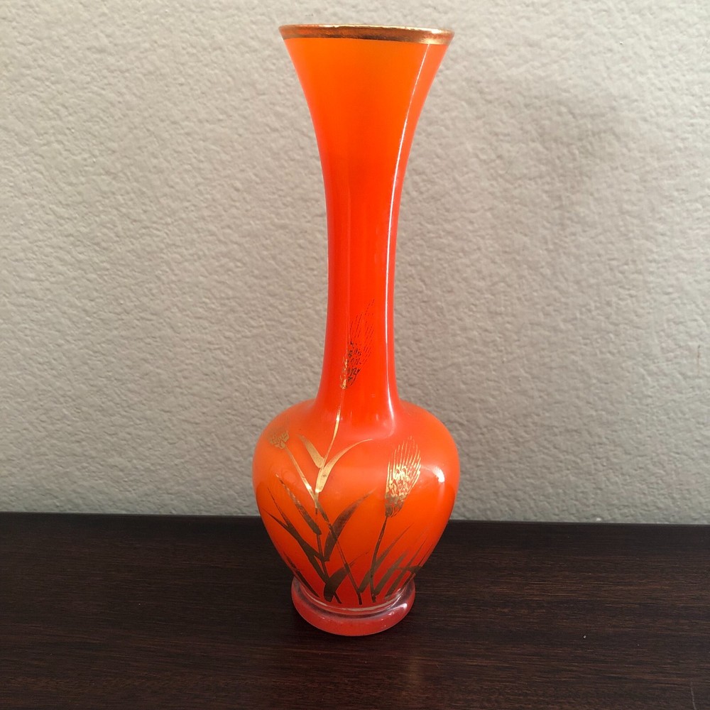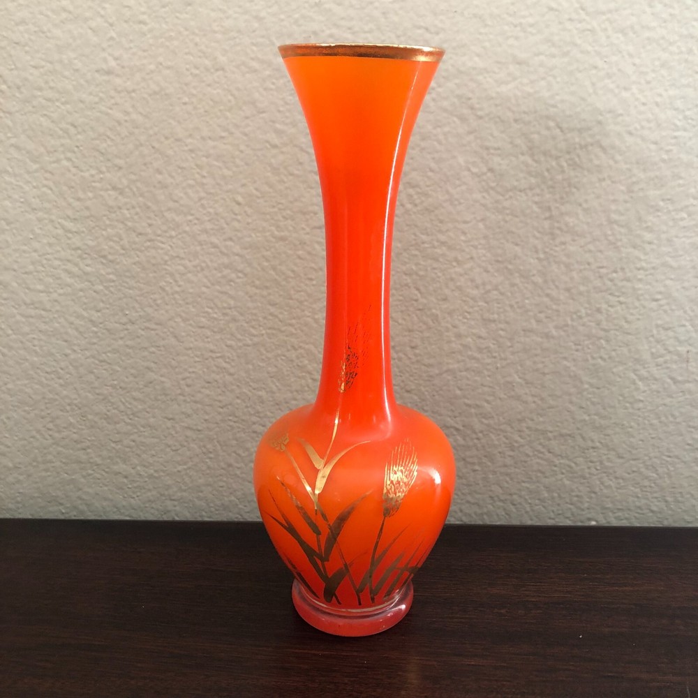 Vintage Mid Century Orange Art Glass Vase with Gold Detail...