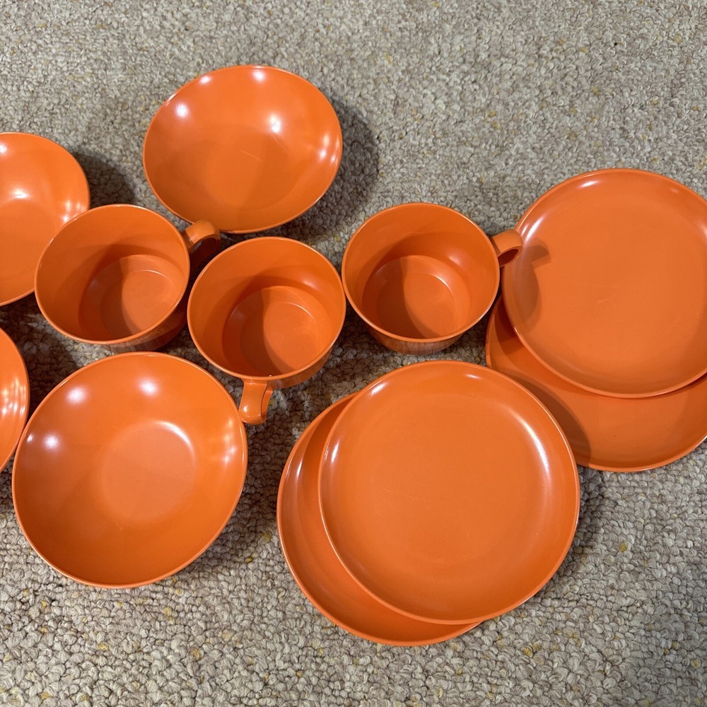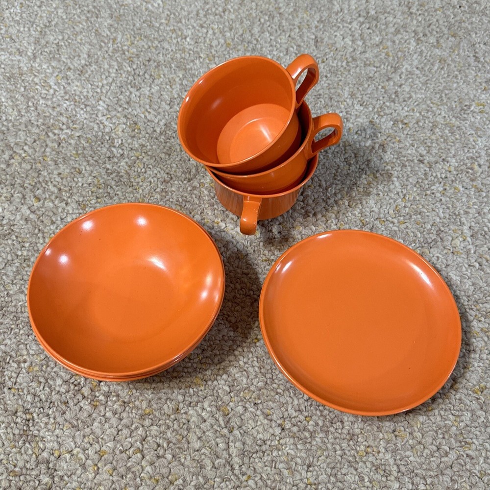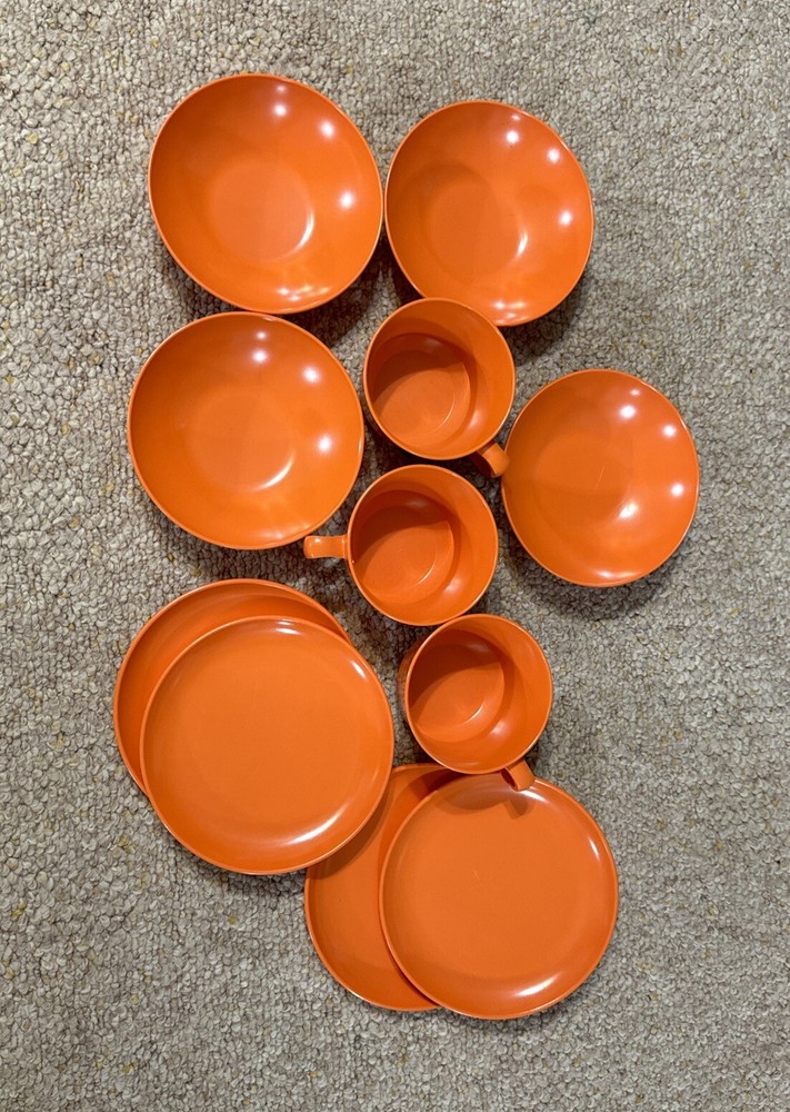 Add a splash of retro charm to your dinnerware collection with this set of 11 vintage mid century modern orange melamine melmac dishes. These dishes are perfect for serving your favorite meals with a touch of style and elegance. Crafted from high-quality materials, these dishes are durable and long-lasting, making them ideal for everyday use or special occasions. The toleware style of these dishes adds a unique and timeless appeal that is sure to impress your guests. Whether you're a collector or just looking for some fun and functional dinnerware, these dishes are the perfect addition to your kitchen. With their vibrant orange color and stylish design, they're sure to brighten up any table setting. There is 3 cups, 4 small bowls, and 4 small saucers.