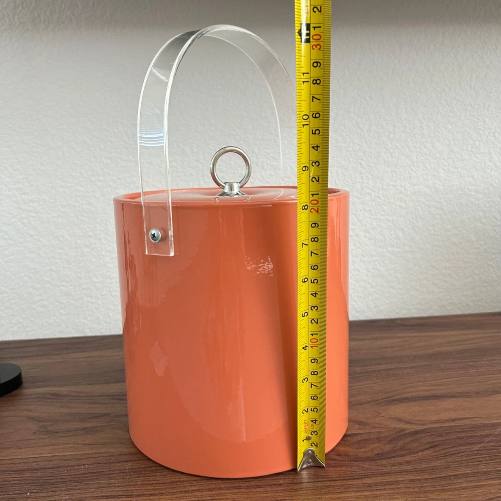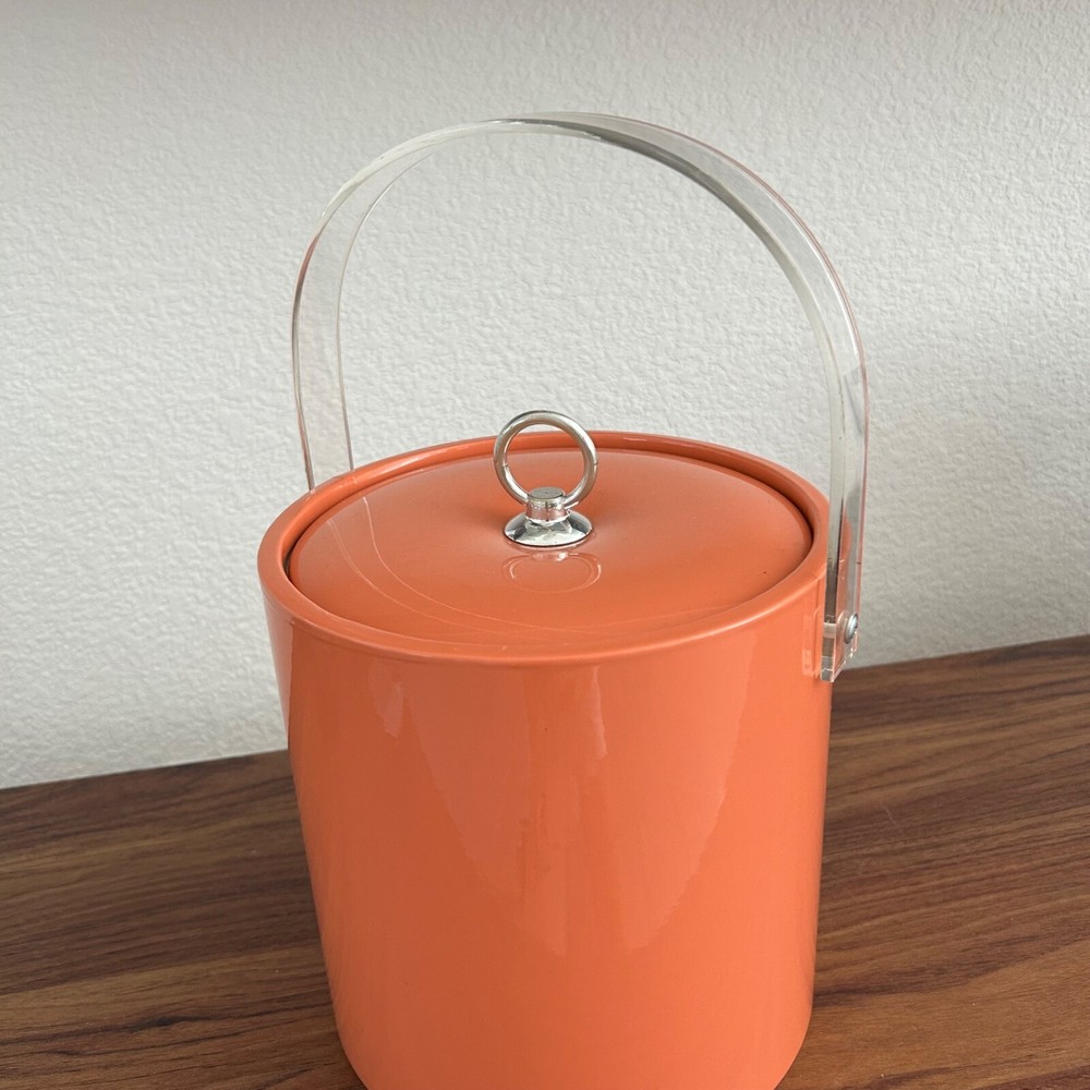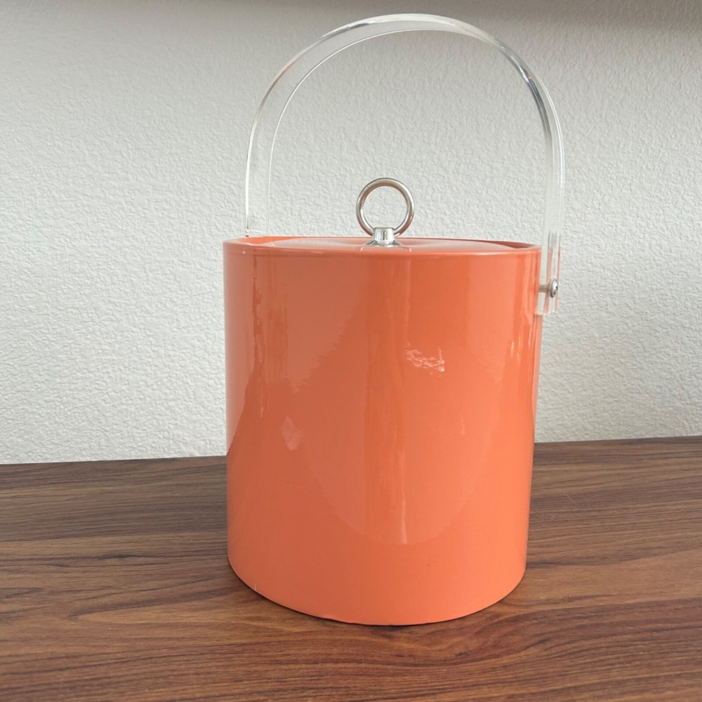 Vintage mid century salmon pink/ orange colored glossy vinyl ice bucket with clear lucite handle. It is perfect for keeping ice cold and drinks refreshing , making ir perfect for parties and gatherings. You can also use it to hide away knick knacks. Similar ice bucket goes for $120 online. #vintage #retro #icebucket #bar #mcm