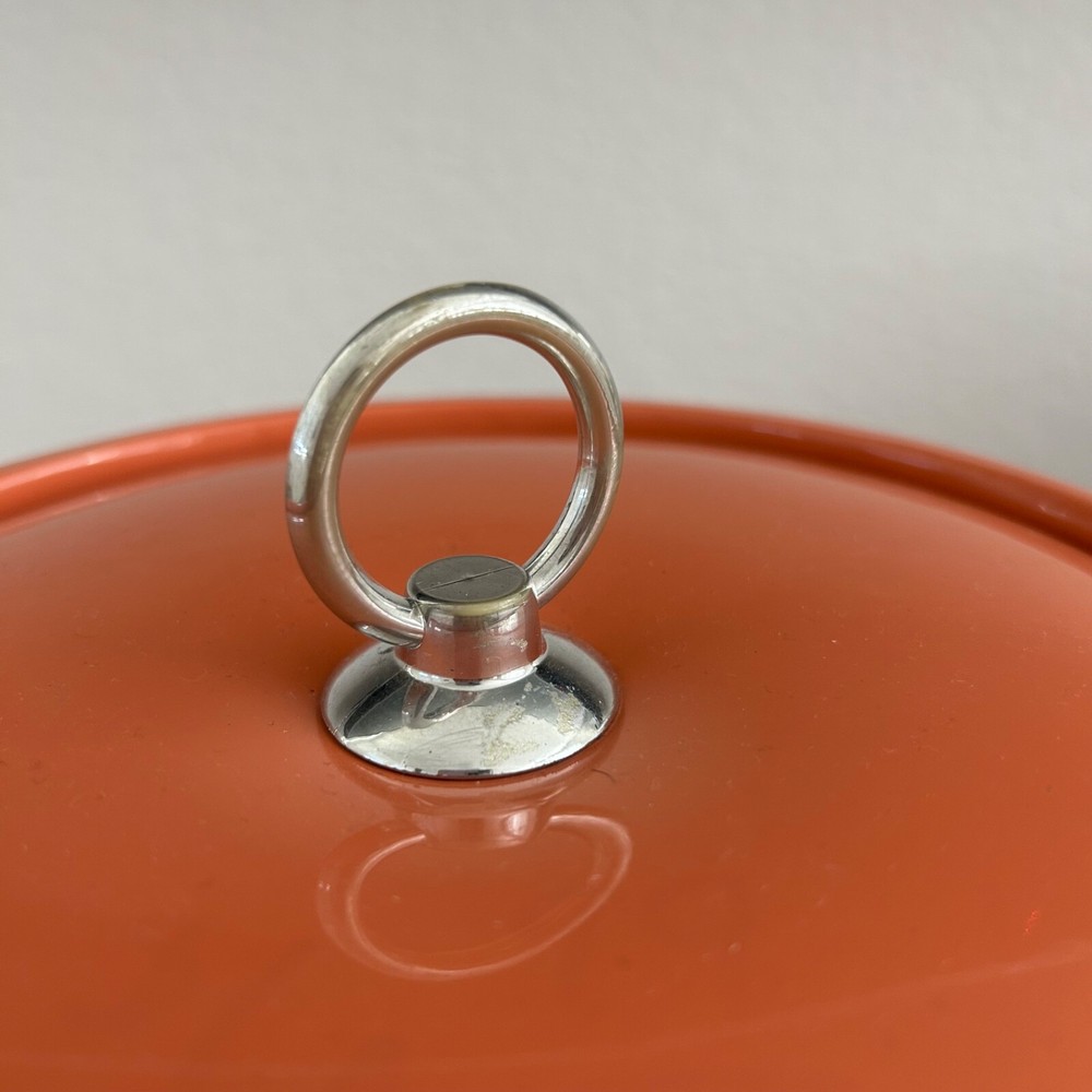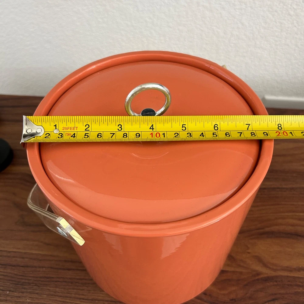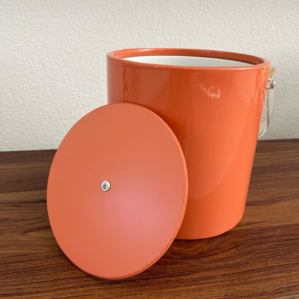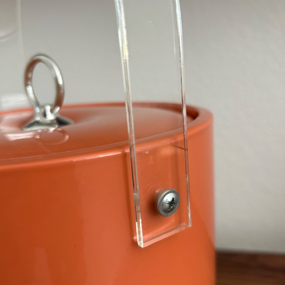 Vintage mid century salmon pink/ orange colored glossy vinyl ice bucket with clear lucite handle. It is perfect for keeping ice cold and drinks refreshing , making ir perfect for parties and gatherings. You can also use it to hide away knick knacks. Similar ice bucket goes for $120 online. #vintage #retro #icebucket #bar #mcm