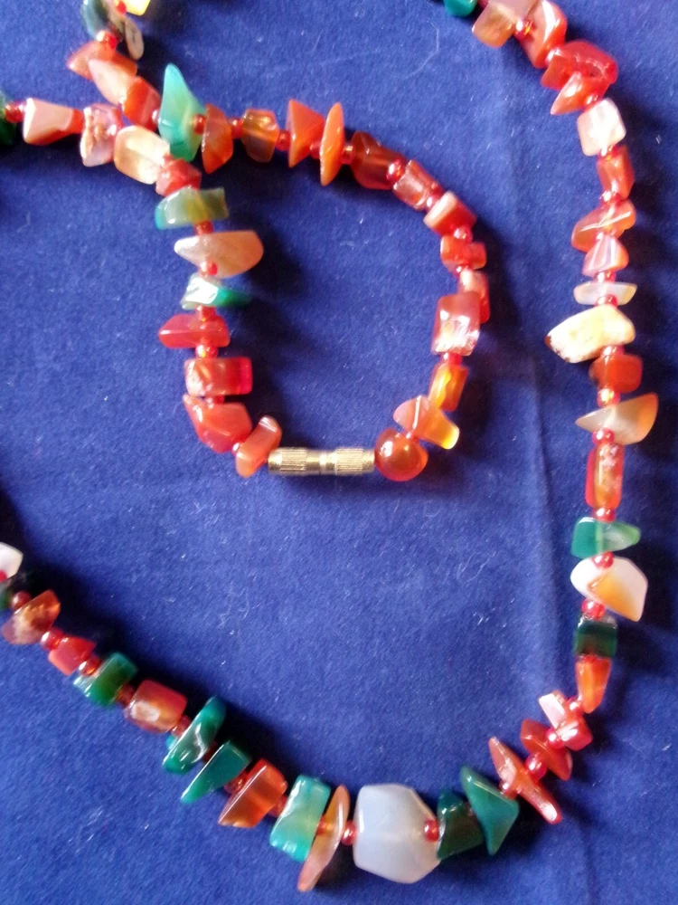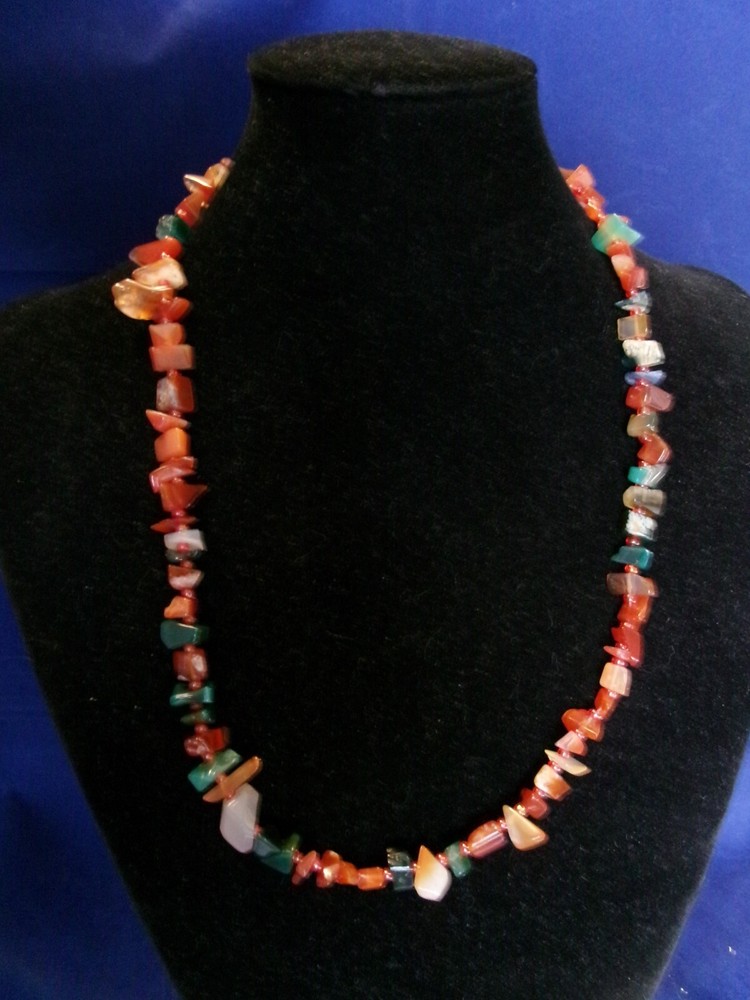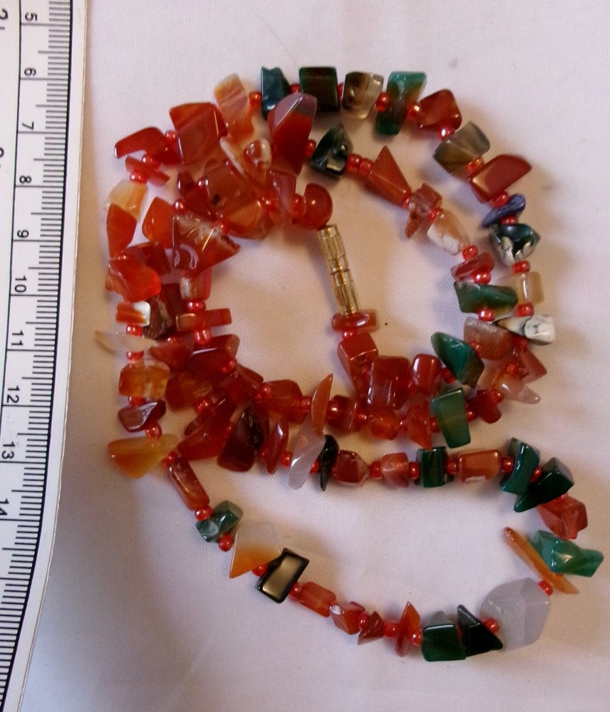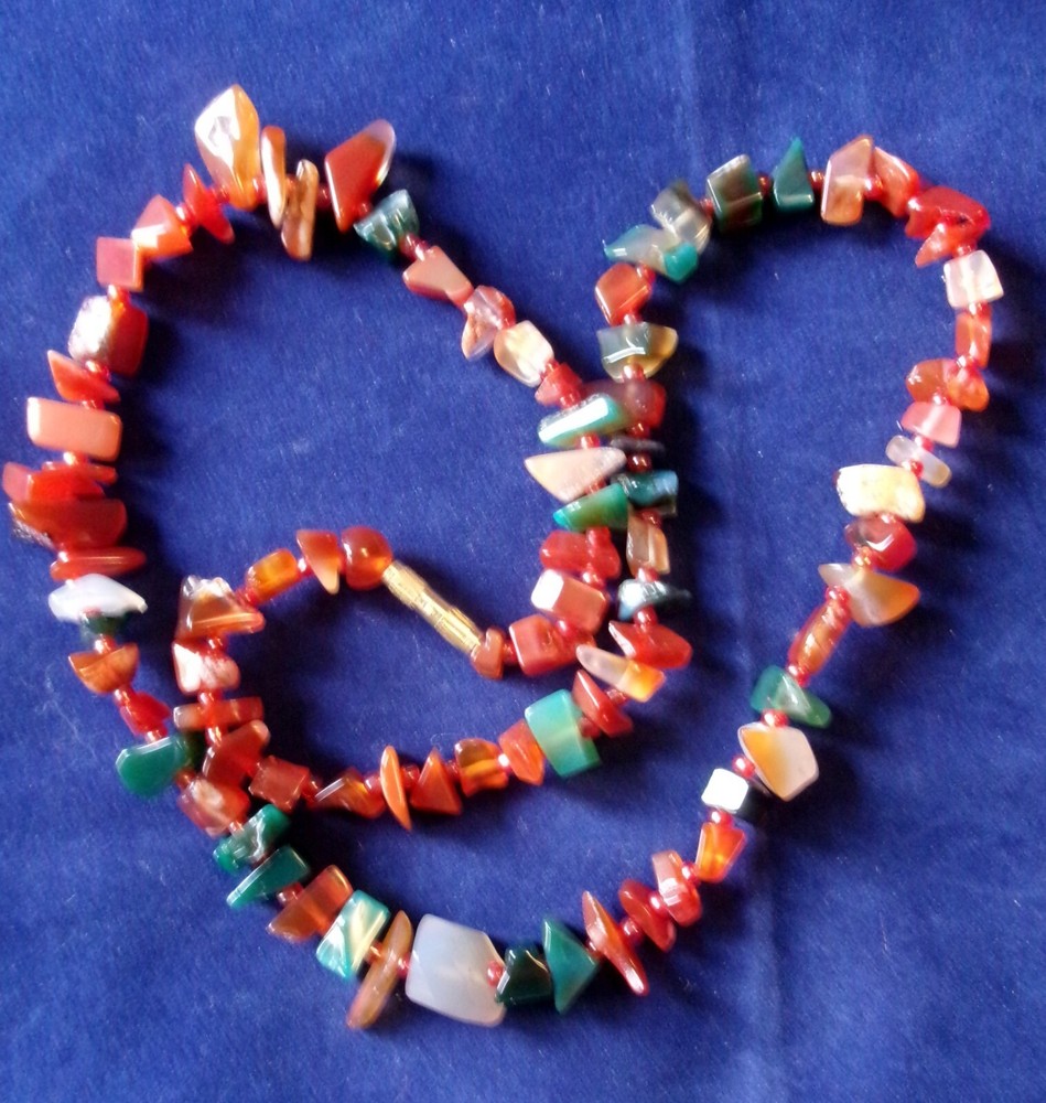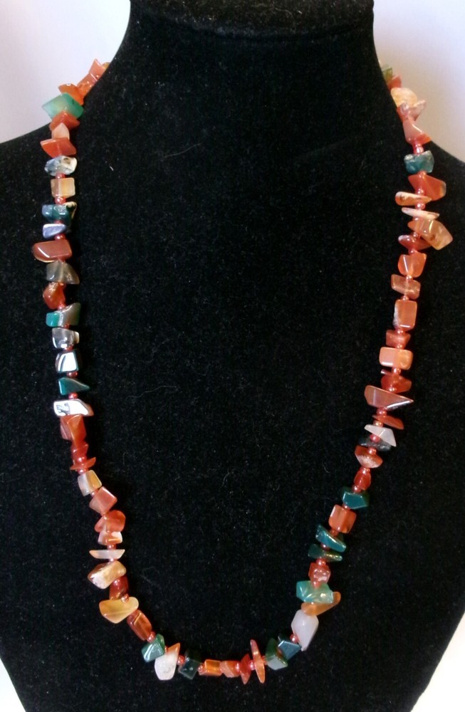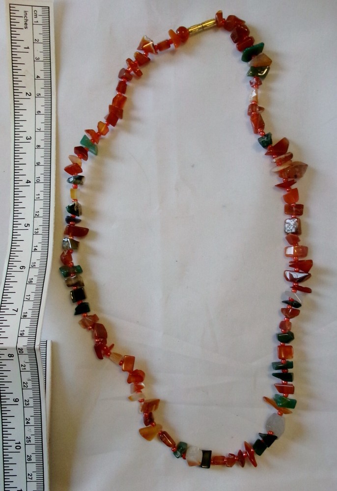 Description: Mid century 50s/60s orange and green agate necklace. Lovely retro piece. Size: Approx 58 cm / 23" long/round. weighs approx 50 grams. Condition: Very good clean condition. Please see photos. Postage: Can usually post next day, other than weekends, using Royal Mail tracked 48 hour service with proof of postage.