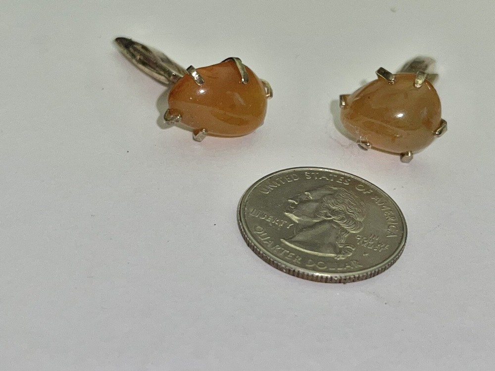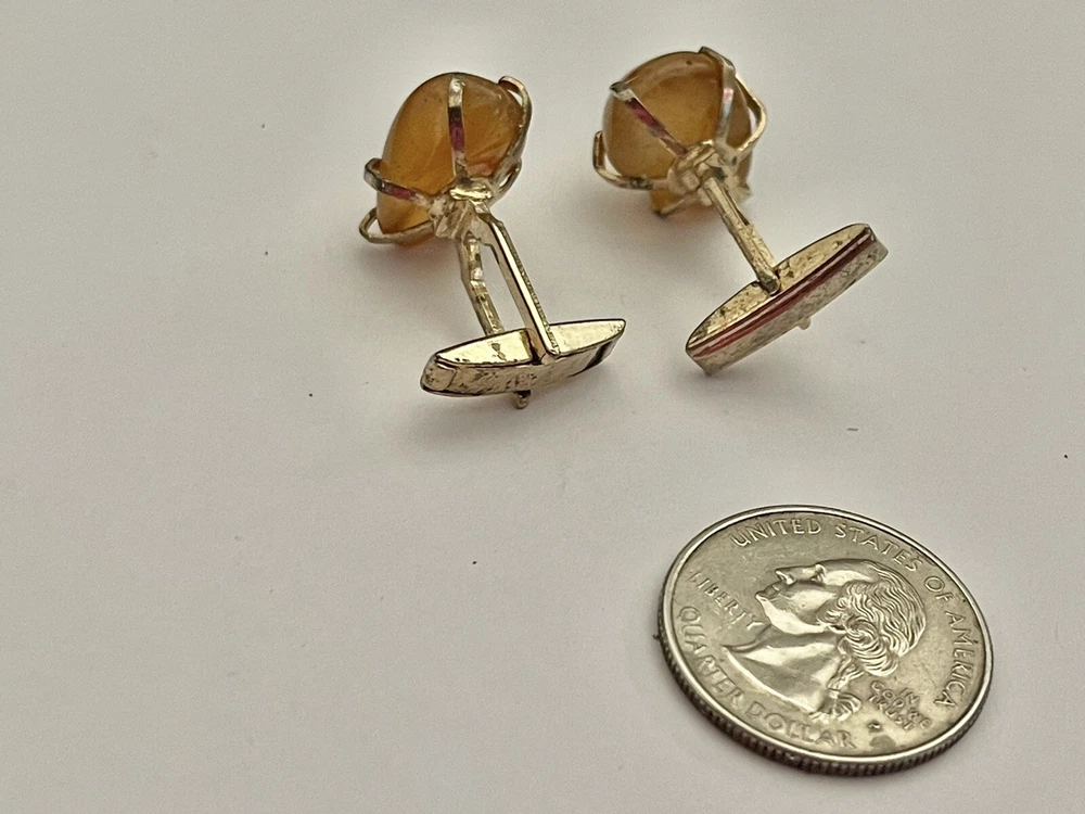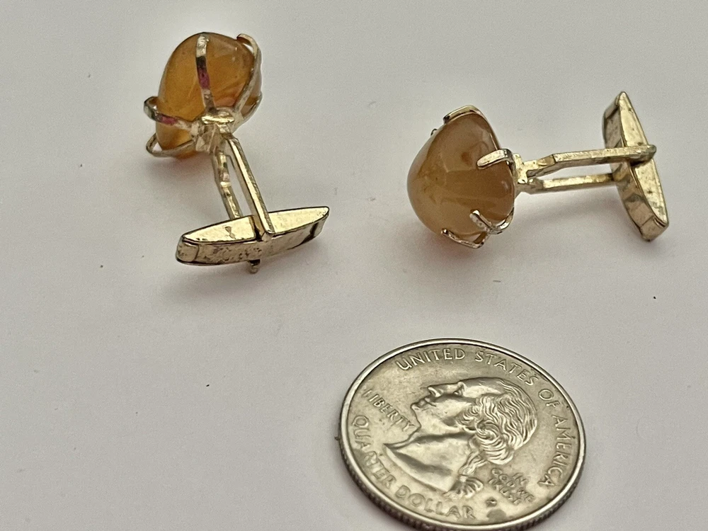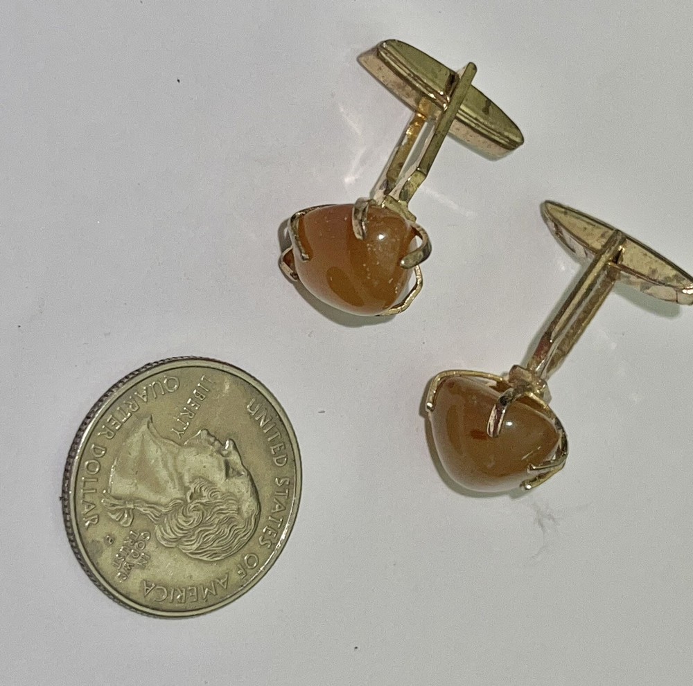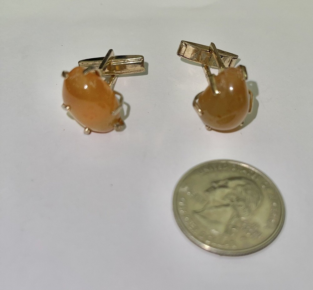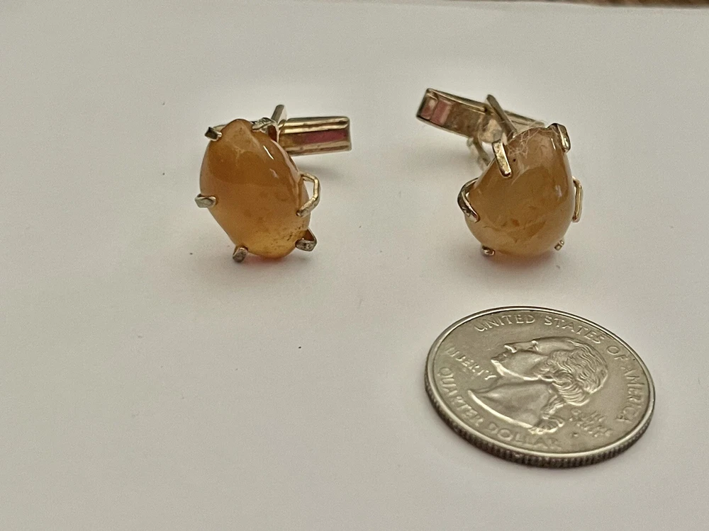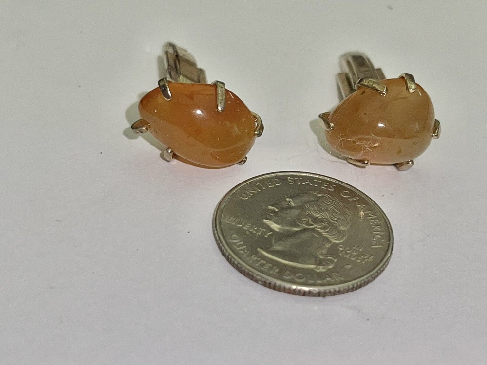 This auction is for a pair of Vintage Mid Century Orange Amber Stones Cufflinks….each amber bead is not an exact match ….measures approx 1/4” long and 5/8” wide….Approx 1 1/4” when back is open…..unmarked….in preloved condition ...please see my photos as they are part of my description….. I have other jewelry on ebay and I happily combine shipping ..... Questions - please email me before auction ends. Winning bidder to pay shipping and handling.... International buyers will pay at a different rate, see below ....Payment is due within 24 hours of auctions end .......THESE TERMS ARE NOT NEGOTIABLE AFTER AUCTION ENDS..... International Buyers – Please Note: * Import duties, taxes and charges are not included in the item price or shipping charges. These charges are the buyer's responsibility. * Please check with your country's customs office to determine what these additional costs will be prior to bidding/buying. * These charges are normally collected by the delivering freight (shipping) company or when you pick the item up – do not confuse them for additional shipping charges. * We do not mark merchandise values below value or mark items as "gifts" - US and International government regulations prohibit such behavior. OTHER IMPORTANT INFORMATION Most of the items I offer are bought on the secondary market and therefore I do not know the history behind them. I strive to purchase and sell only quality items and once they come to my home they are stored in a clean, smoke-free environment. I will do my best to describe each item, pointing out any missing items, minor flaws, etc. however, being only human - there may be an occasion when something has been overlooked. It is never my intention to deliberately withhold information or misrepresent the item in anyway. Please keep in mind these items have been previously owned and are not new. Please review the description and the pictures carefully and if I can answer any questions or provide you with additional photos please do not hesitate to e-mail me before bidding