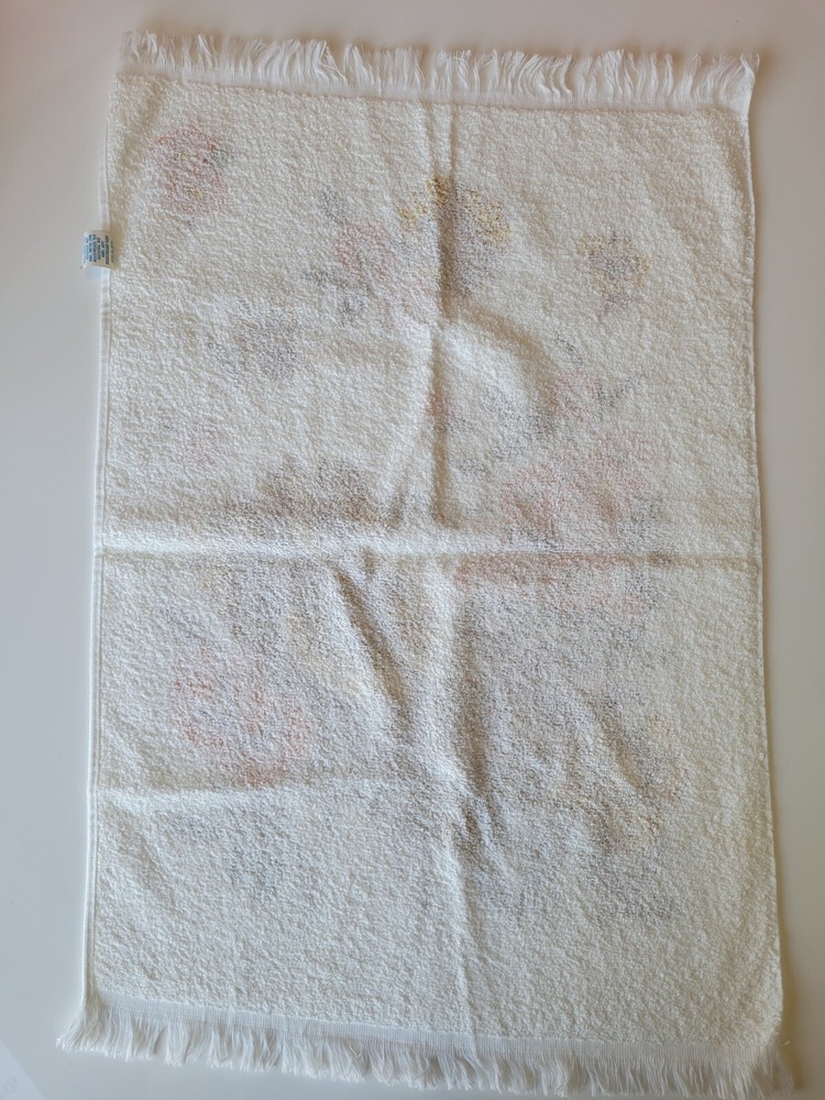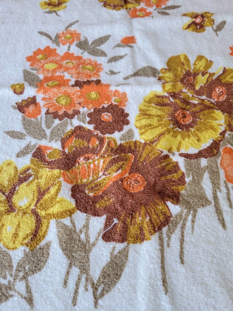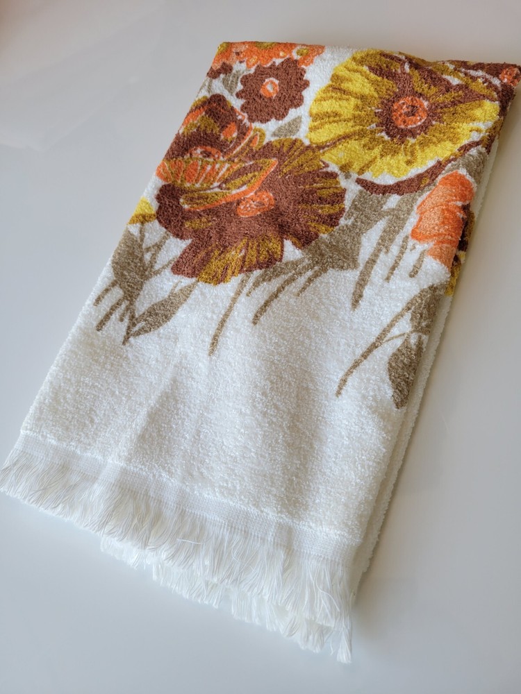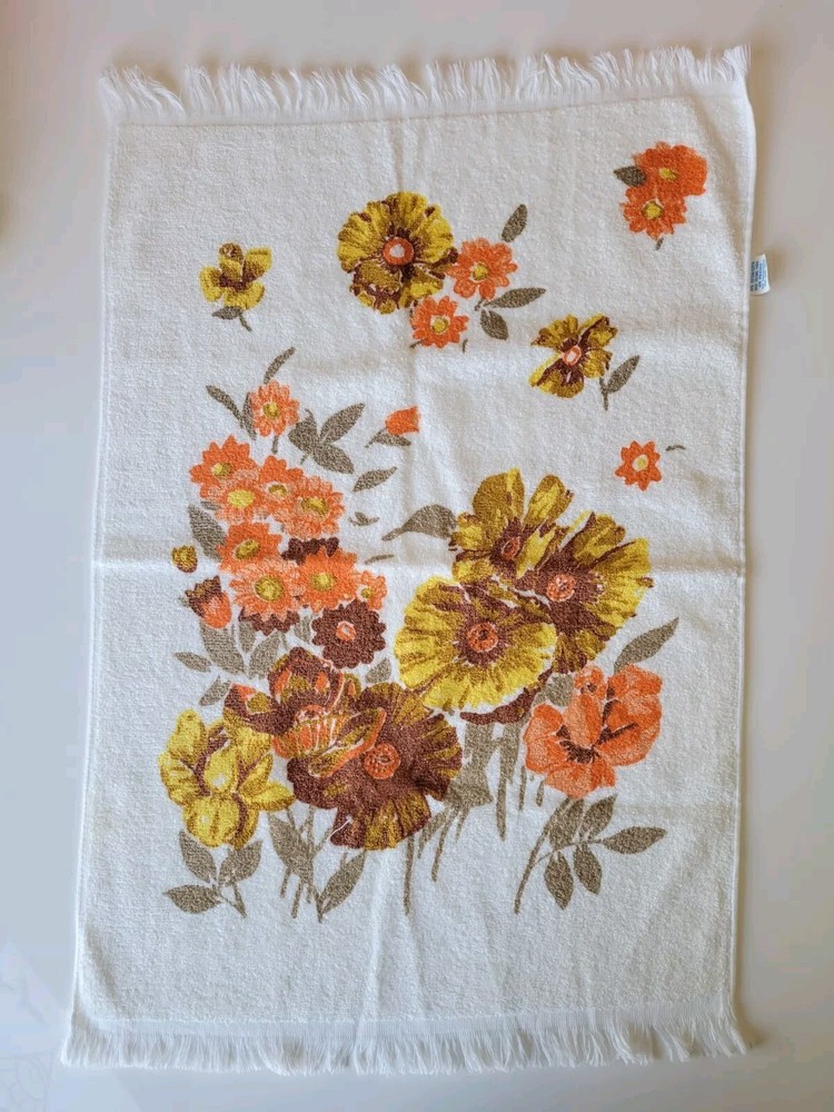 Vintage Retro Hand Towel possibly from Woolworths Made in the USA 100% Cotton Loop yarn Towel is in excellent condition looks unused If you notice in photos stitches seem crooked 23" x 16" Orange Yellow and brown floral design on white towel with fringe If you have any questions please ask! Be sure to check my other vintage towel listings! Keywords Vintage Retro Mid Century Antique Towel Linen Hand Towel Cannon Monticello Riegel St Marys Martex Granny chic Grandma core Cottage core Country Primitive Orange and yellow Flower power Housewarming Home Hosting Bathroom Kitchen Sink