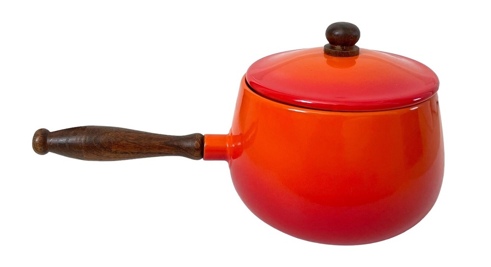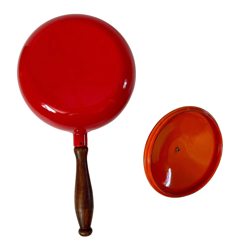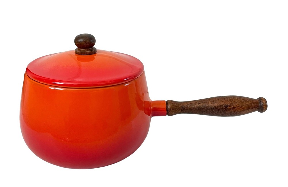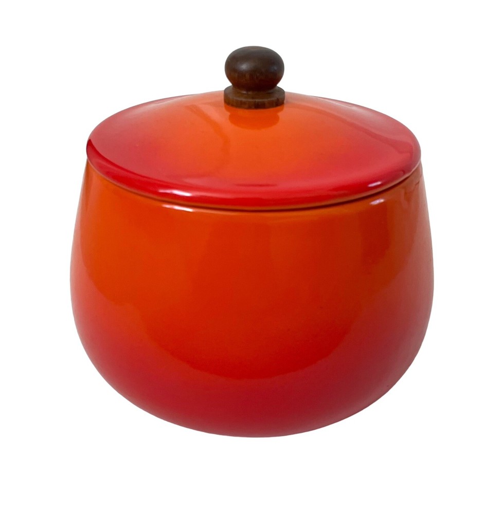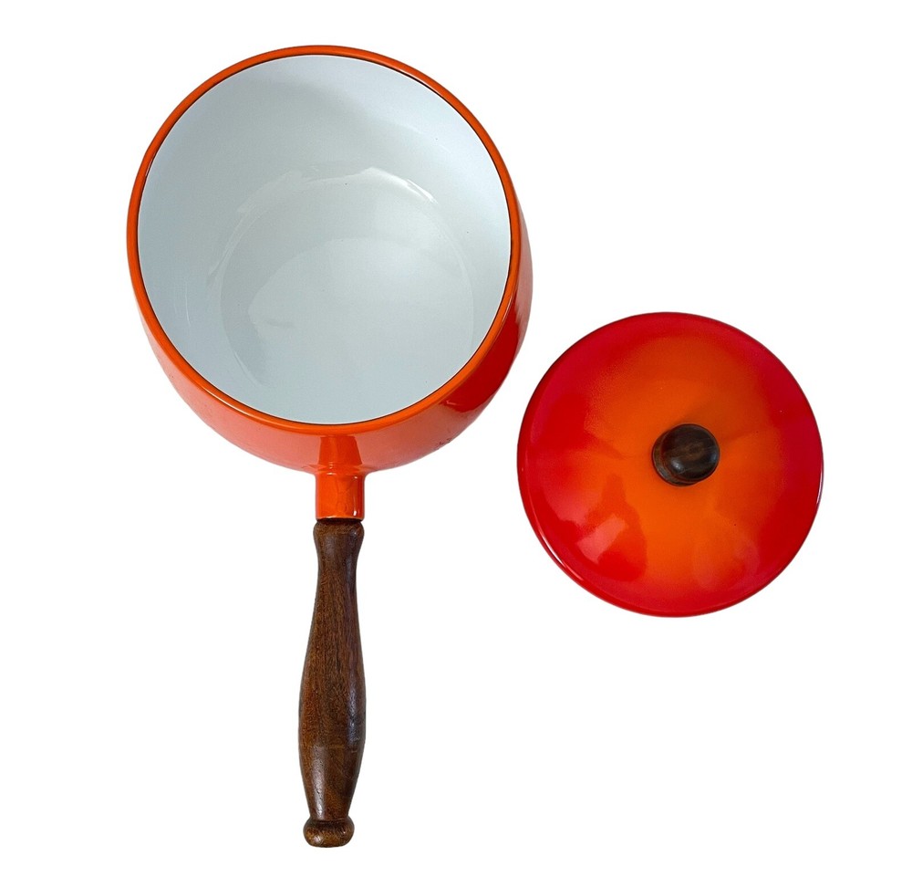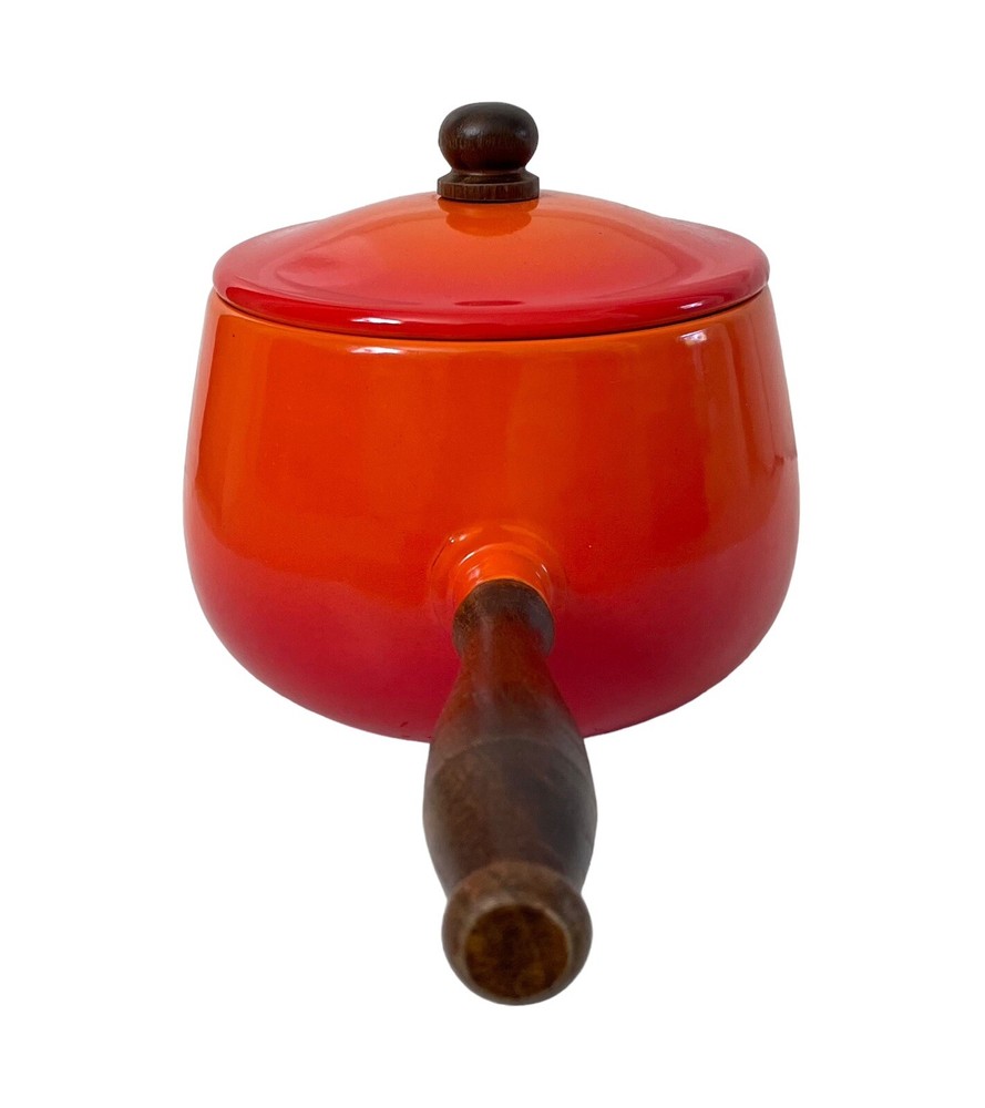 This vintage mid century fondue pot/saucepan is a gorgeous addition to any kitchen. The orange enamel and wood exterior make it a unique and stylish piece. Measuring 5.5" in height and diameter, and 12" in width, it is the perfect size for fondue, sauces and soups. This piece is in such good condition. No chips or cracks. No stains. It looks Danish, but it’s not marked and I could not find an exact duplicate online.
