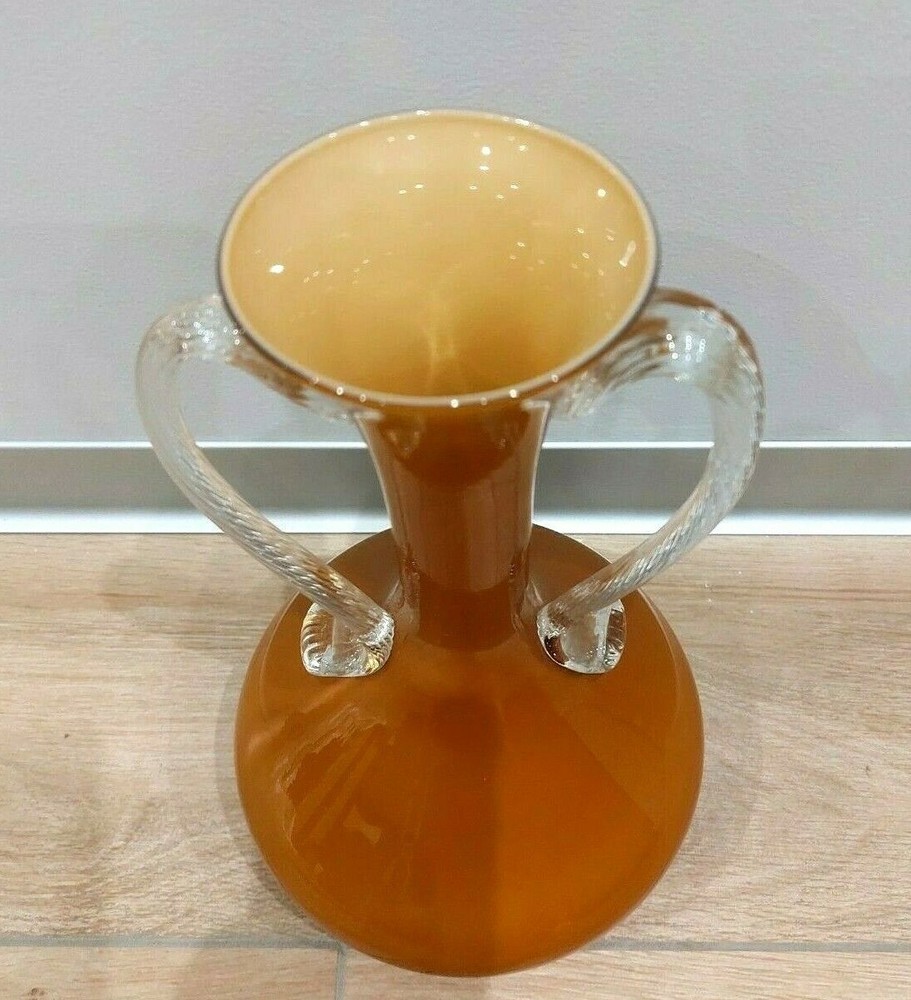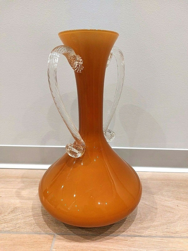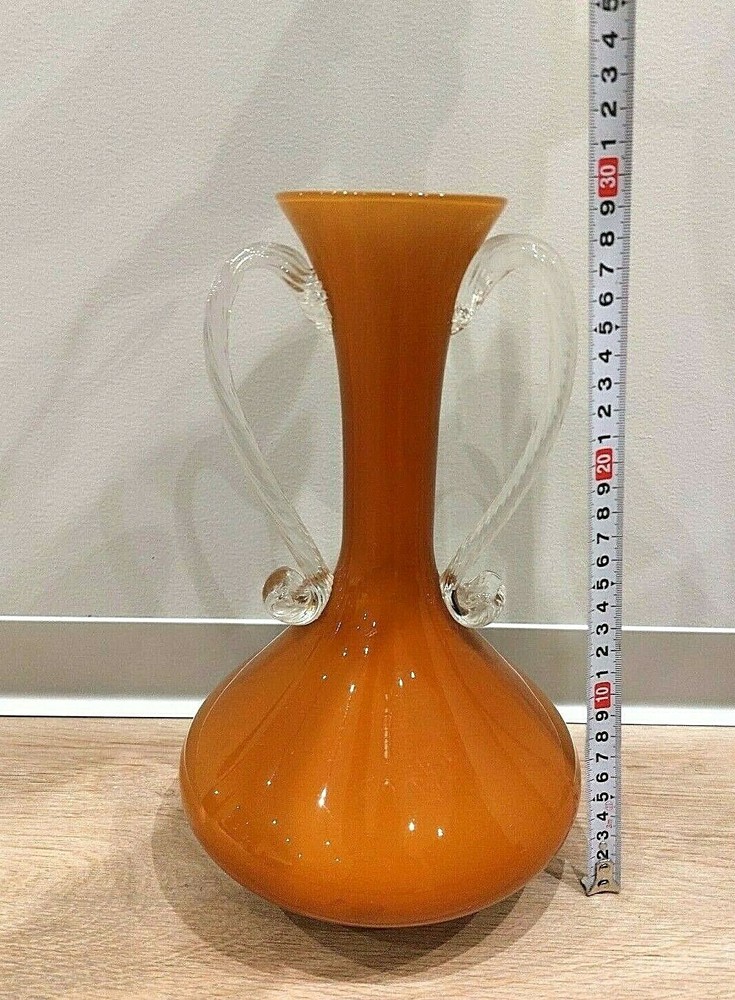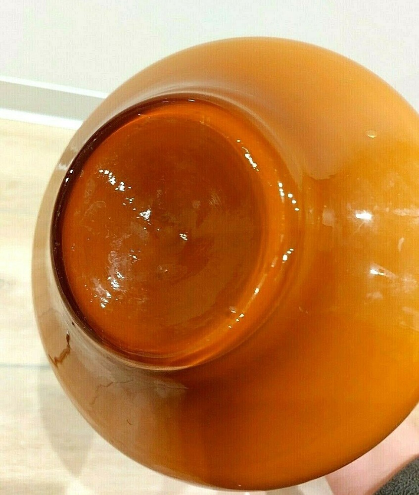 We sell wonderful Orange glass vase. This item is in good used condition. There is no chips or cracks. Nice orange mid-century color will be great addition for any interior. For size ( in CM ) and condition please see photos. Good Luck!!!