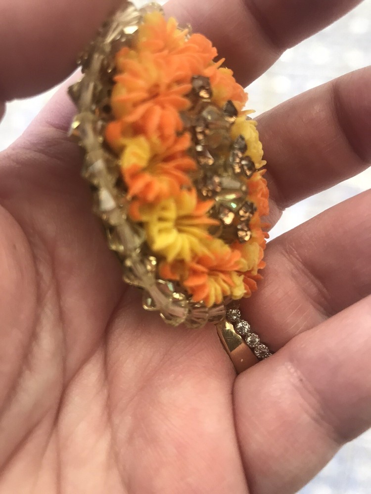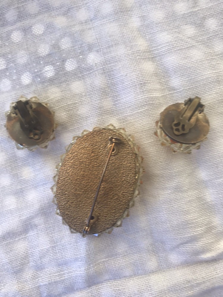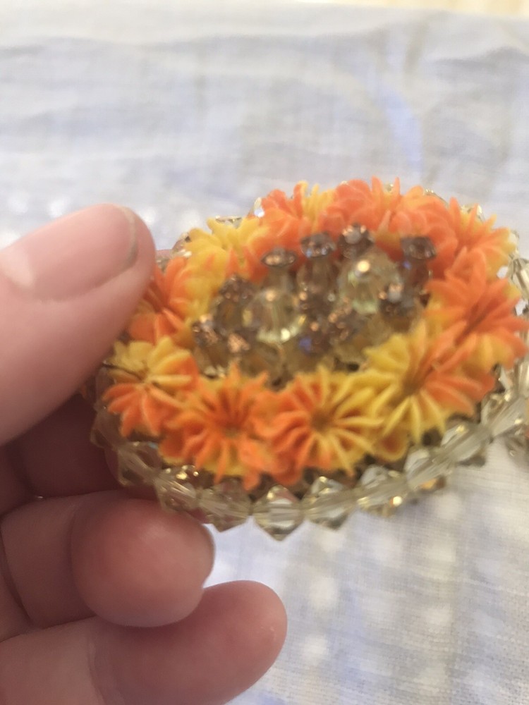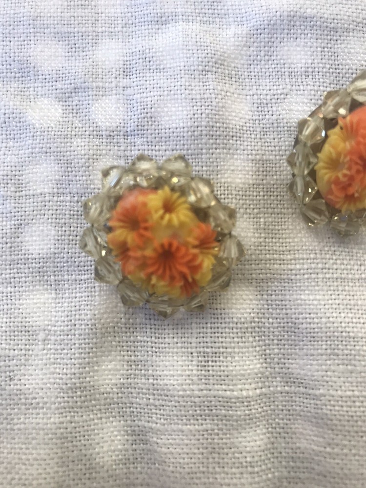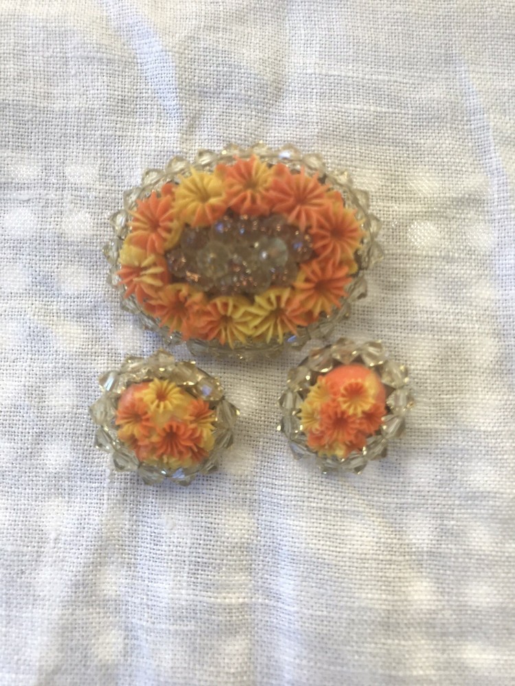 Here is a very interesting set. Made of a mixture of orange plastic flowers and yellow crystal beads. The pin measures about 2" across and the clip-ons are about 1" across. The metal is a bit discolored on the earrings but the stones are sparkly and in great condition. I accept credit cards through Paypal. Buyer pays shipping and delivery confirmation. I ship USPS priority mail or first class. I have a day job in a hospital, so I generally ship the Saturday after I receive payment. Foreign buyers contact me for shipping quotes. I must hear from you within 3 days of the auction closing so that I know how you’ll be sending payment. Payment must be received within 7 days or item will be relisted. Your money will be cheerfully refunded if the item is not as described. No refunds for any other reason. Buyer pays return shipping. Your winnings will be shipped the Saturday after payment is received